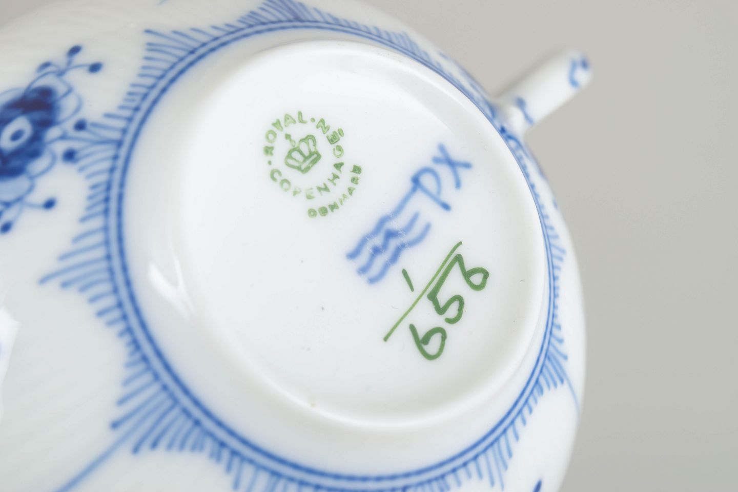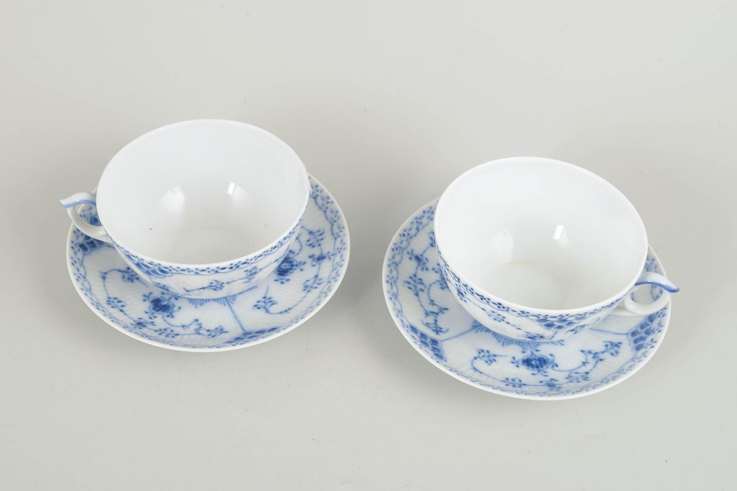Tekopper i halvblonde, håndmalet porcelæn. De klassiske blå dekorationer og den rummelige tekopform gør modellen til en populær del af stellet. Én kop i tredje sortering, mens de øvrige dele er 1. sortering.