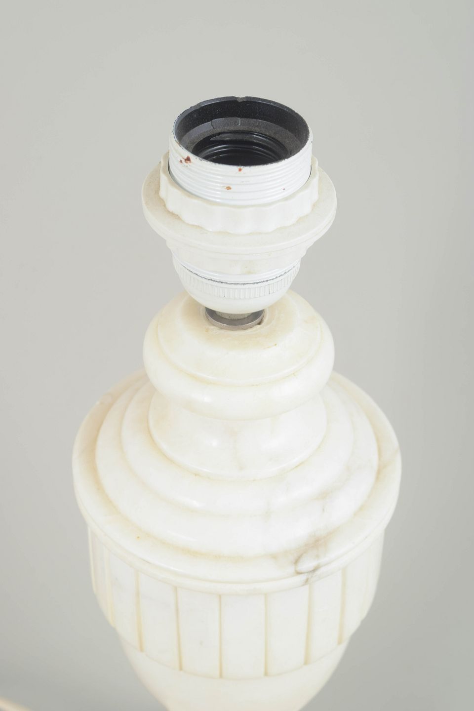 Italiensk Marmor Bordlampe, 1970’erne.Klassisk formet bordlampe i hvid marmor med tydeligt profileret topstykke og vertikale riller på midterpartiet. Den enkle balusterform og den kvadratiske fod giver lampen et harmonisk og tidløst udtryk.