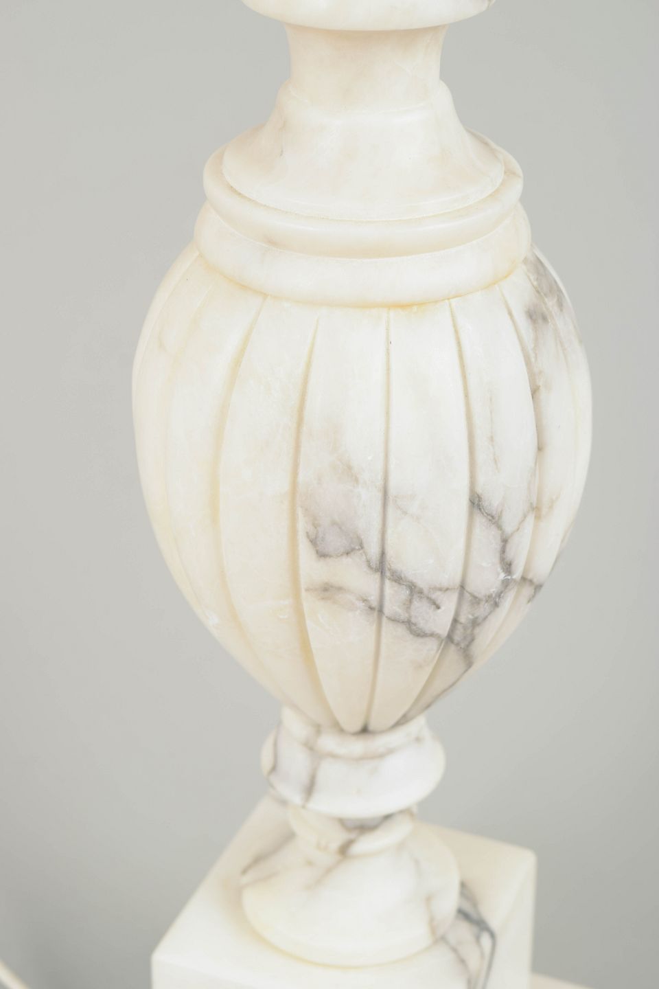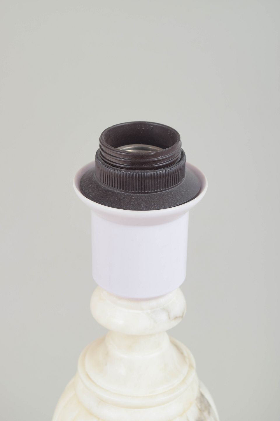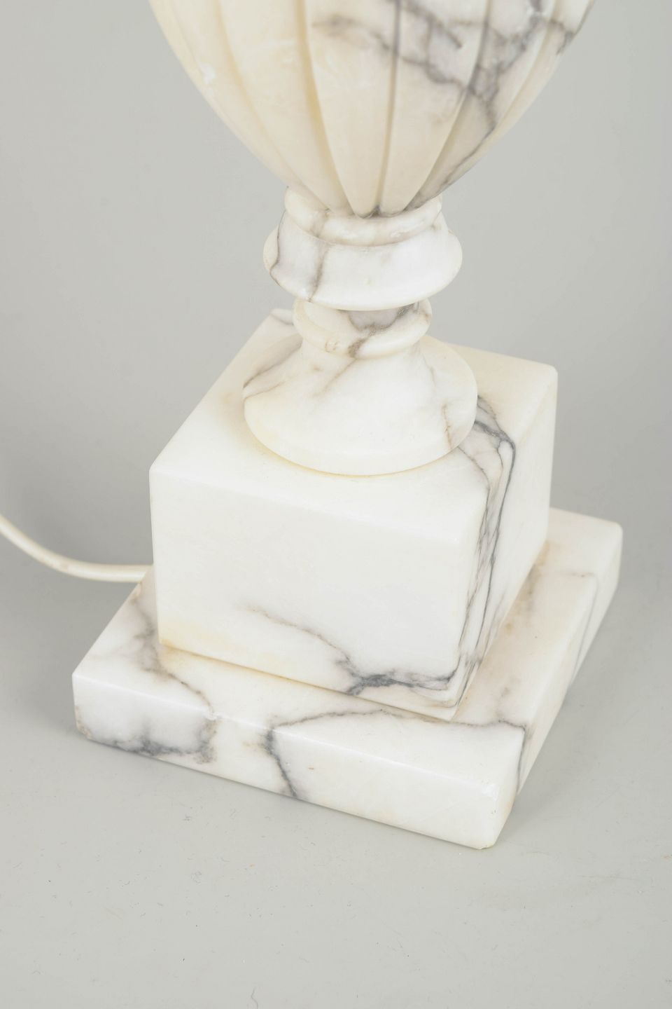 Italiensk Marmor Bordlampe, 1970’erne.Elegant bordlampe udført i hvid marmor med markant årestruktur og klassisk balusterformet midterstykke. Den profilerede fod og de bløde, vertikale facetter giver lampen et raffineret og dekorativt udtryk.