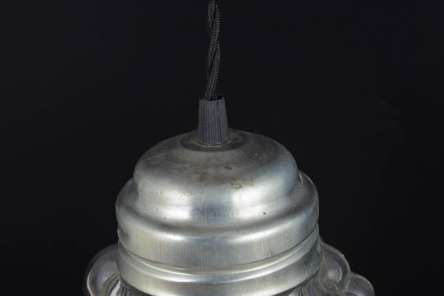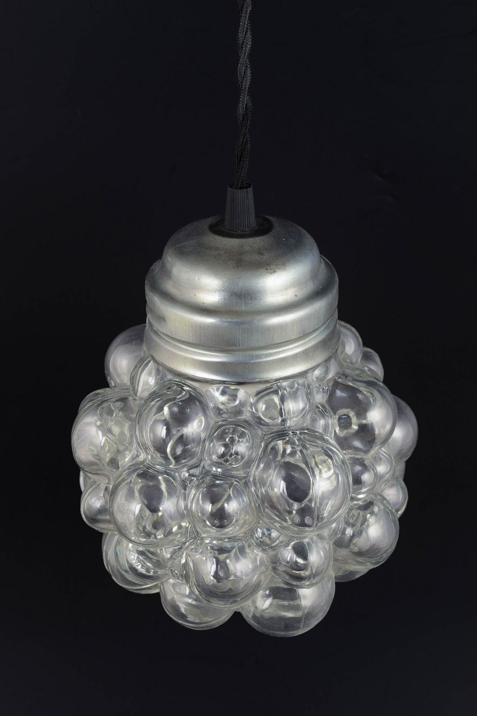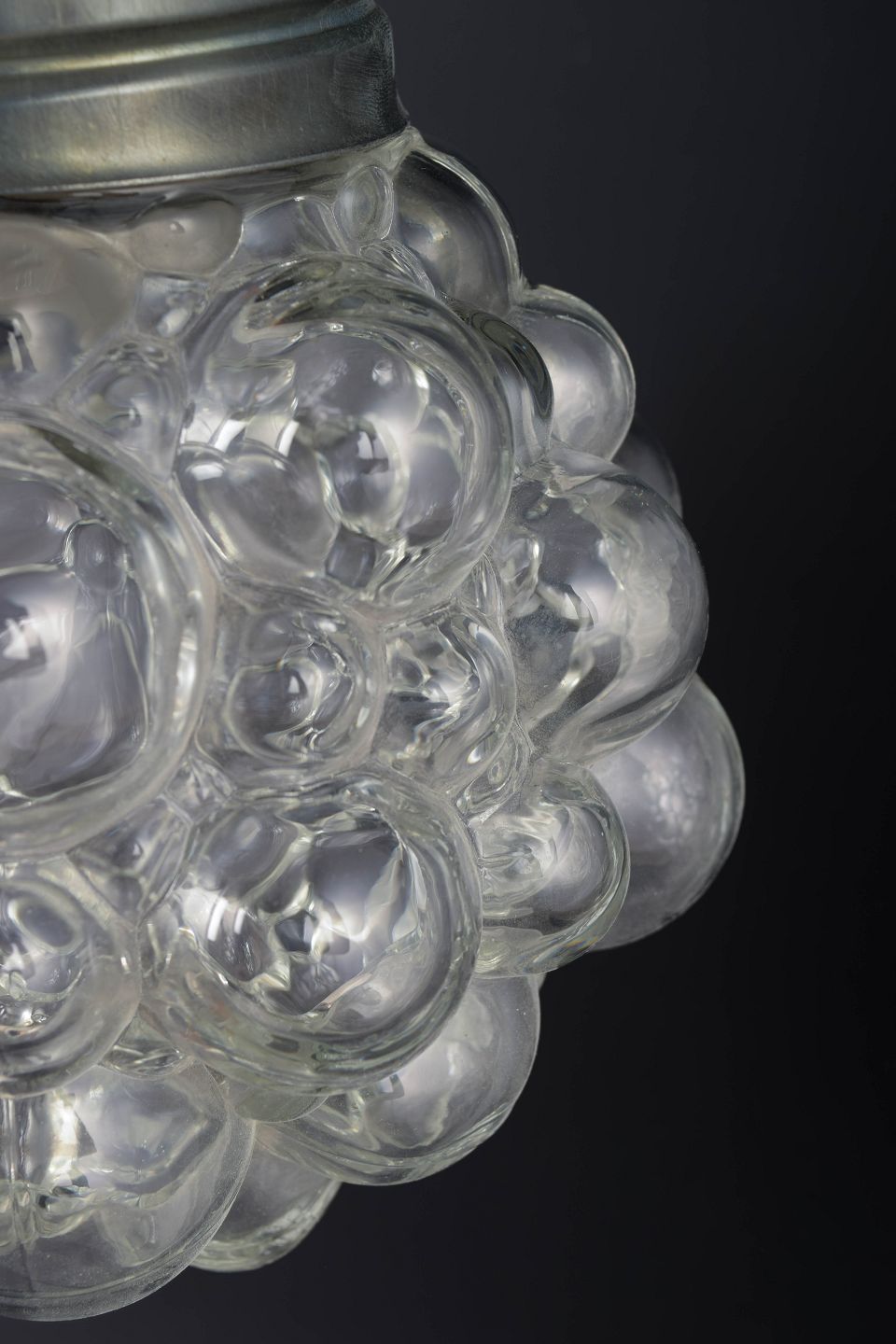 Klassisk pendel med den ikoniske bobleglas-kuppel bestående af klare, runde glasbobler, der skaber et levende lys- og skyggespil. Monteret med metalfatning i original stil. Et af Tynells mest kendte og elskede designs fra perioden.
