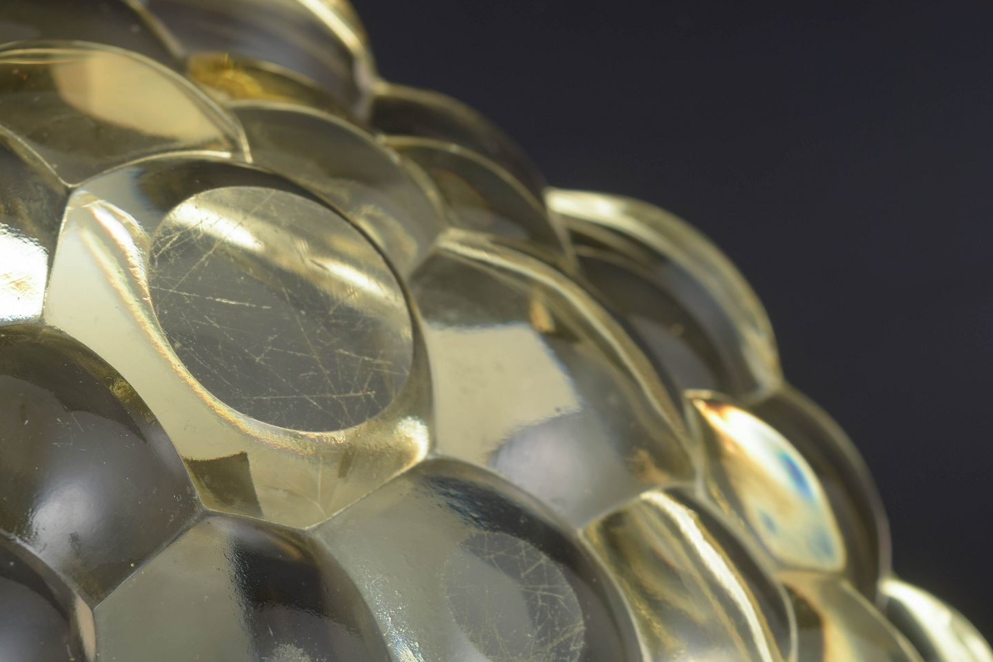 Sjælden gul skål i presset glas med typisk Art Deco-ornamentik og organiske, bølgede former omkring kanten. Pierre d’Avesn arbejdede med markante relieffer og klare geometriske strukturer, hvilket ses tydeligt i dette dekorative og eftertragtede eksempel.