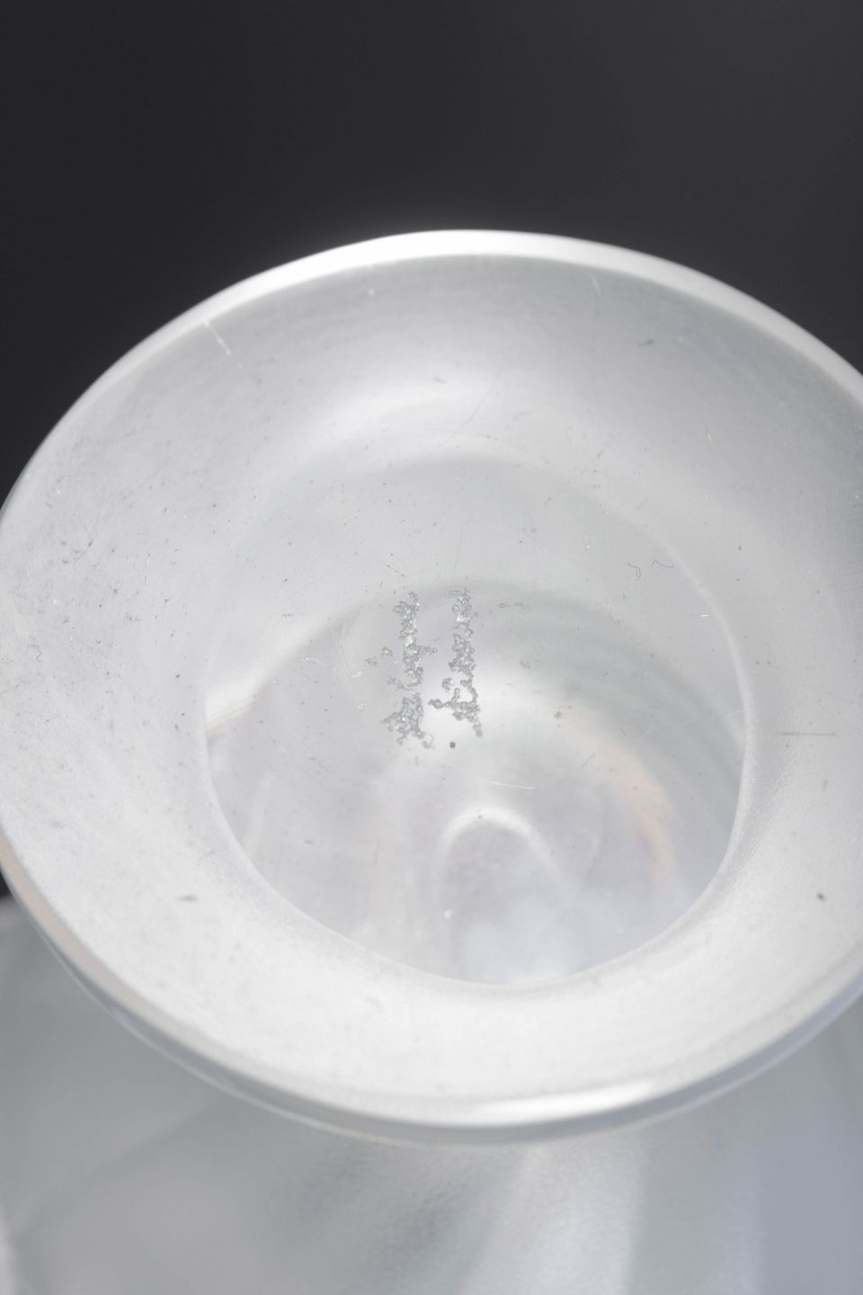 Frostet krystalvase med relief af to svævende svaler, et klassisk motiv i Lalique-traditionen. Den matte overflade og organiske form skaber et elegant lys- og skyggespil.