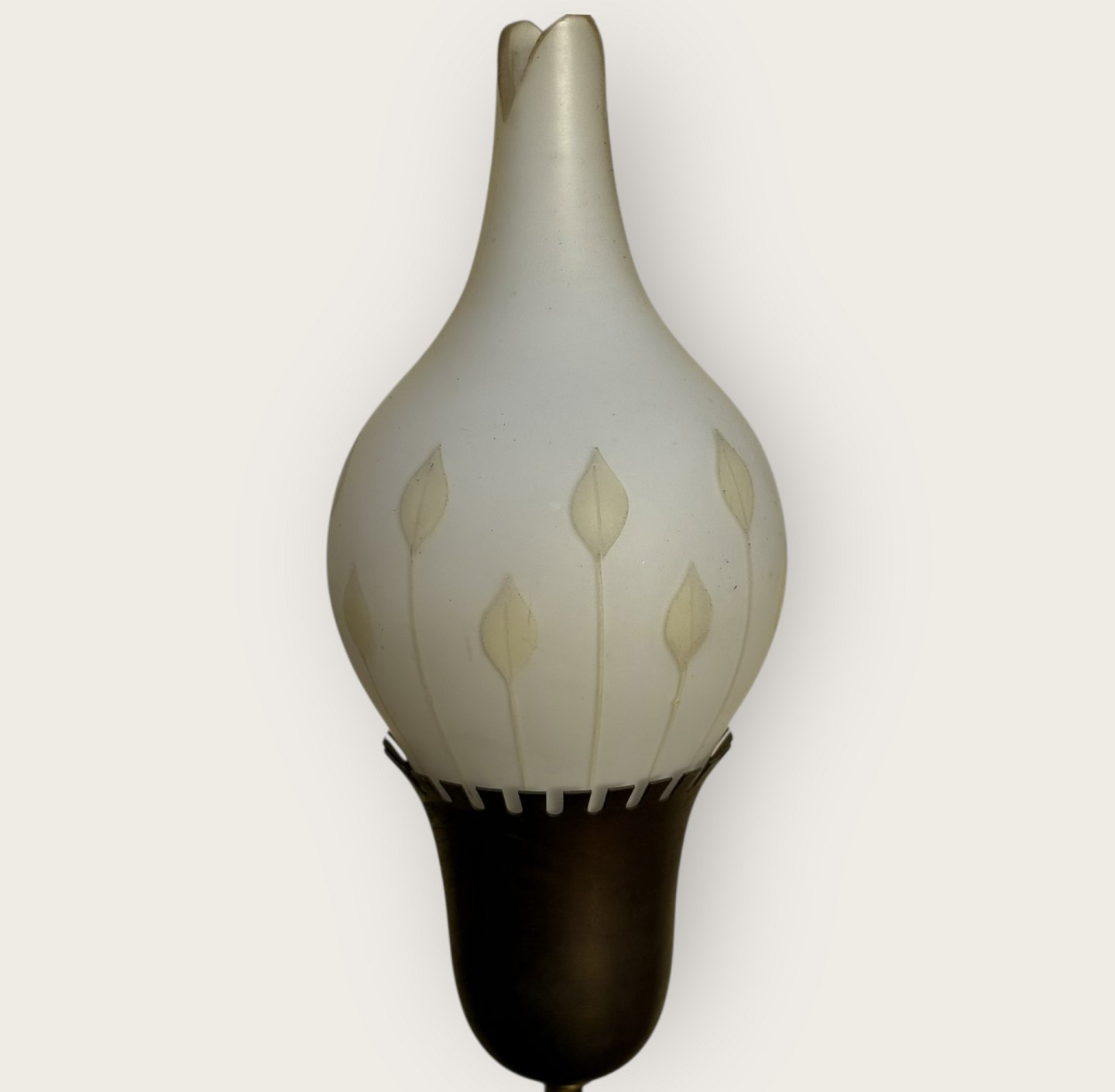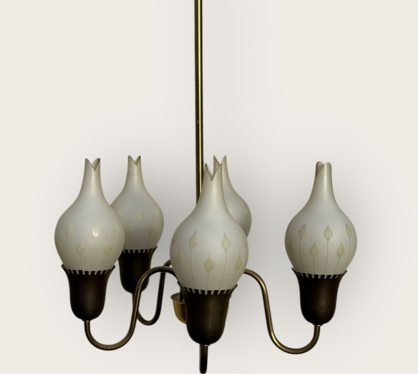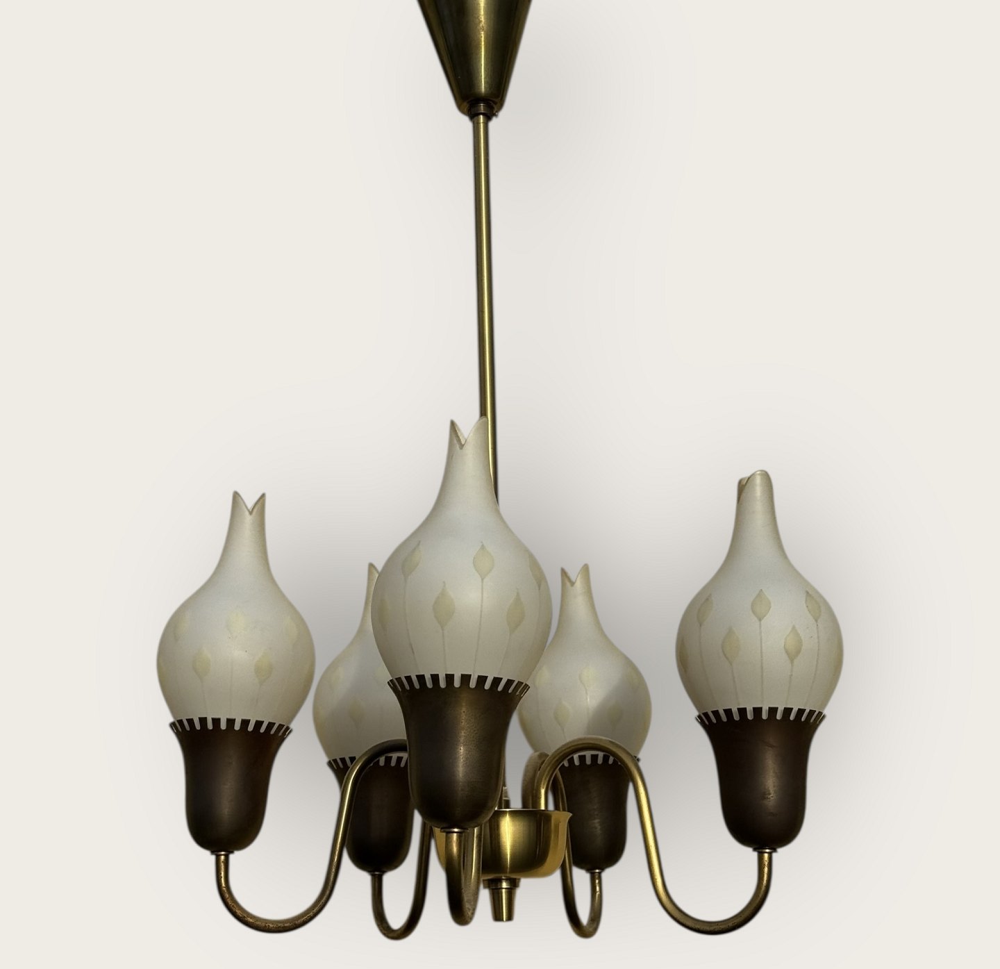 Kronleuchter aus Messing mit Glasschirmen, 5 große, tulpenförmige Schirme, vermutlich von Fog & Mørup gefertigt, jeder Schirm ca. 20 cm hoch und 10 cm im Durchmesser, die Lampe selbst 42 cm im Durchmesser und 67 cm hoch. *Hervorragender Zustand*Lager: 1