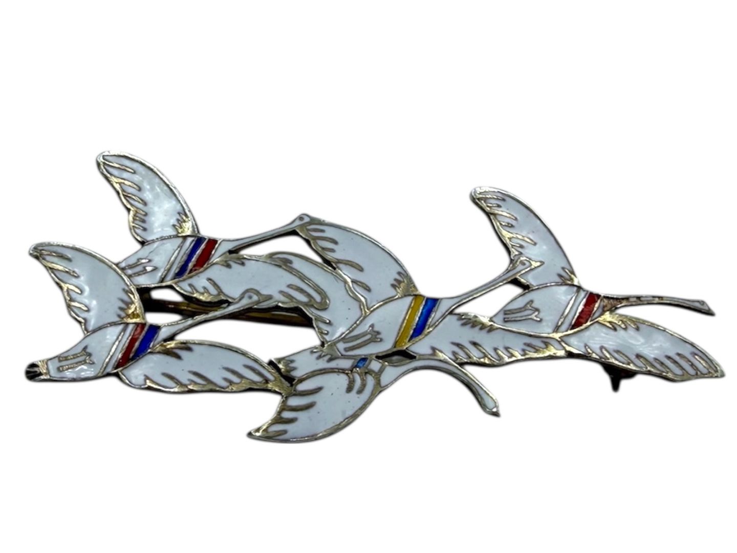 Erik Magnussen forgyldt sterlingsølv og emalje, broche med fem nordiske svaner.Stemplet "ERIK MAGNUSSEN STERLING ENERET".