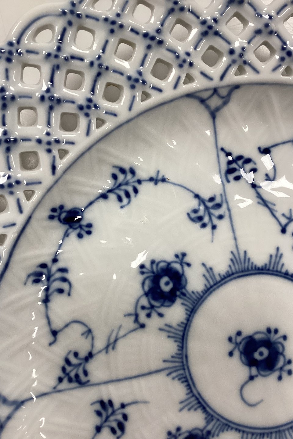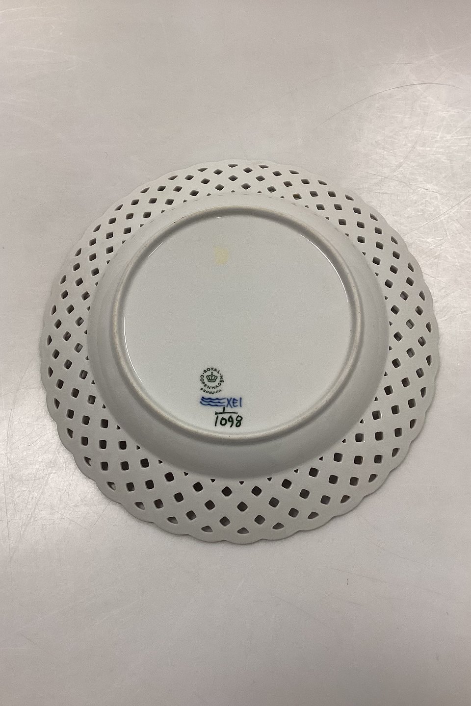 Royal Copenhagen Musselmalet Helblonde med gennembrudt kant Flad Tallerken No. 1/1098. Måler 25,5 cm / 10.04 in. 1. Sortering med glasurfejl, se foto.