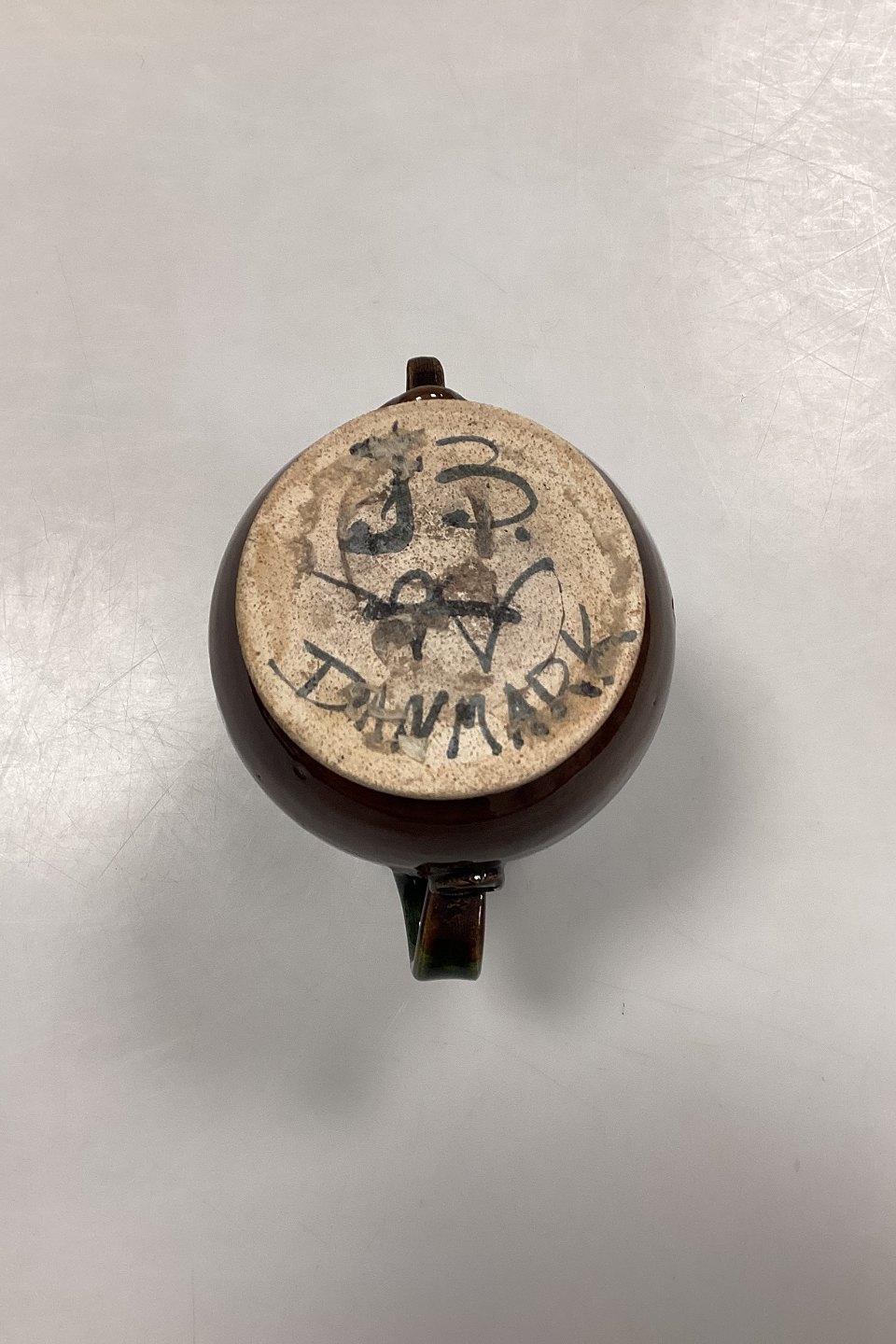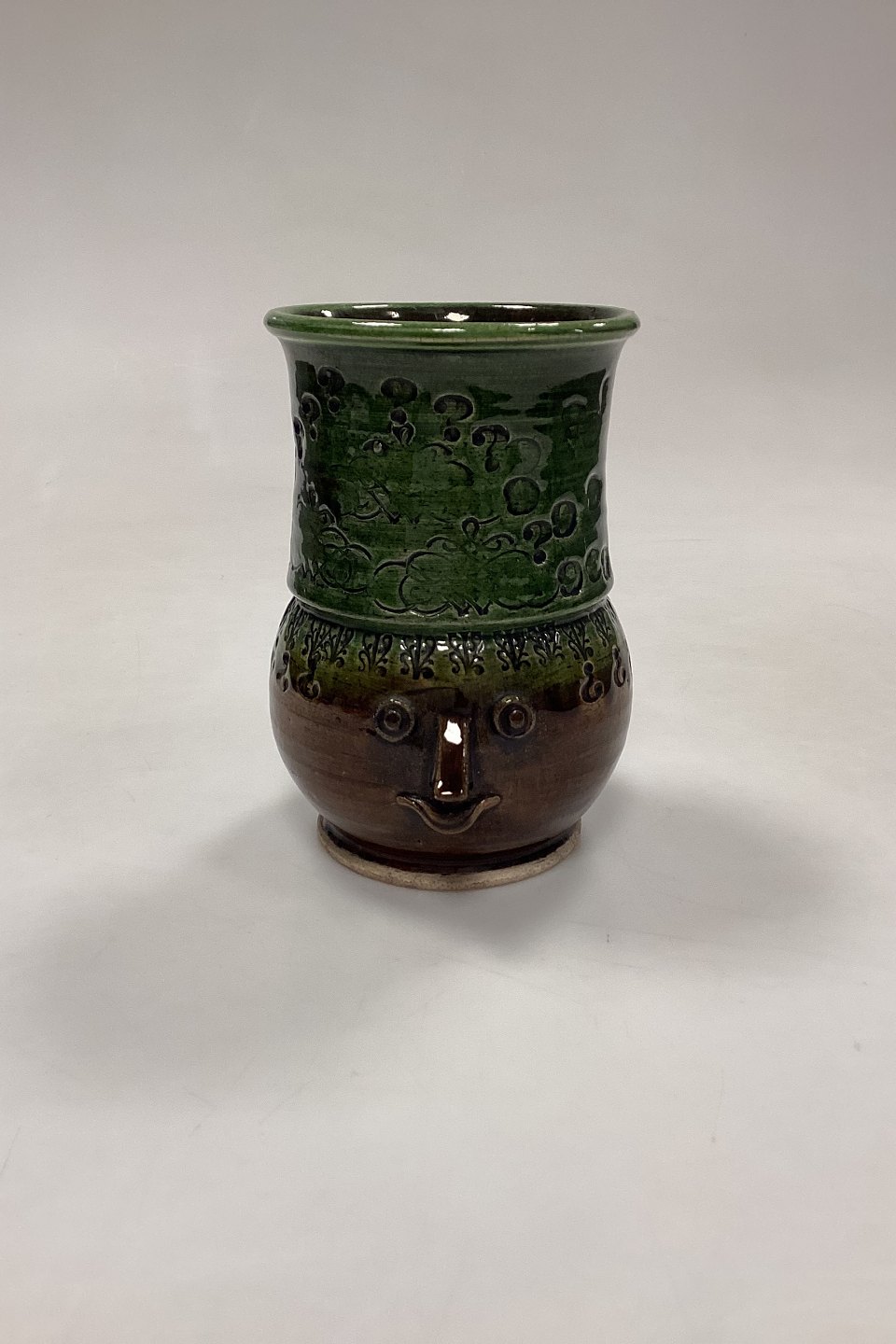 Bjørn Wiinblad Vase i glaseret Stentøj. Motiv med ansigt, hank og prægede stencilmønstre i brun og grøn glasur.Måler 14 cm / 5,51 in.