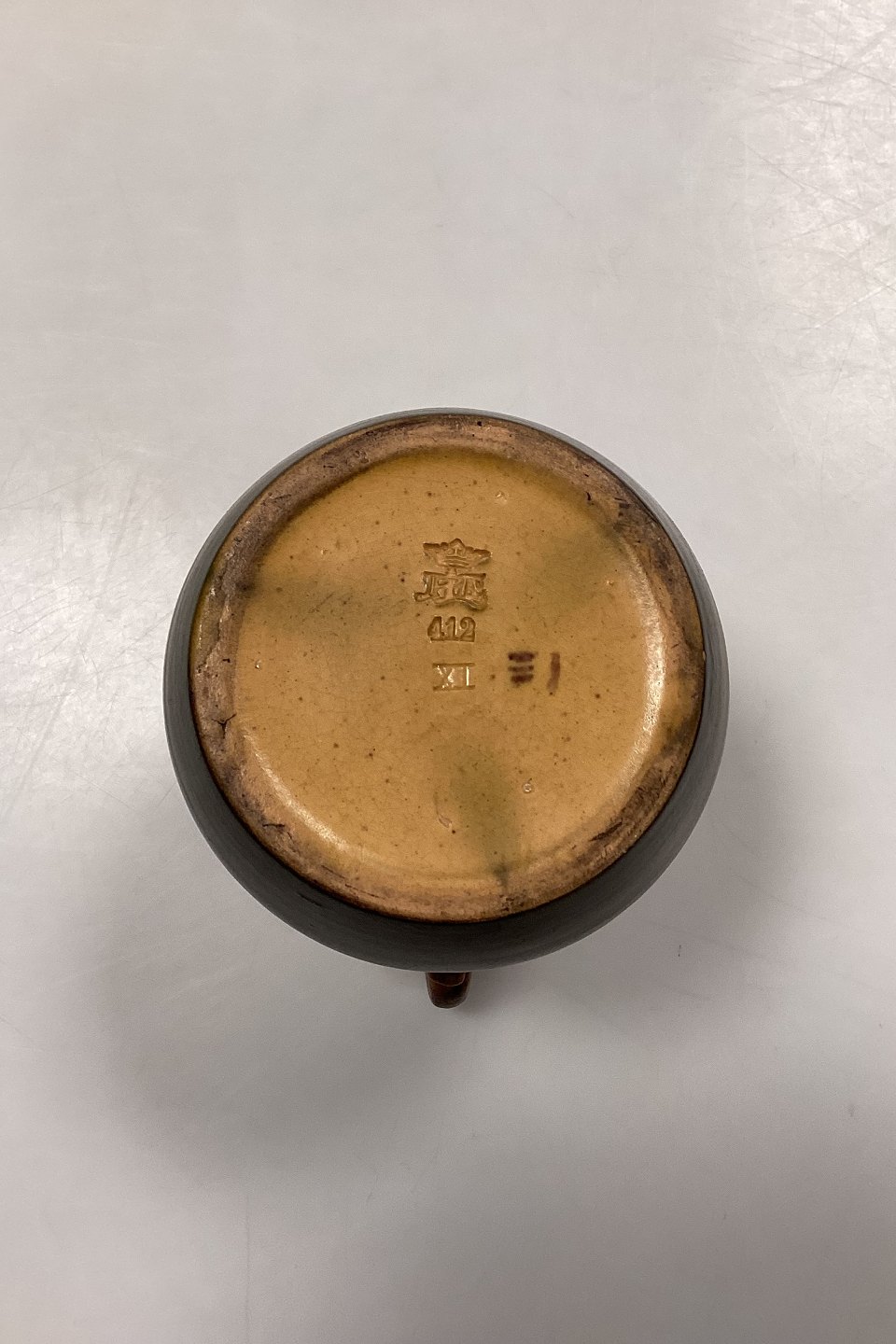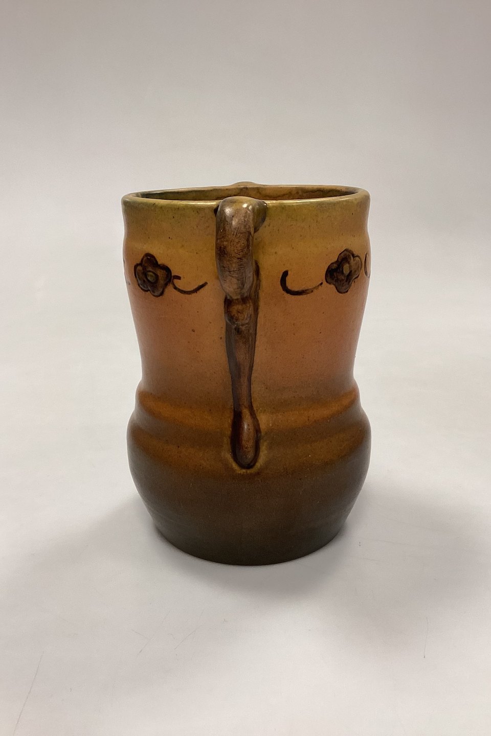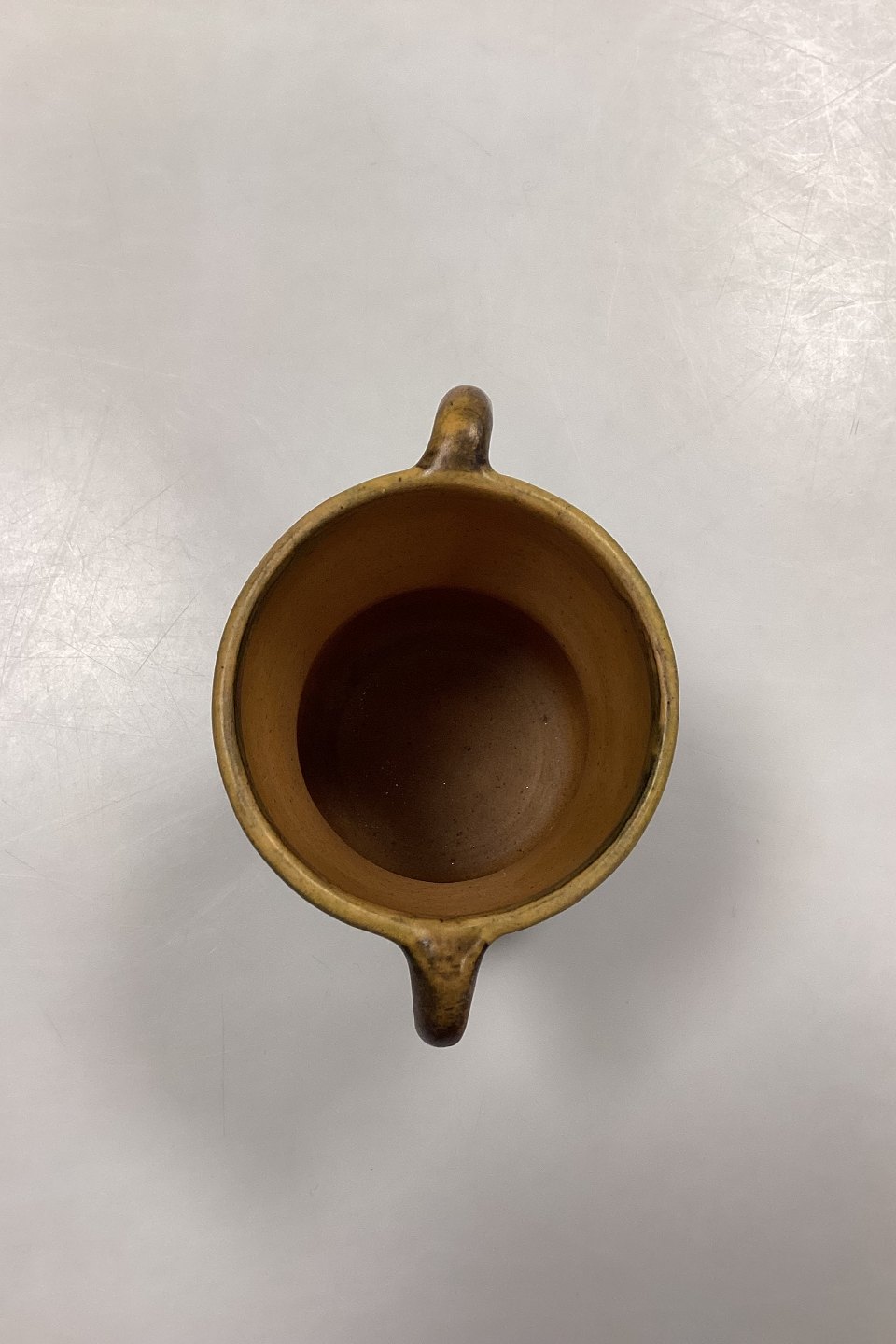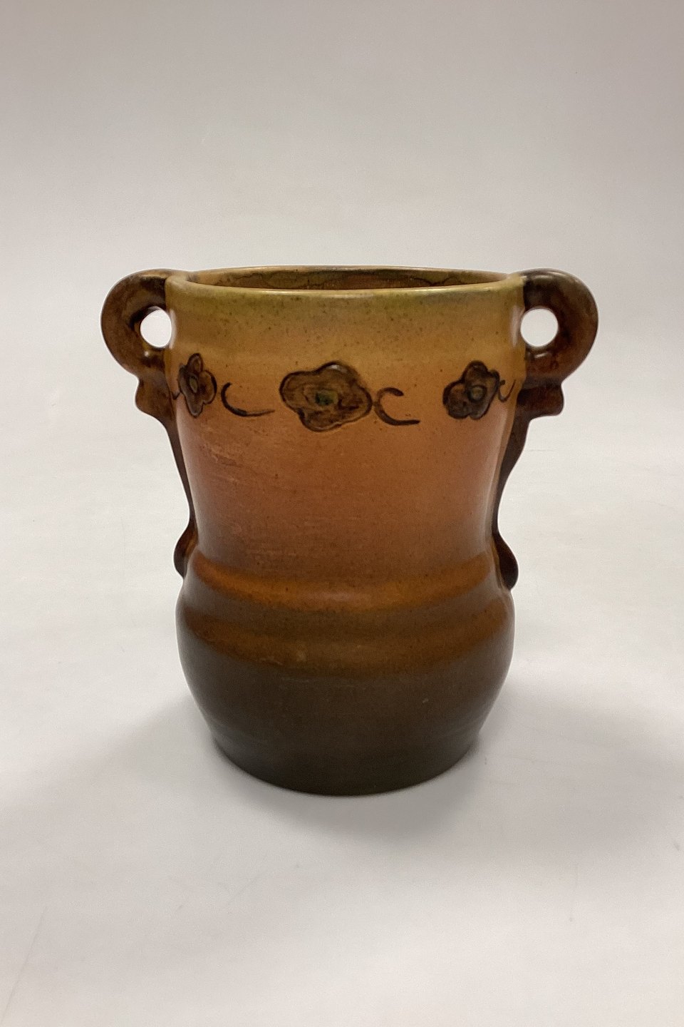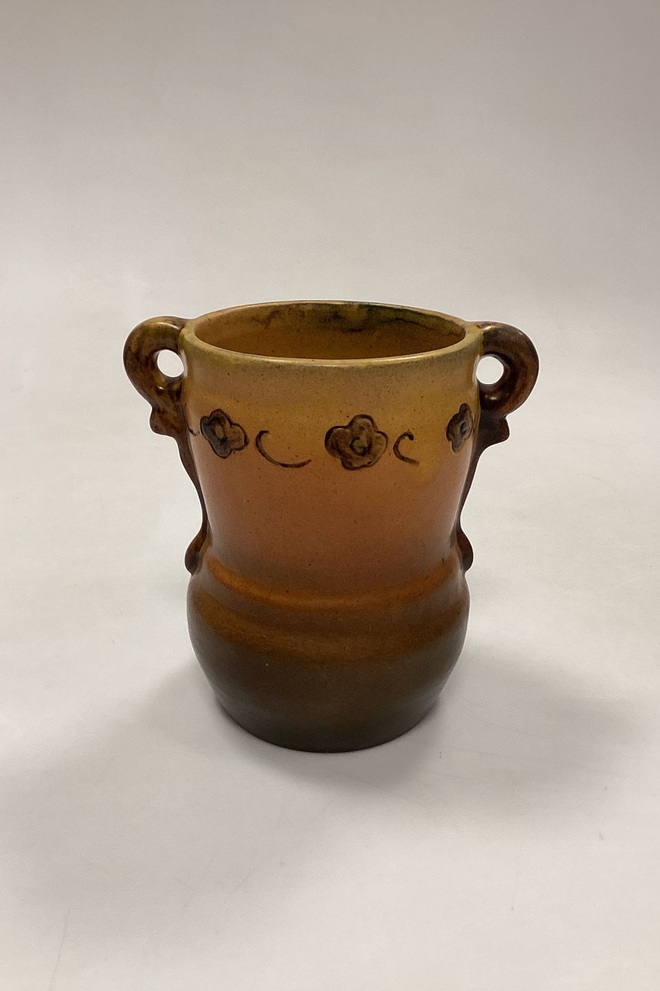 P. Ipsens Enke Vase No. 412. Stentøj med gul og brun glasur, med prægede blomster i kanten. Måler 14,7 cm / 5,78 in.