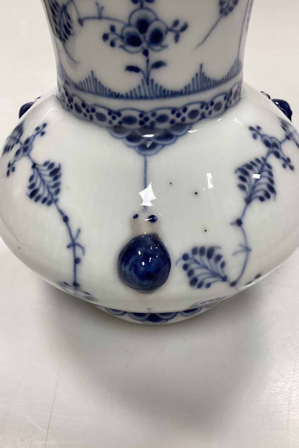 Royal Copenhagen Musselmalet Helblonde Vase No. 1197. Små sorte nister i glasuren, og brændningshul på sneglehus, se fotos.Måler 21,5 cm / 8,46 in. 1. Sortering