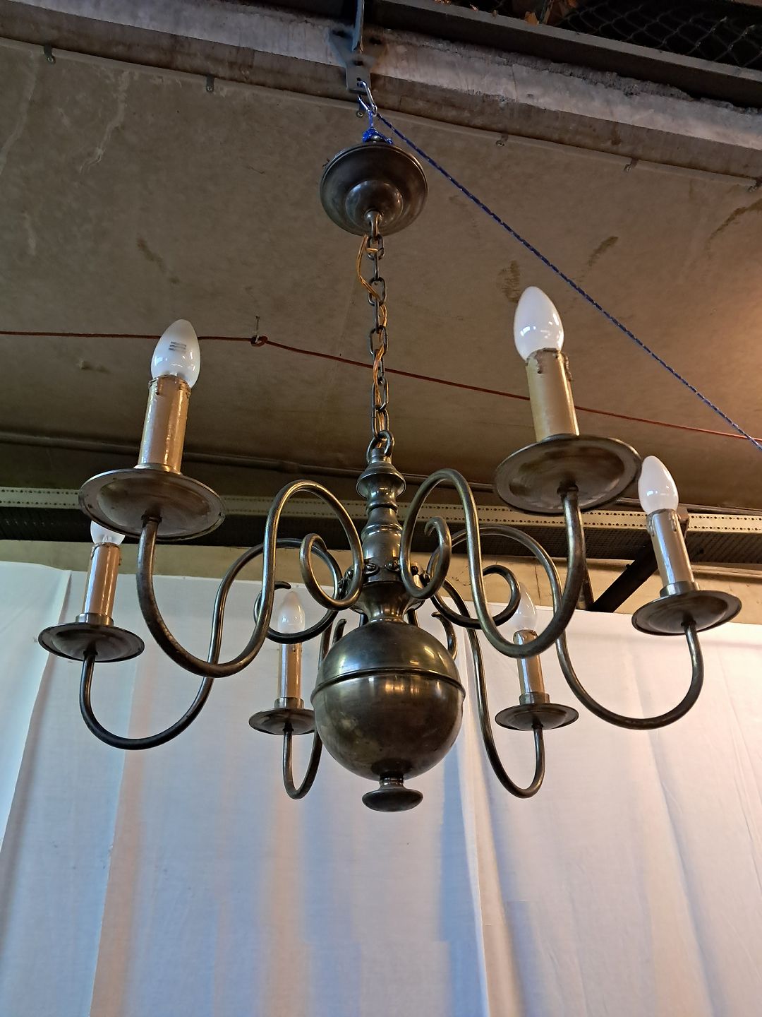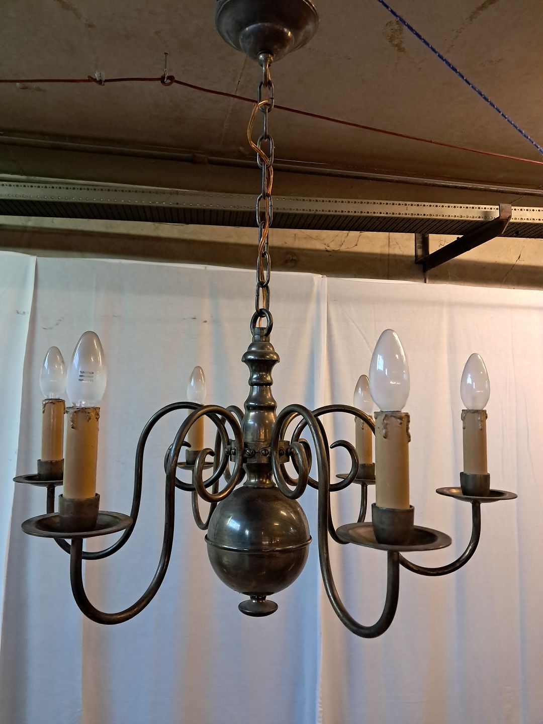 6-armet kirkekrone i bruneret messing, fra 1930erne.Den har brugsspor.