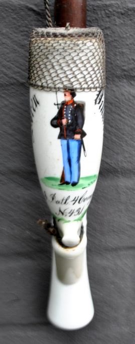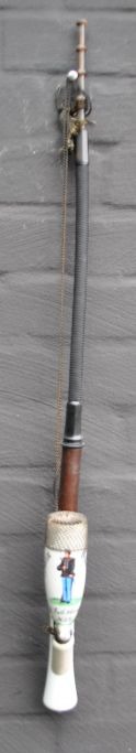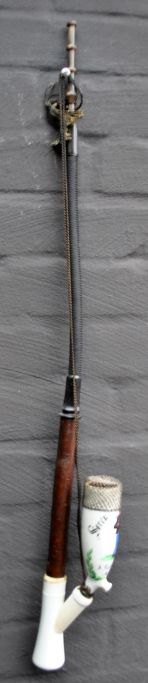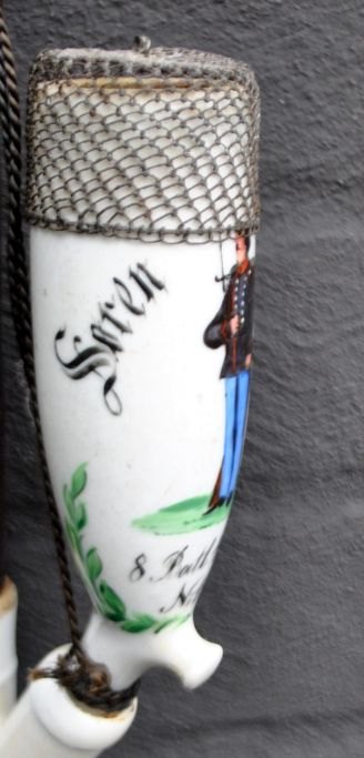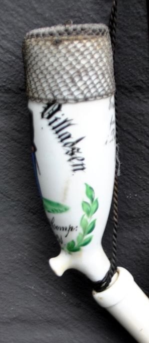 Dänische Soldaten Porzellanpfeife, 1878, Kopenhagen. Bemaltes weißes Porzellan. Bemalt mit der Inschrift: Søren Villadsen, 8. Bataillon, 4. Kompanie, Nr. 431. Erinnerung aus dem Lager in Dyrehaven. Mit einem Pfeifenkopf aus gedrechseltem Holz und geflochtenem Rosshaar. Mit eisernem Gitter am Pfeifenmund. Mundstück aus Horn. Länge: 70 cm.Bestellnummer: 28511