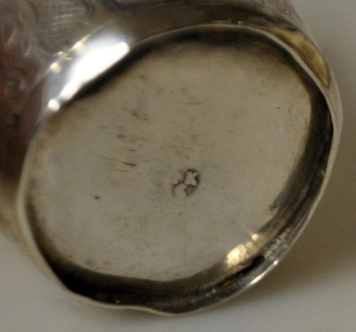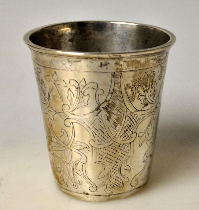 Jens Kieldsen Sommerfeldt (1692–1772), Silberschmied in Aalborg, Dänemark: Silberbecher. Mit Kartusche. Gestempelt. Höhe: 7,5 cm. Gewicht: 79 Gramm.Bestellnummer: 28671
