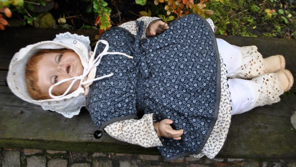 Antike Puppe mit Geräuschen, 19. Jahrhundert. Deutschland. Kopf und Gliedmaßen aus Verbundmaterial. Körper aus Segeltuch. Blaue Augen mit Wimpern, die sich öffnen und schließen lassen. Macht Geräusche beim Schaukeln. Kleidung aus Baumwolle und Lackschuhe. Länge: 48 cm.Bestellnummer: 28701