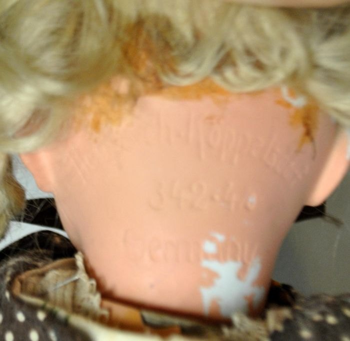 Heubach-Köppelsdorf-Puppe Nr. 342.4/0, 19. Jahrhundert. Deutschland. Gestempelt. Kopf und Körper aus Porzellan. Blaue, bewegliche Augen mit Wimpern. Baumwollkleidung. Länge: 42 cm.Bestellnummer: 28702