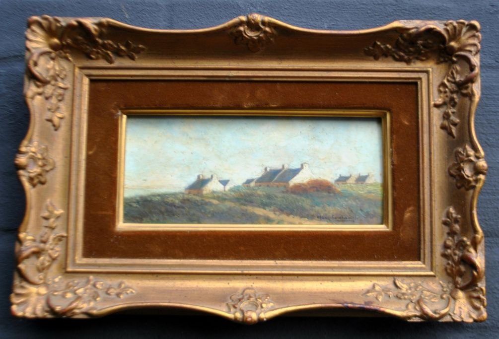 Deschamps, Margaret (19. Jahrhundert) Frankreich: Häuser am Meer. Öl auf Holz. Signiert. 9 x 21 cm.Gerahmt: 21,5 x 33,5 cm.