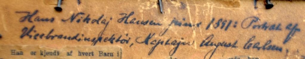 Rückseite eines Zeitungsausschnitts aus dem Artikel „Dannebrog“ vom 31. Juli 1895 über August Carlsen, der zuvor bei der Marine gedient und den Rang eines Kapitäns bekleidet hatte. 1870 trat er der Feuerwehr bei, wo er später zum stellvertretenden Brandinspektor befördert wurde.