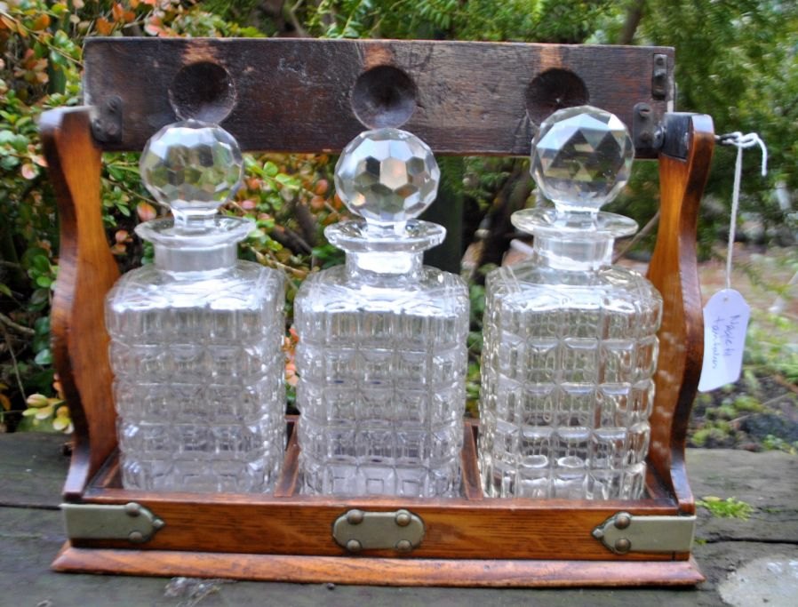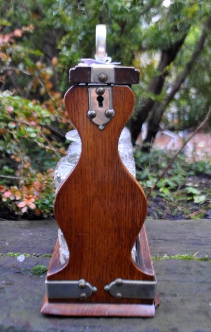 Englischer Tantalus mit drei Kristallkaraffen, 19. Jahrhundert. Polierte Eiche. Mit Messingbeschlägen und Schloss mit Schlüssel. Höhe: 31 cm. Länge: 34 cm.Bestellnummer: 28755