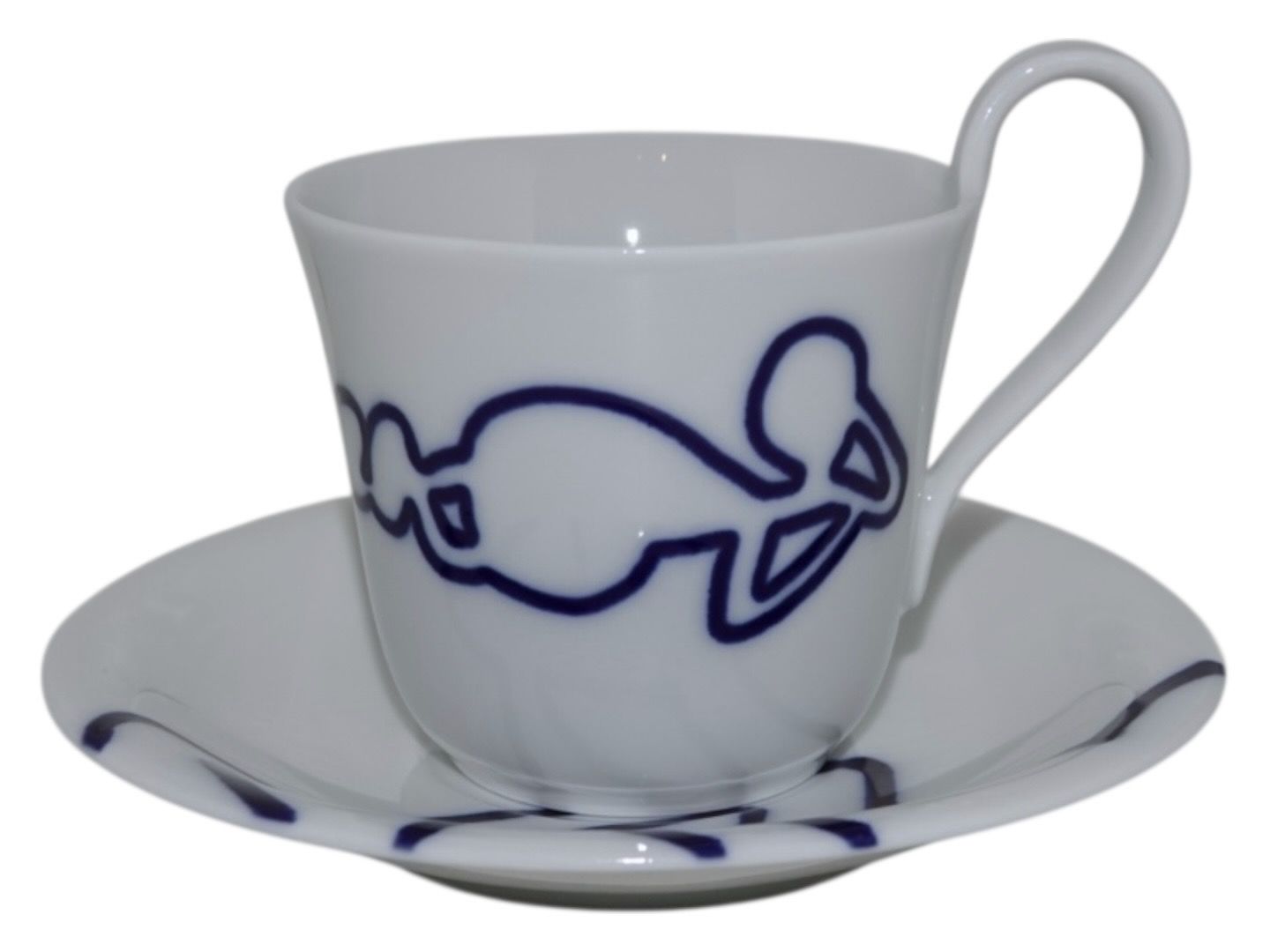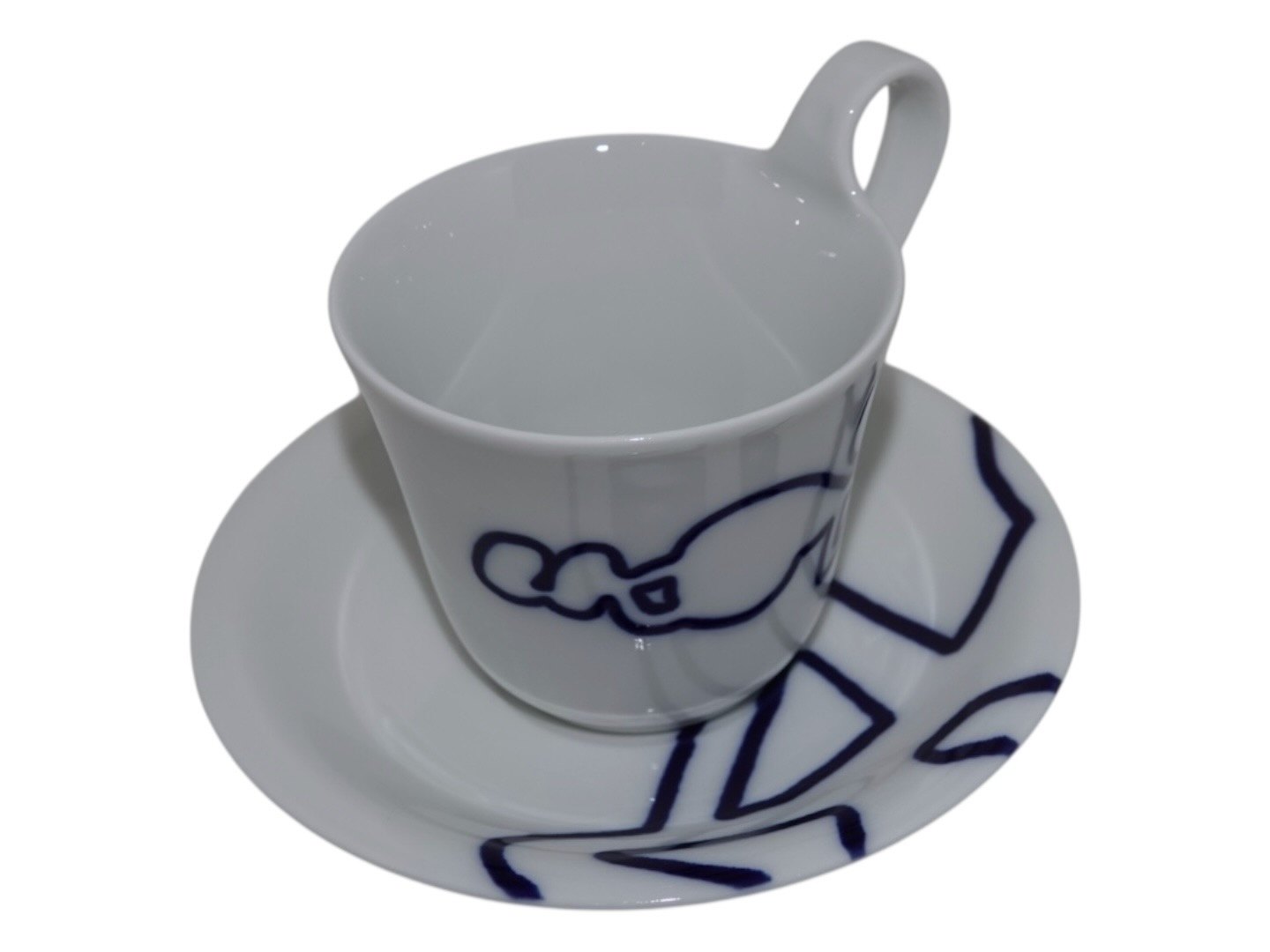 Royal Copenhagen Musica, højhankskop med tilhørende underkop. Dekoration D.Dekorationsnummer 093D (kop) og 094D (underkop).