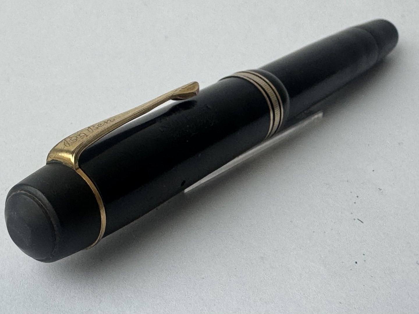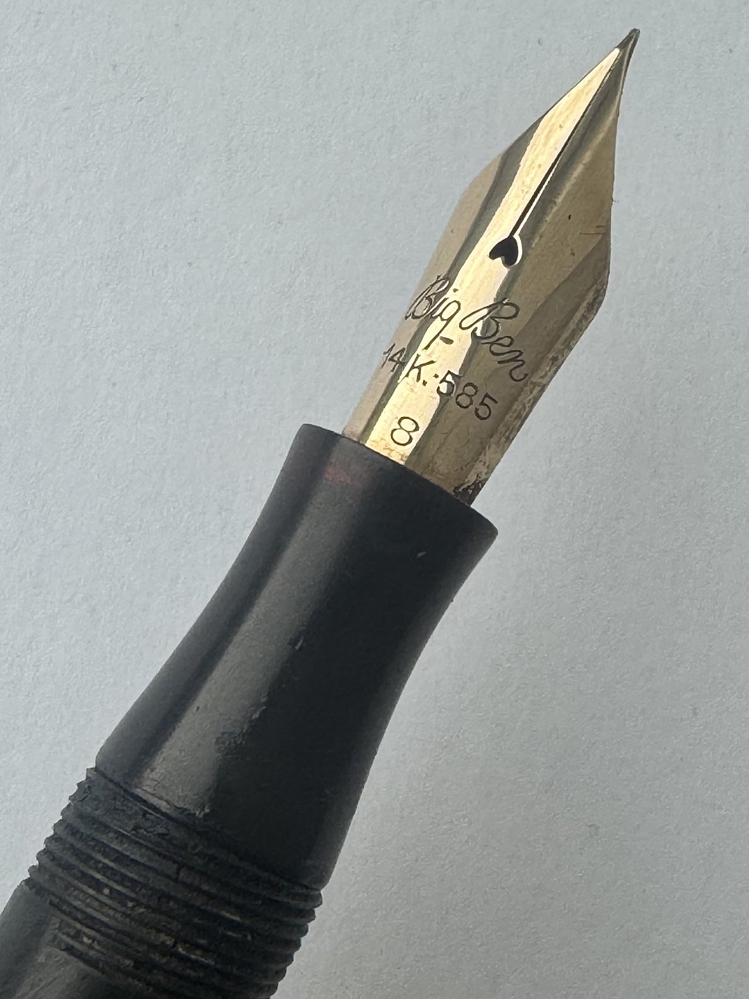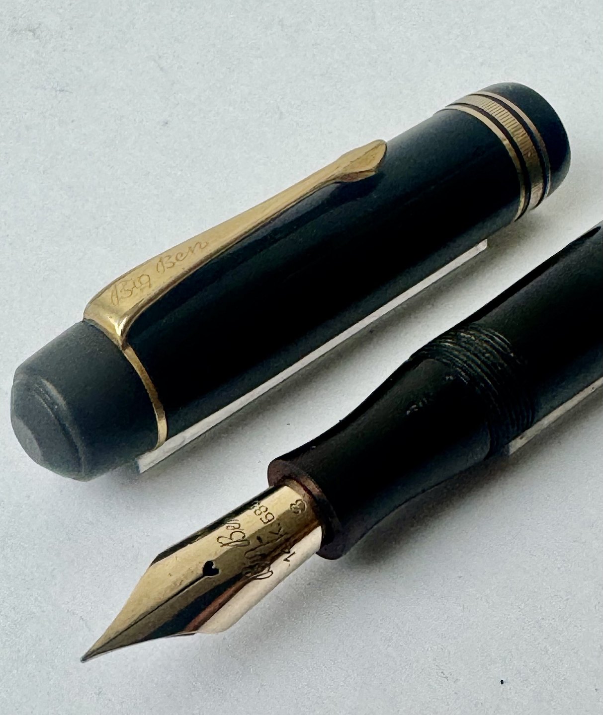 Stor sort Big Ben no. 8 fyldepen med push button filler. Fremstår i god stand uden skader eller reparationer. Alle dele originale BB dele inklusiv en kæmpe guldspids i 14 karat. Der skal indsættes ny gummisæk så pennen igen kan optage blæk og skrive igen. Fyldepennen måler 13,7 cm i længde og hættens åbningsdismeter er 1,3 cm.