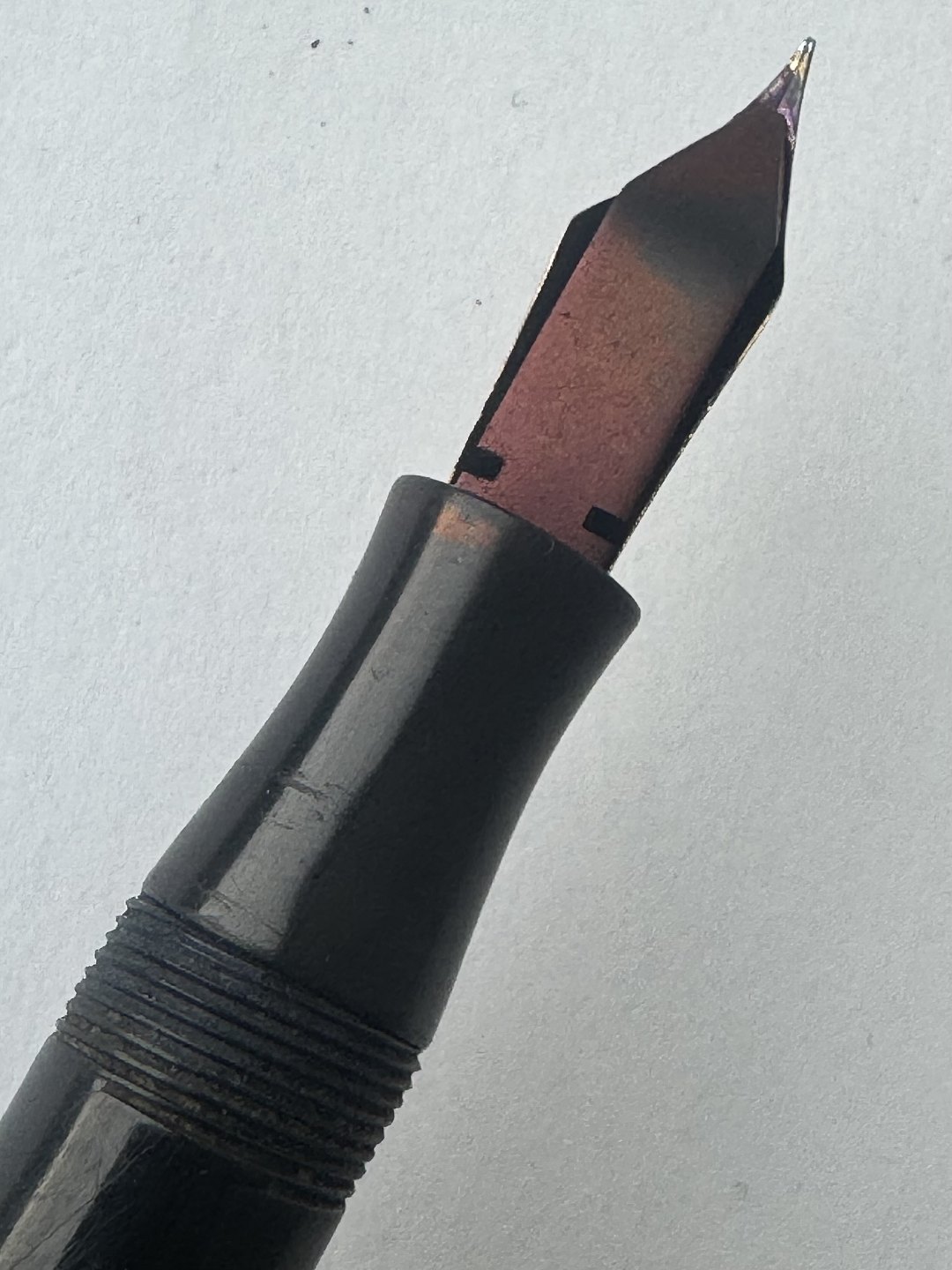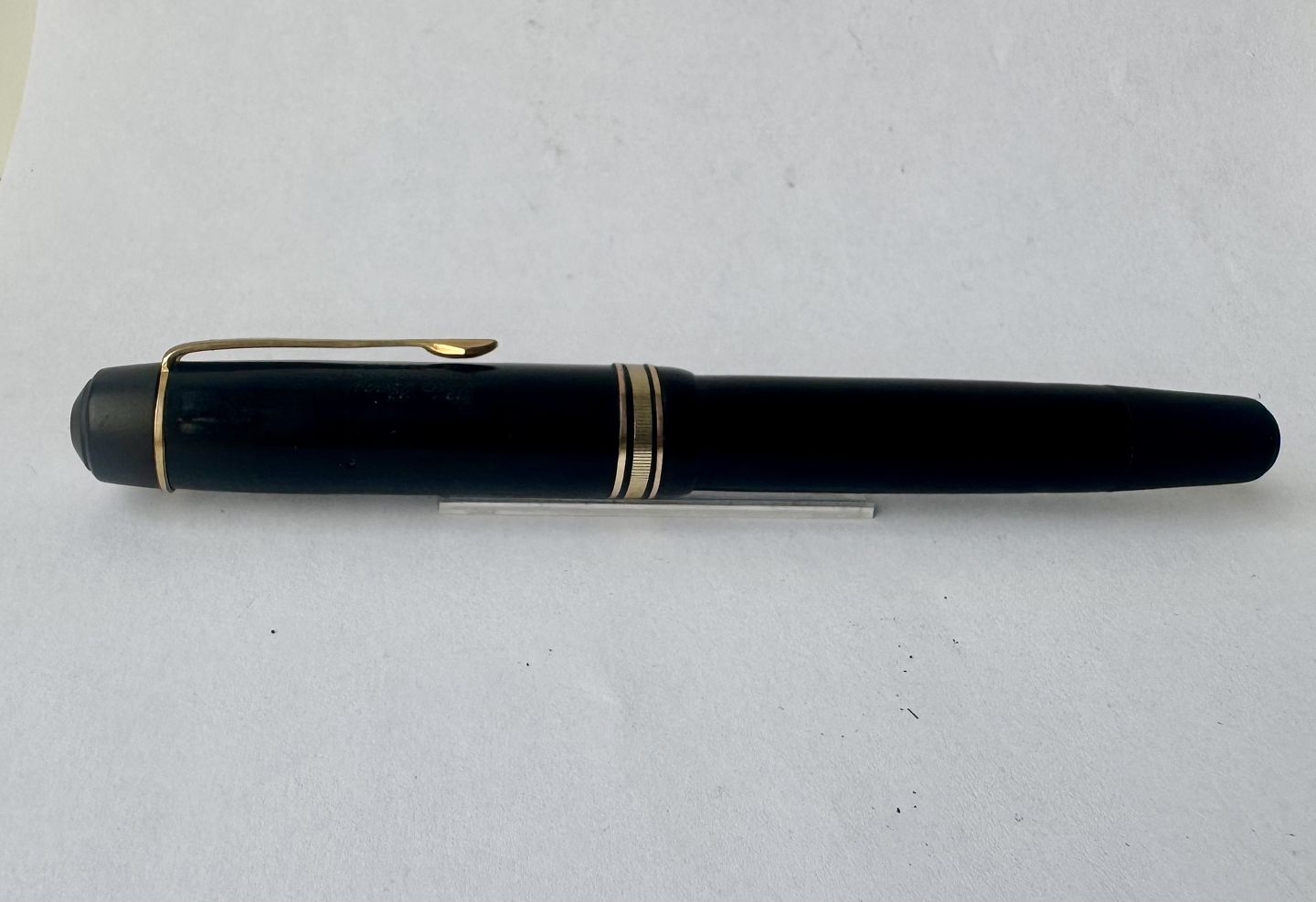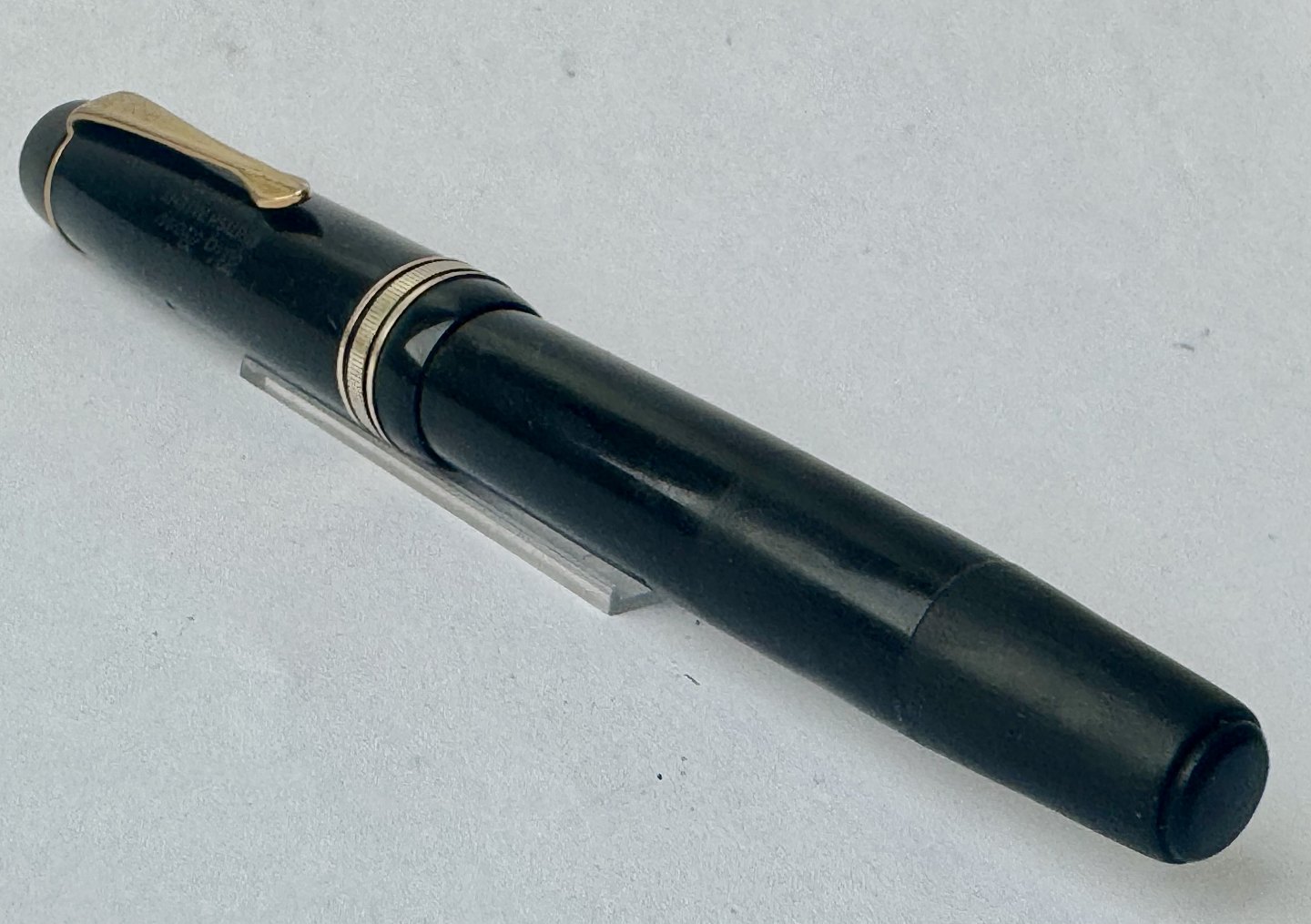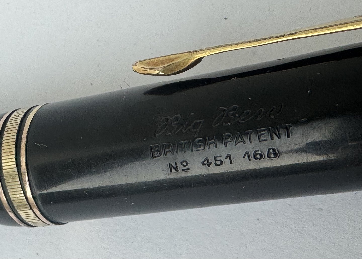 Stor sort Big Ben no. 8 fyldepen med push button filler. Fremstår i god stand uden skader eller reparationer. Alle dele originale BB dele inklusiv en kæmpe guldspids i 14 karat. Der skal indsættes ny gummisæk så pennen igen kan optage blæk og skrive igen. Fyldepennen måler 13,7 cm i længde og hættens åbningsdismeter er 1,3 cm.