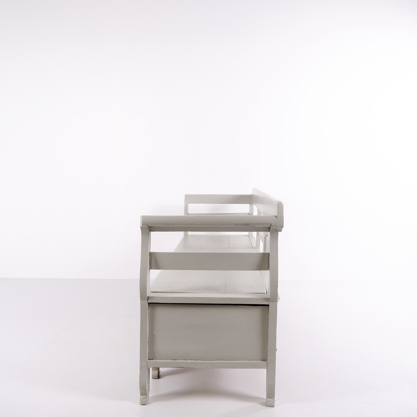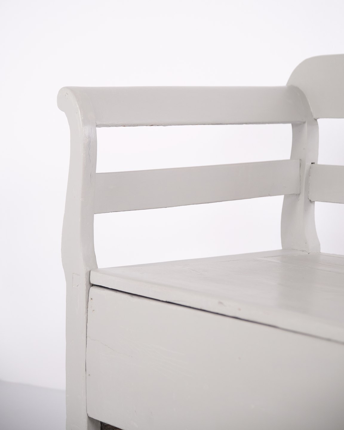Antike Truhenbank aus den 1860er-Jahren aus grau gestrichenem Kiefernholz mit Stauraum. Klassisches und funktionales Möbelstück mit Patina.— Zeitraum: 1860er-Jahre