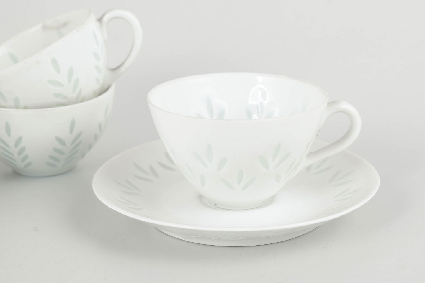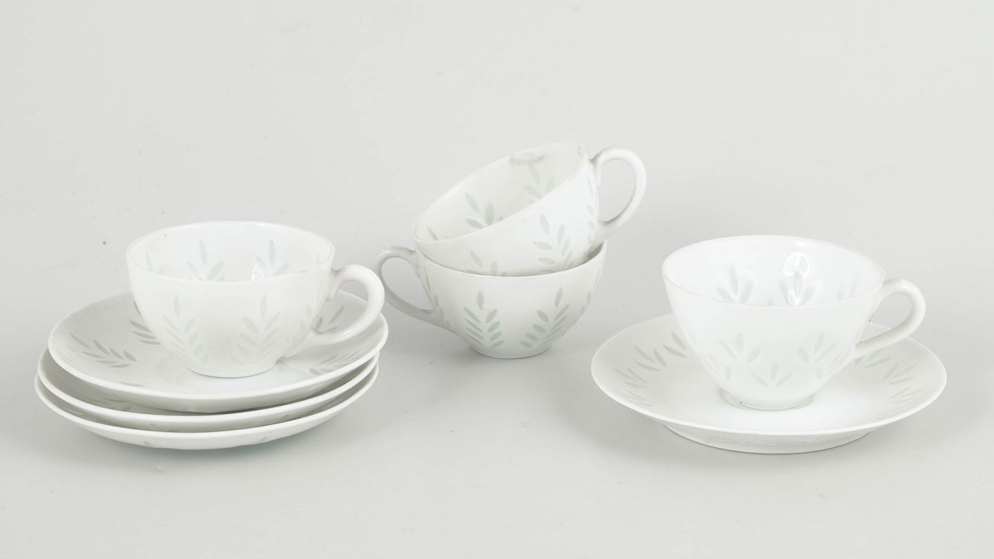 Elegant sæt bestående af fire mokkakopper med tilhørende underkopper i hvidt porcelæn, dekoreret med diskret bladornamentik udført i transparente, let grønligt tonede glasurfelter. Det lette og raffinerede udtryk kombineret med de bløde former er karakteristisk for Friedl Holzer-Kjellbergs sene porcelænsproduktion for Arabia.