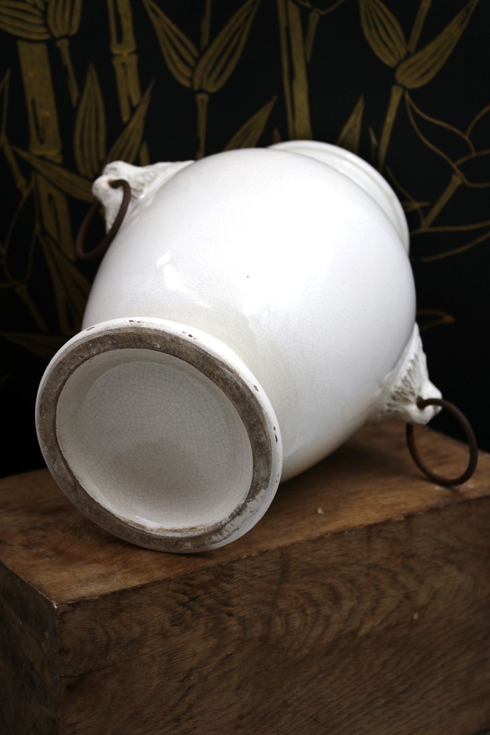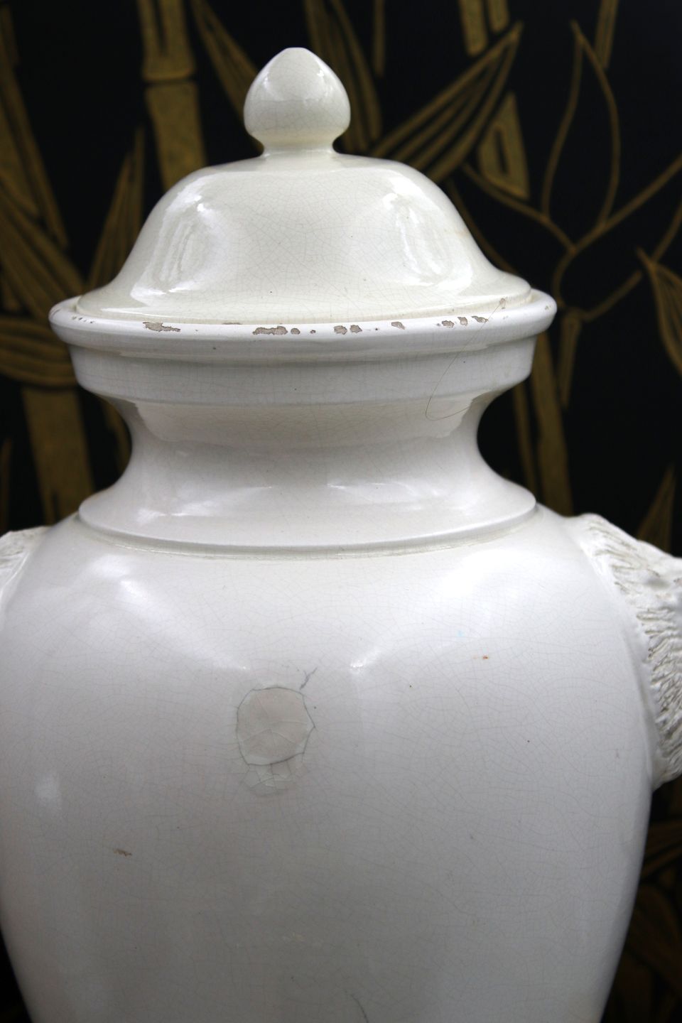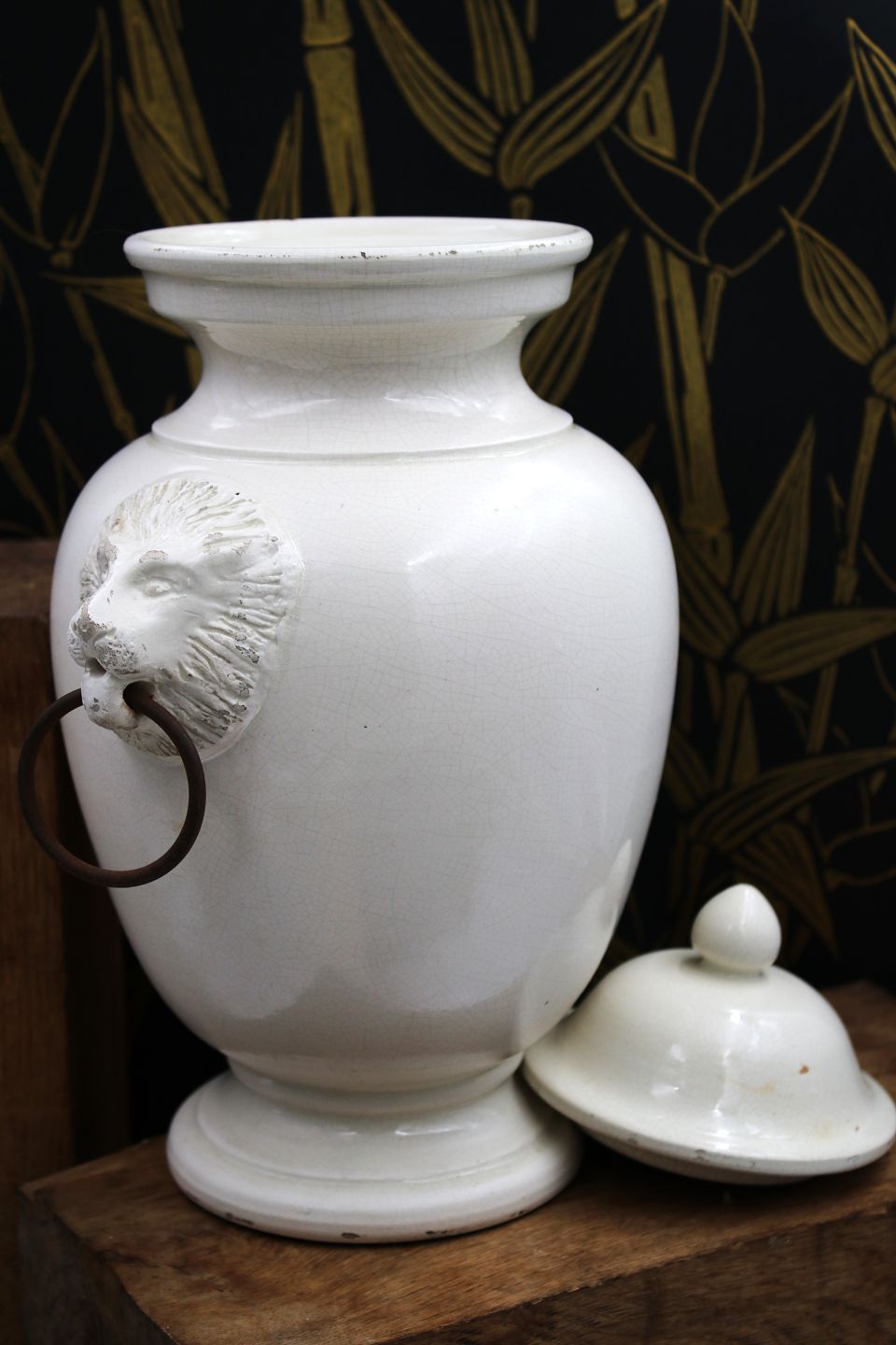 Gammel glaseret stentøjs lågkrukke med løvehoveder på siden...