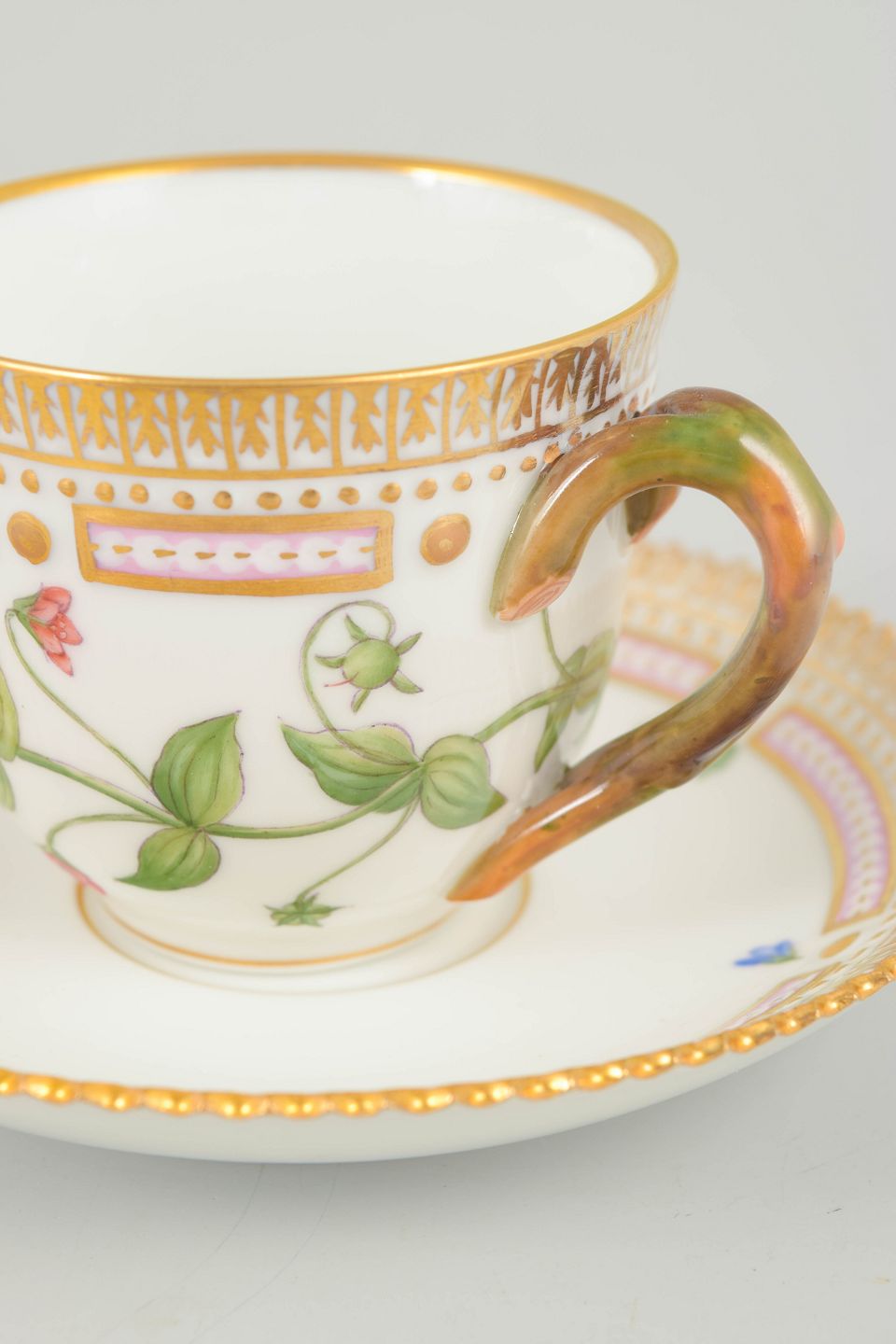 Bio: Flora Danica-stellet blev introduceret i 1790 og regnes blandt Royal Copenhagens mest prestigefyldte produktioner. Dekorationerne er baseret på det monumentale botaniske værk Flora Danica og er kendetegnet ved høj detaljerigdom og fremragende håndværksmæssig kvalitet. Moccakopper var traditionelt anvendt til servering af stærk kaffe og repræsenterer en raffineret del af det klassiske kaffestel.