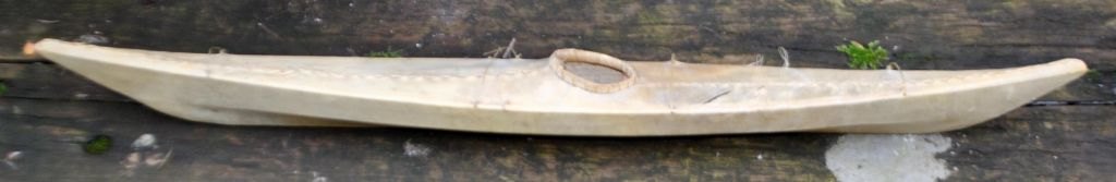 Großes grönländisches Kajak, 20. Jahrhundert. Robbenfell über Holzrahmen. Inklusive Ruder, Speer und Schwimmblase. Länge: 70 cm.Bestellnummer: 28781