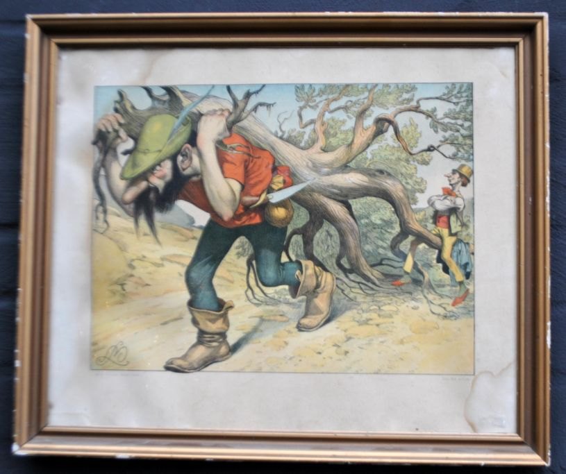 Moe, Louis (1877–1945) Dänemark: Komposition mit Mann, der einen Baum trägt. Farblithografie. Signiert im Druck. Herausgegeben von Alfred Jacobsen, Kopenhagen. 27,5 × 36 cm.Gerahmt: 41 x 49 cm.