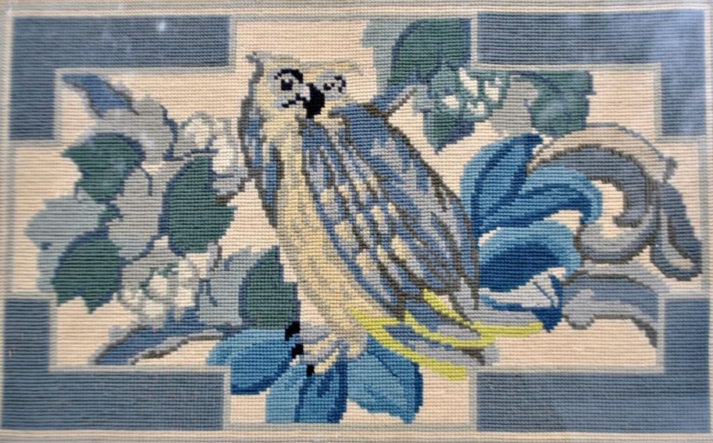 Tablett mit Stickerei, 19. Jahrhundert. Tablett aus geschnitzter Eiche mit zwei Griffen. Mit Glasplatte, unter der eine Eule zwischen Blattwerk gestickt ist. 65 x 44 cm.