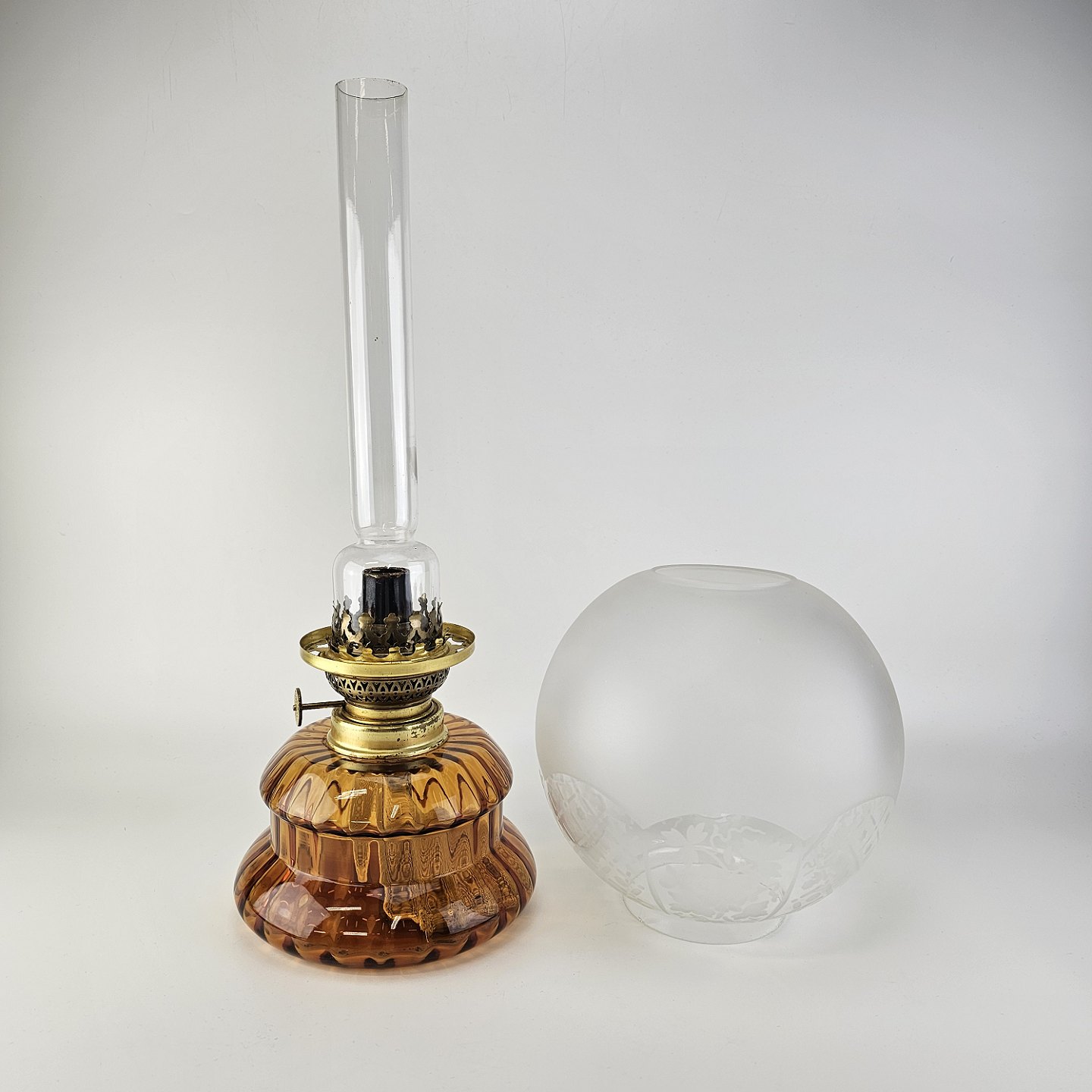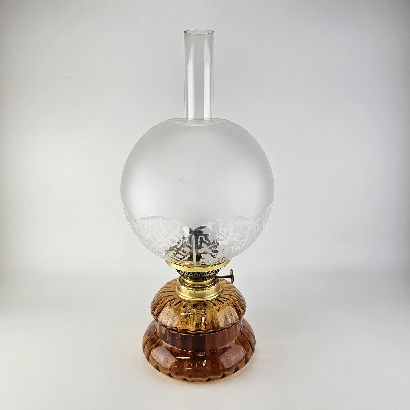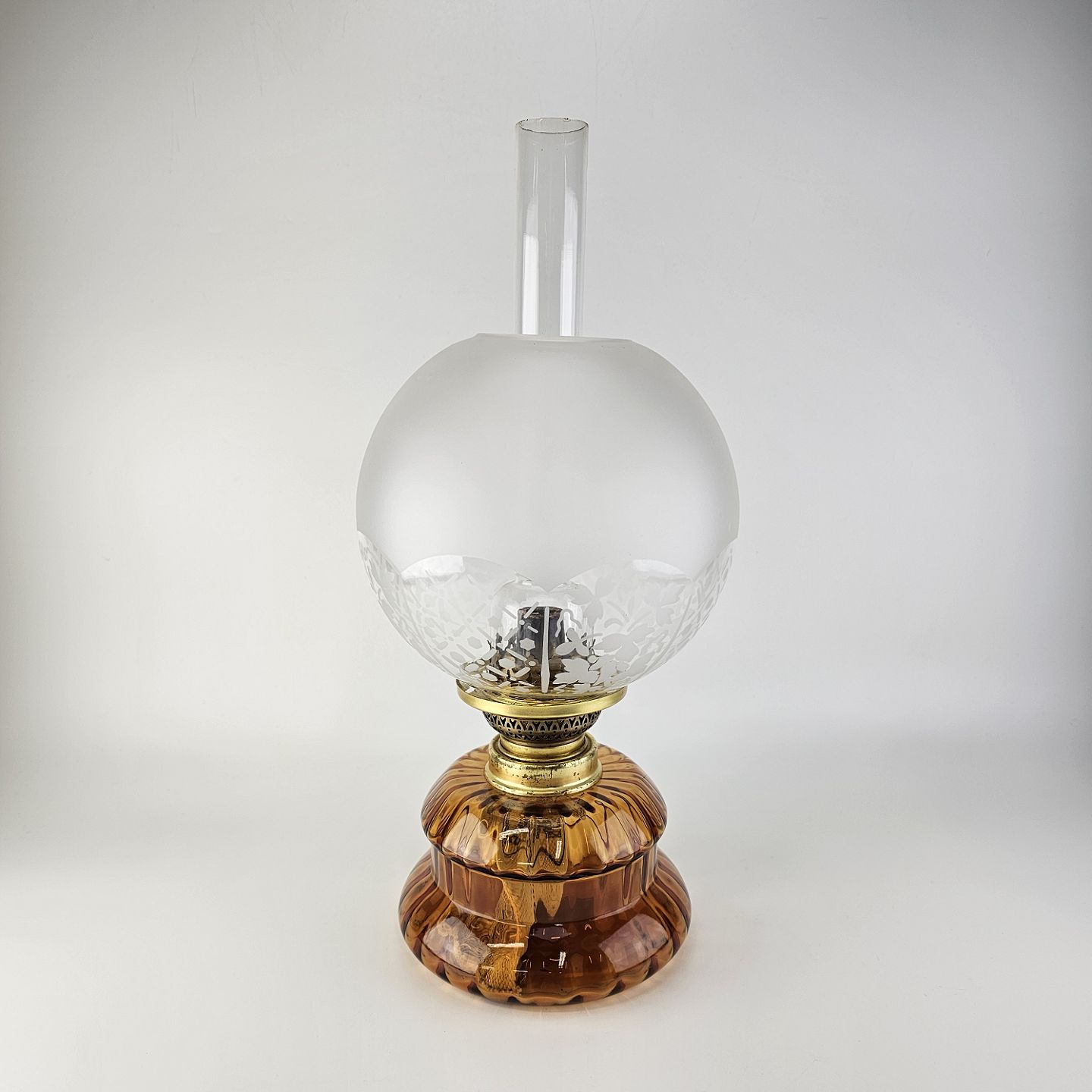 Glas ravfarvet petroliumslampe til bord model Dagmar Maxi med glasrør og rund kuppel i klar glas. Lille afslag på kuppelskærm i fod, som ikke ses.Messing brænder og skærmholder.