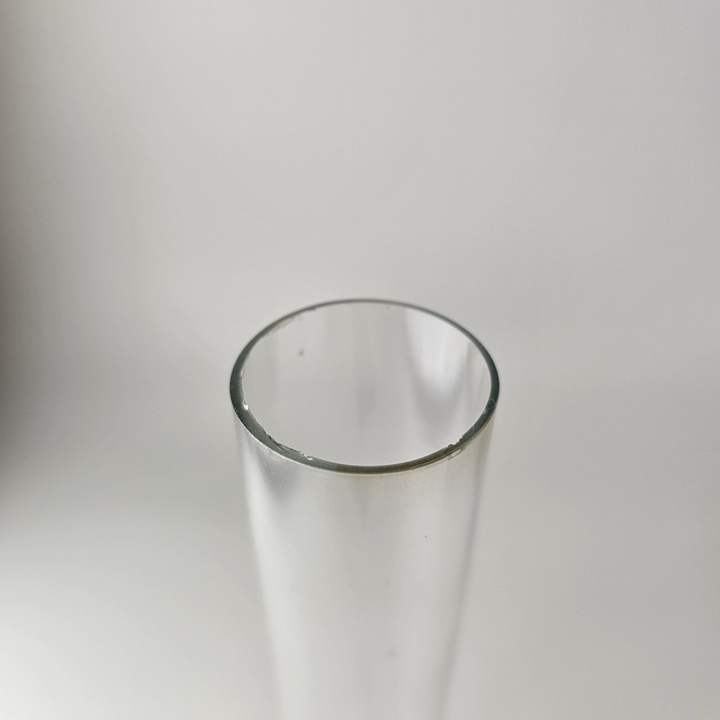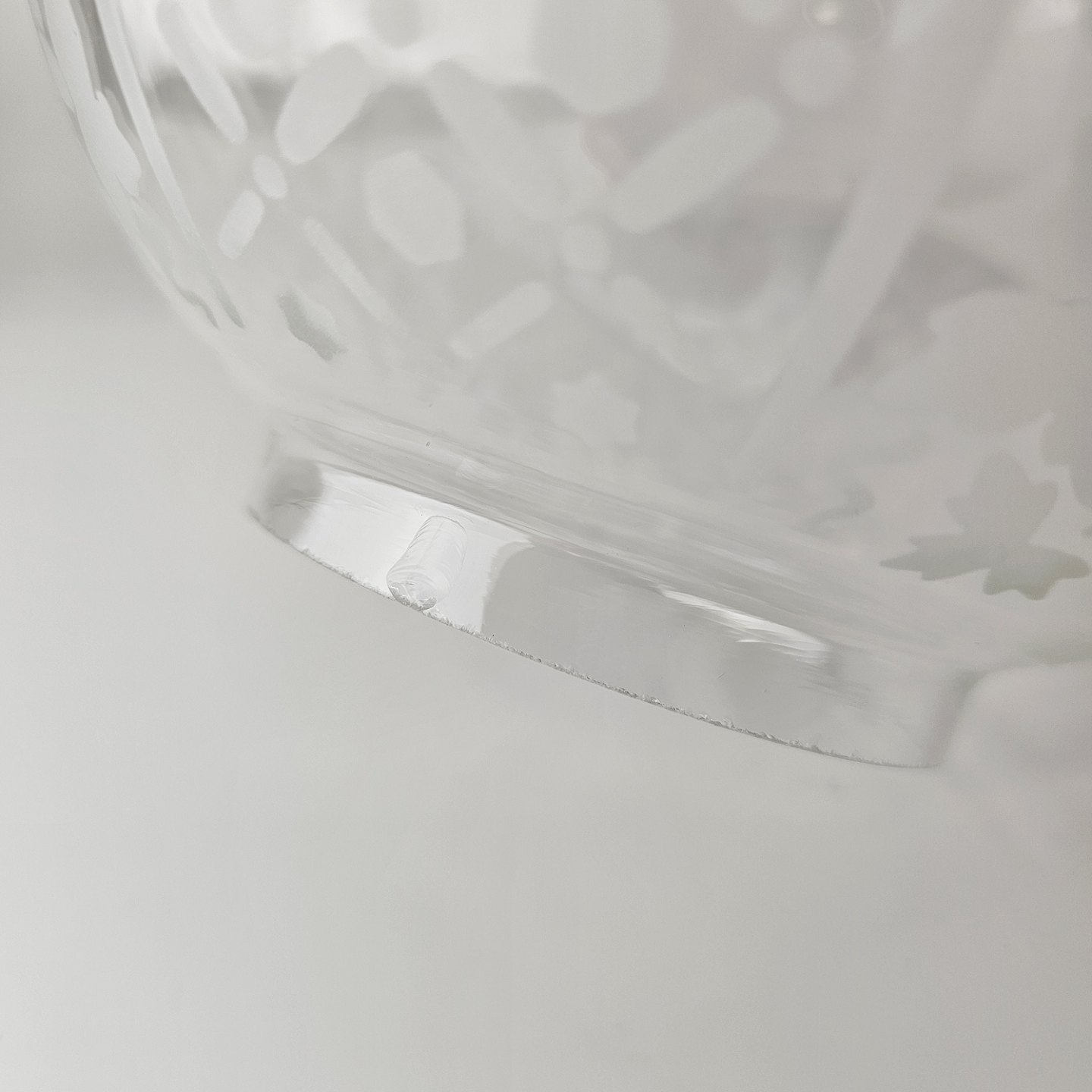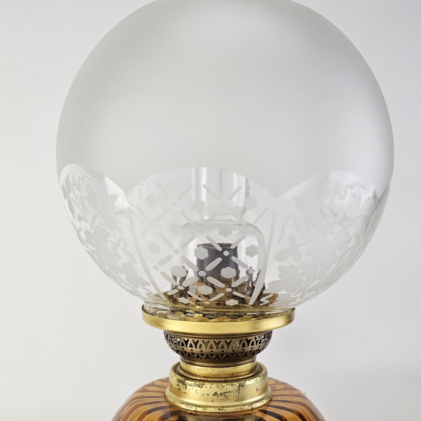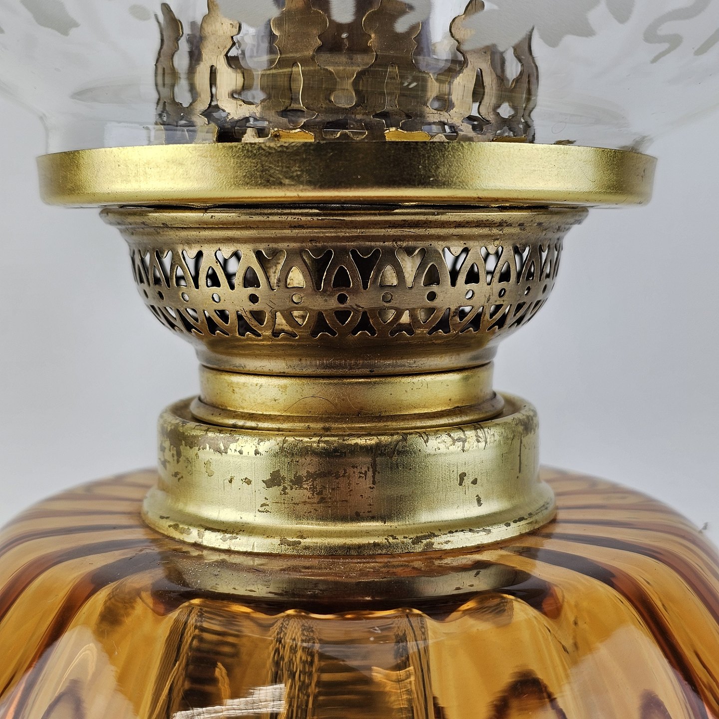 Glas ravfarvet petroliumslampe til bord model Dagmar Maxi med glasrør og rund kuppel i klar glas. Lille afslag på kuppelskærm i fod, som ikke ses.Messing brænder og skærmholder.