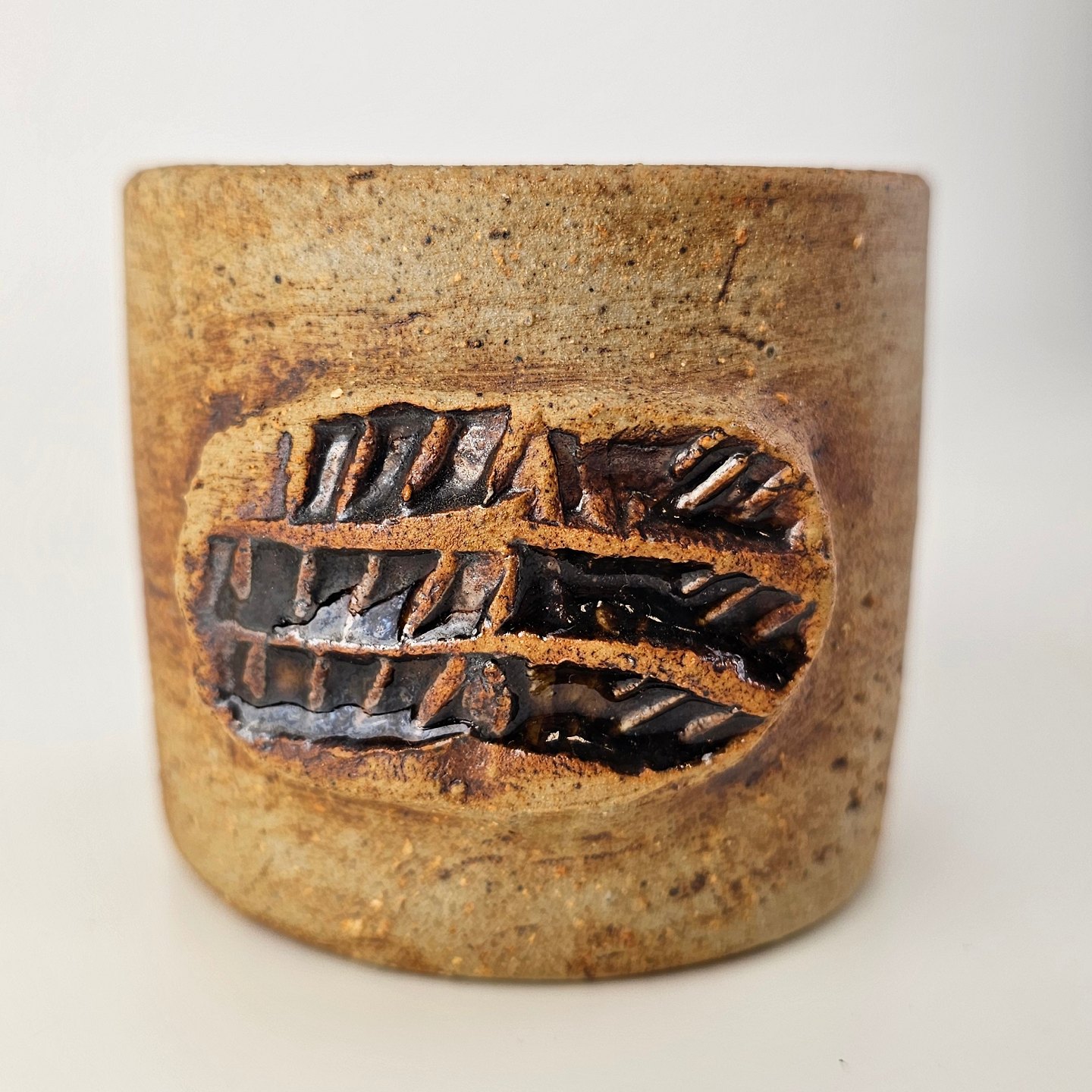 Brunlig krukke, krus, kop, vase med lille relief udvendigt. Den er uglasseret udvendigtSigneret CW