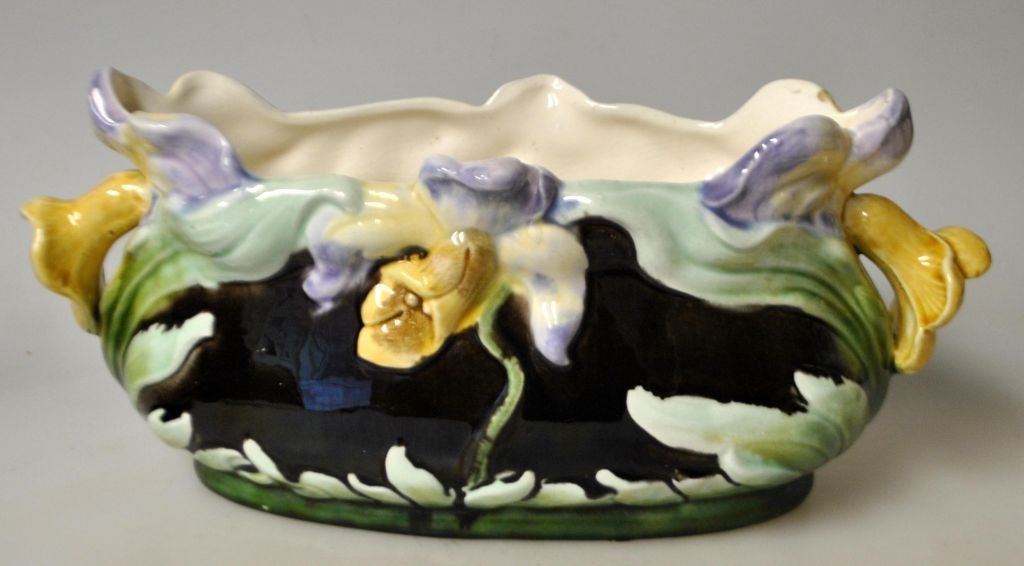 Majolika-Jardiniere, Deutschland, ca. 1900. Am Boden gestempelt: 5853. H: 12 cm. L: 27 cm.Einwandfreier Zustand!