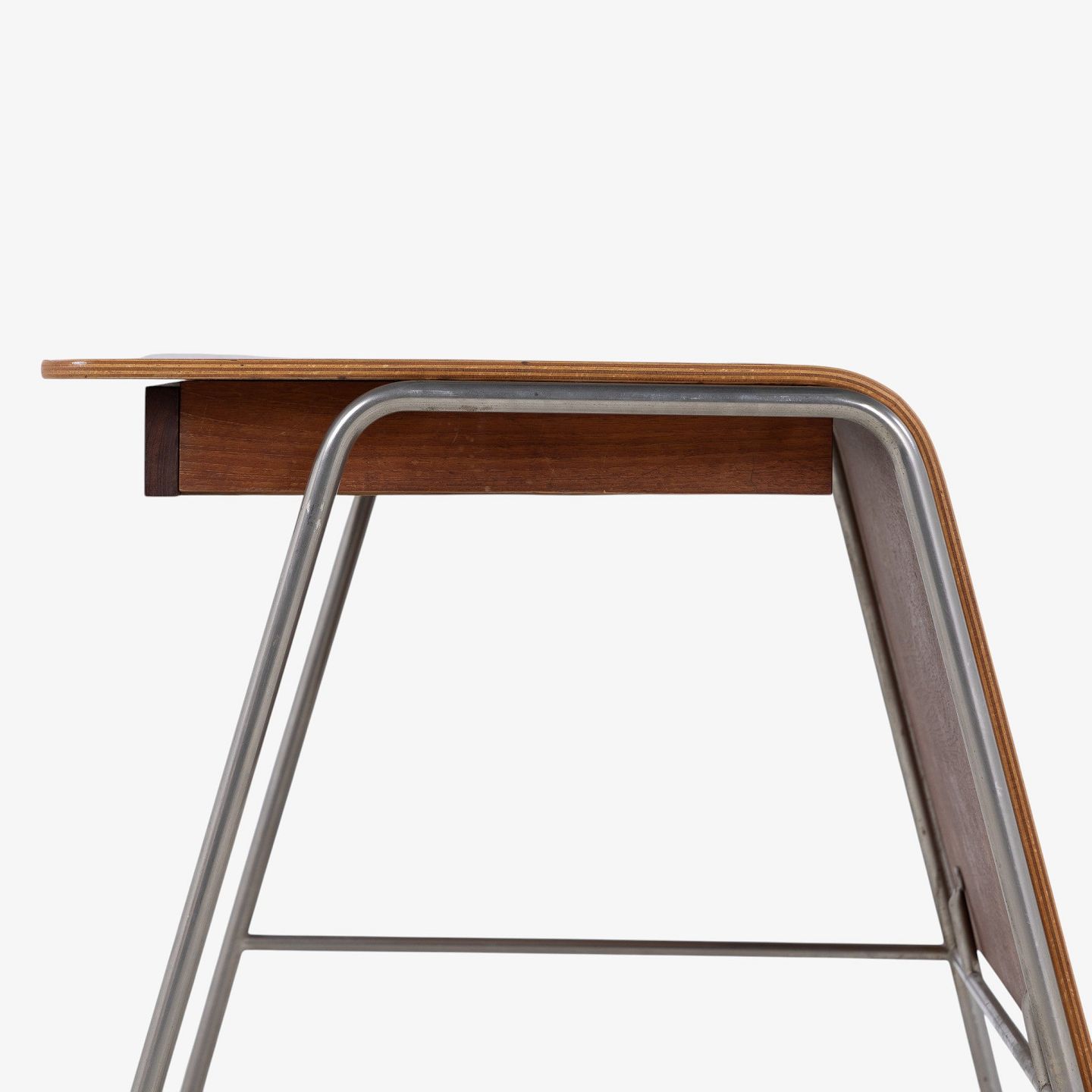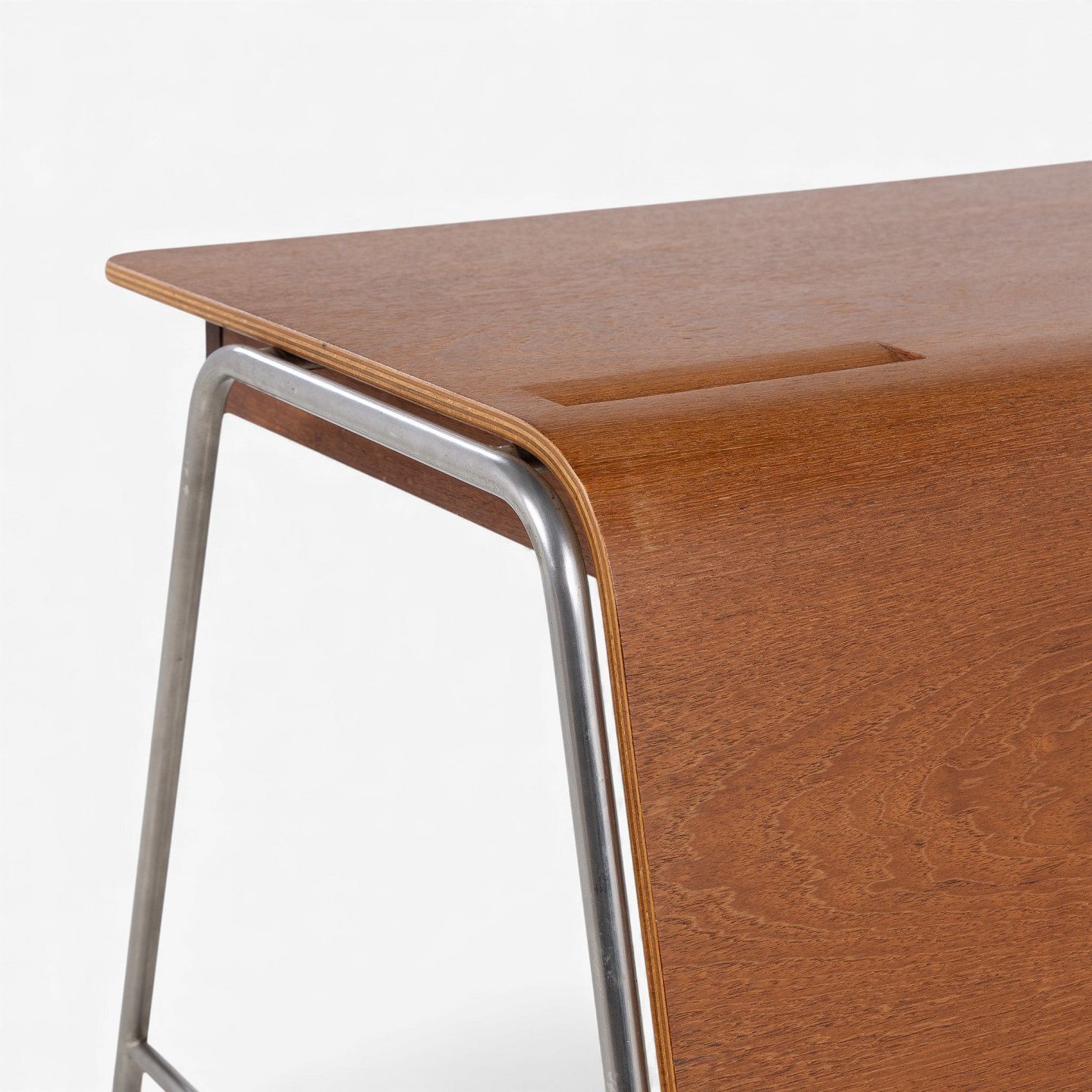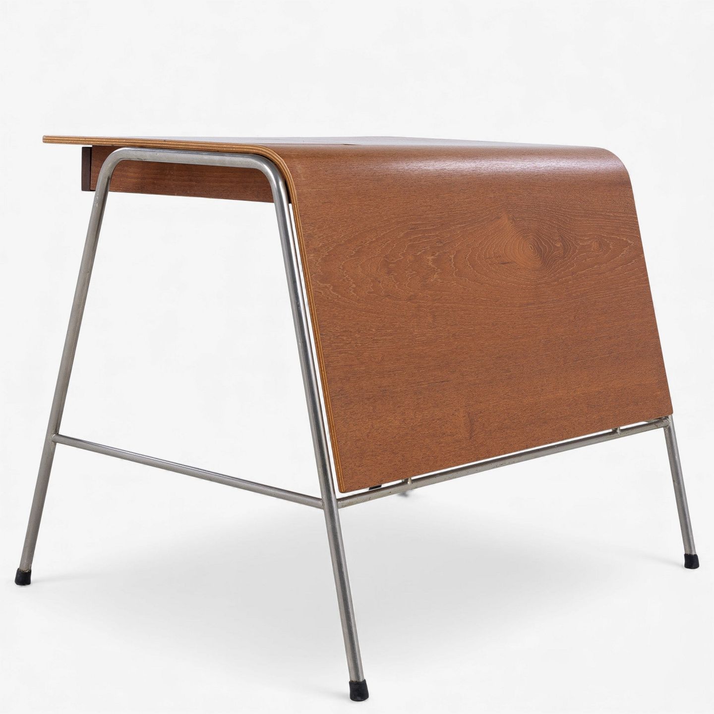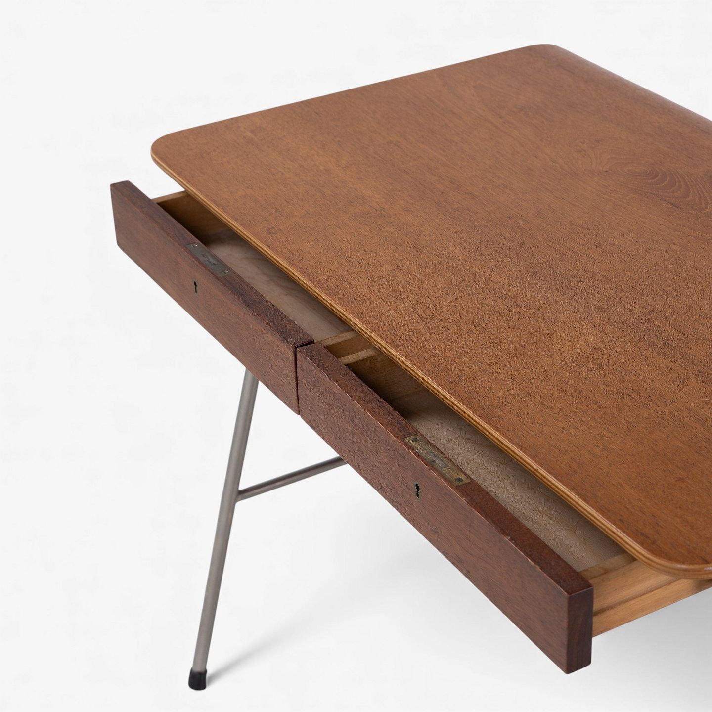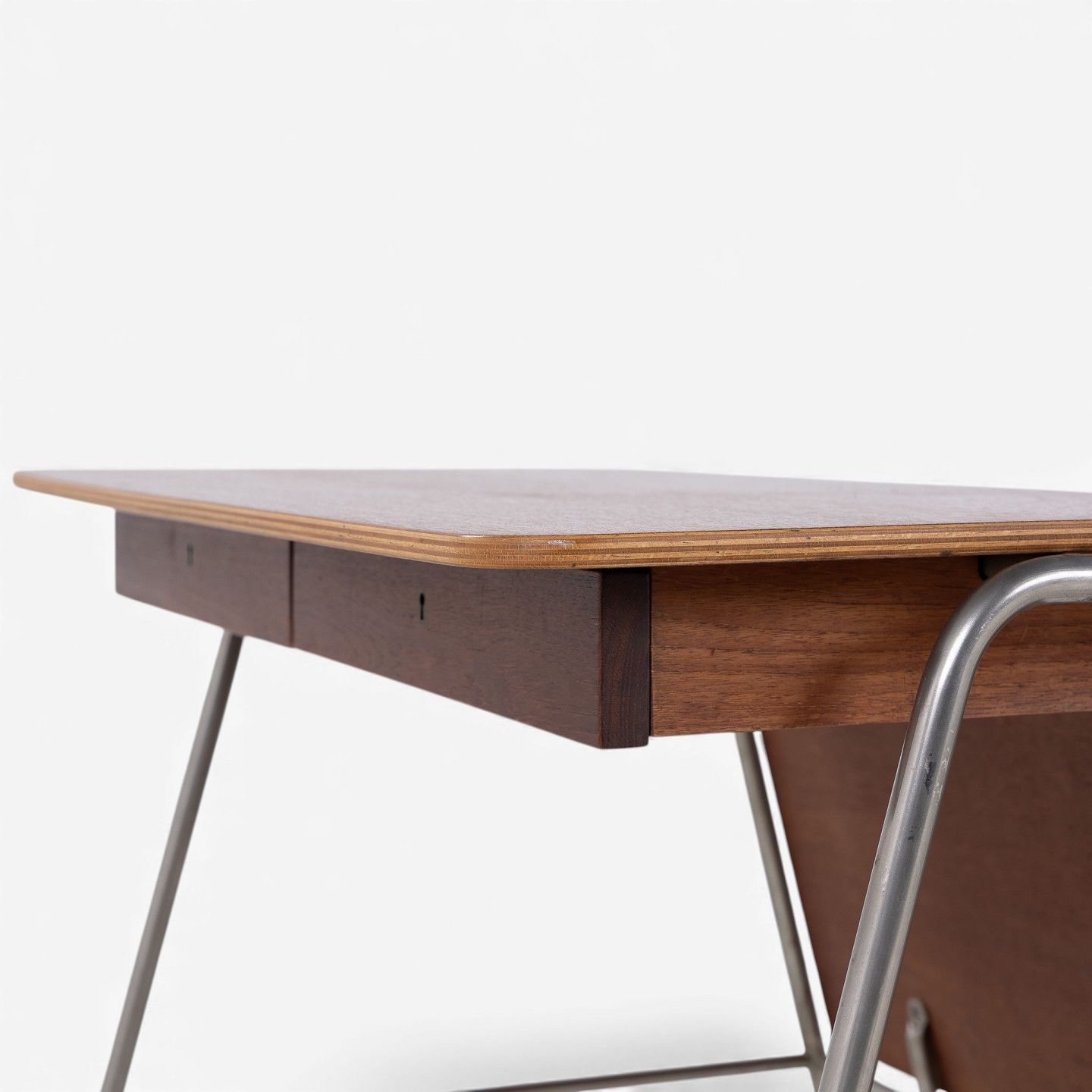 Arne Jacobsen / Fritz Hansen.'Munkegaard'-skrivebord/kateder i lamineret teak med to skuffer og stel i stål. Formgivet i 1955 til Munkegaardsskolen.