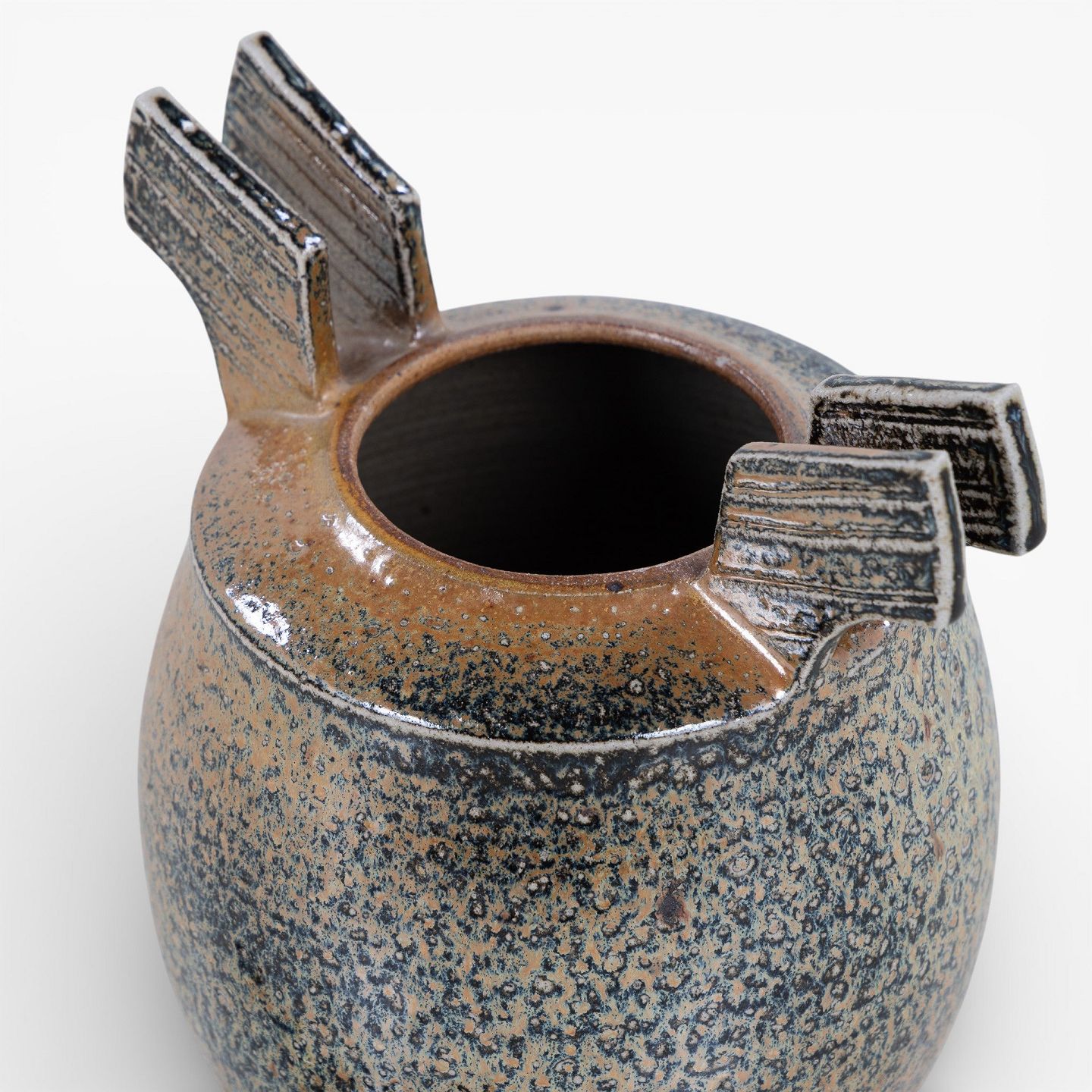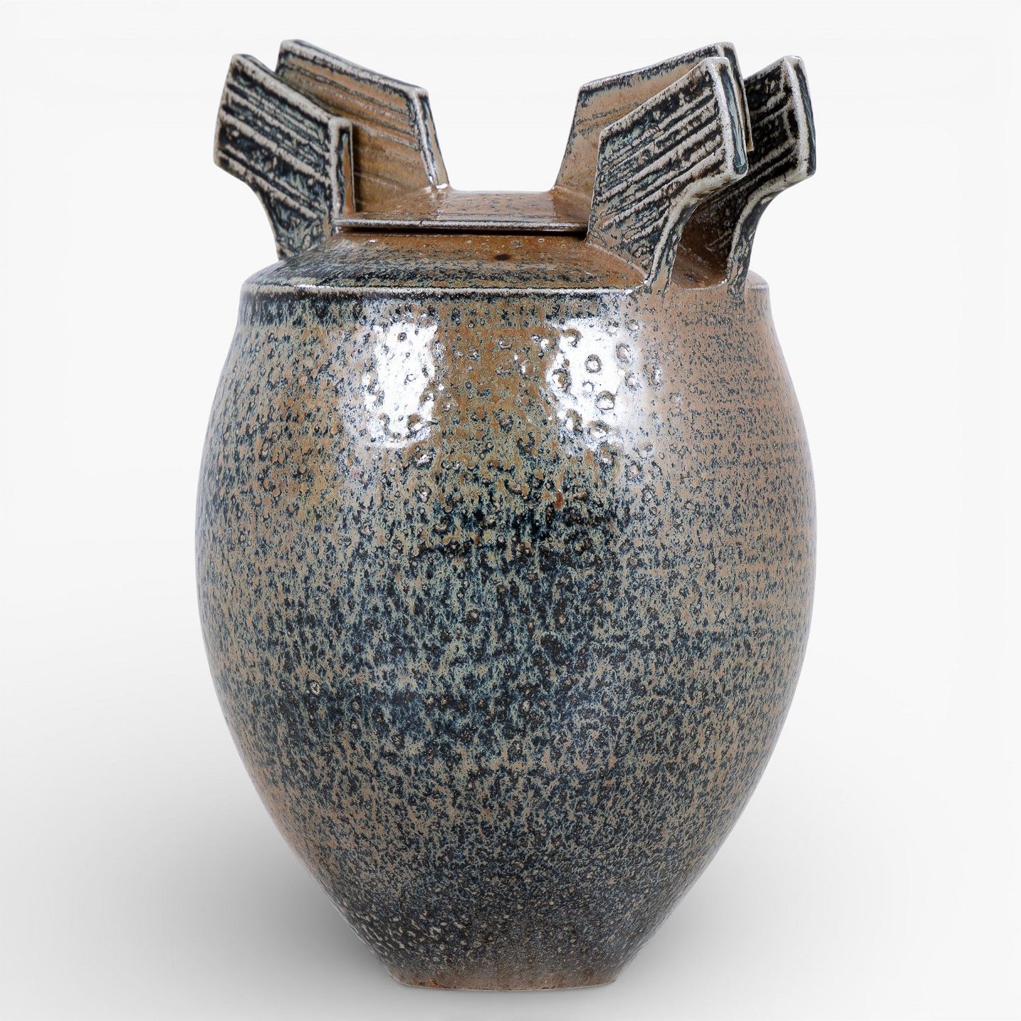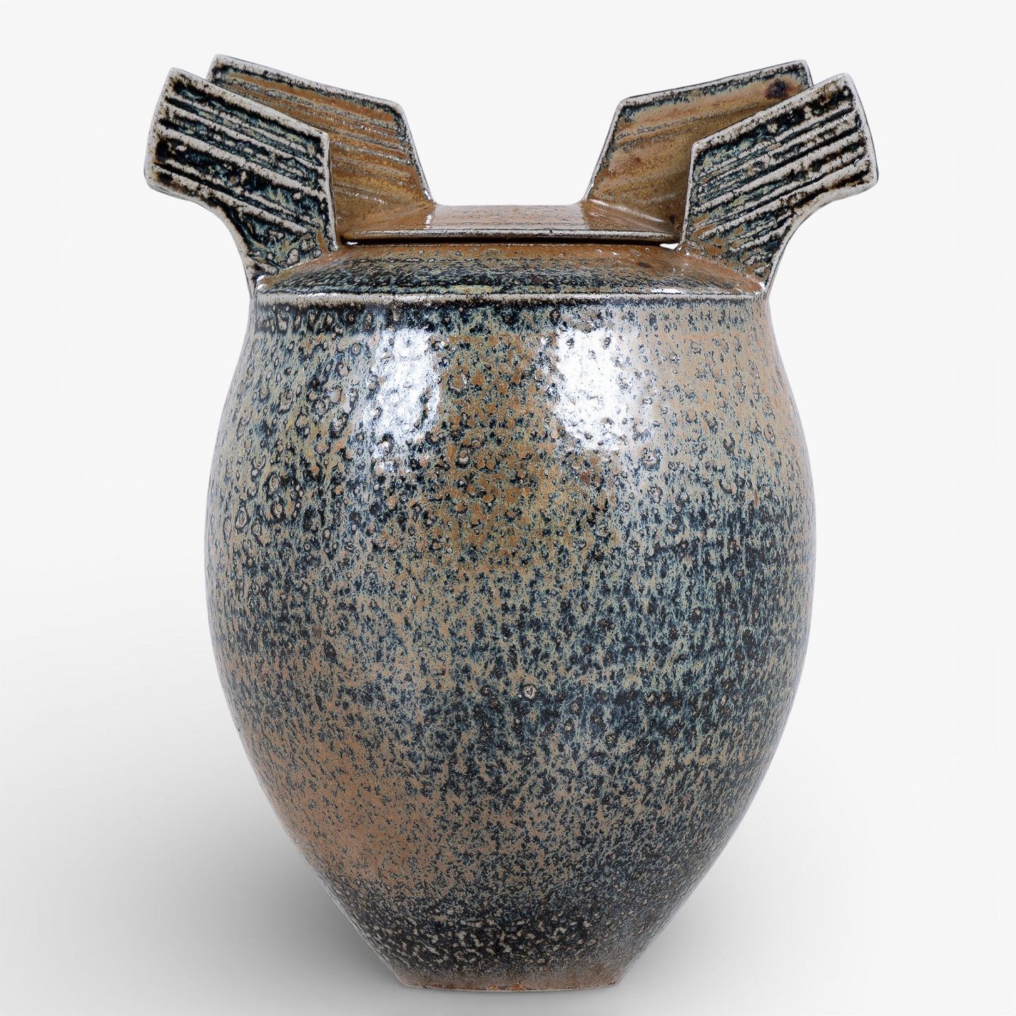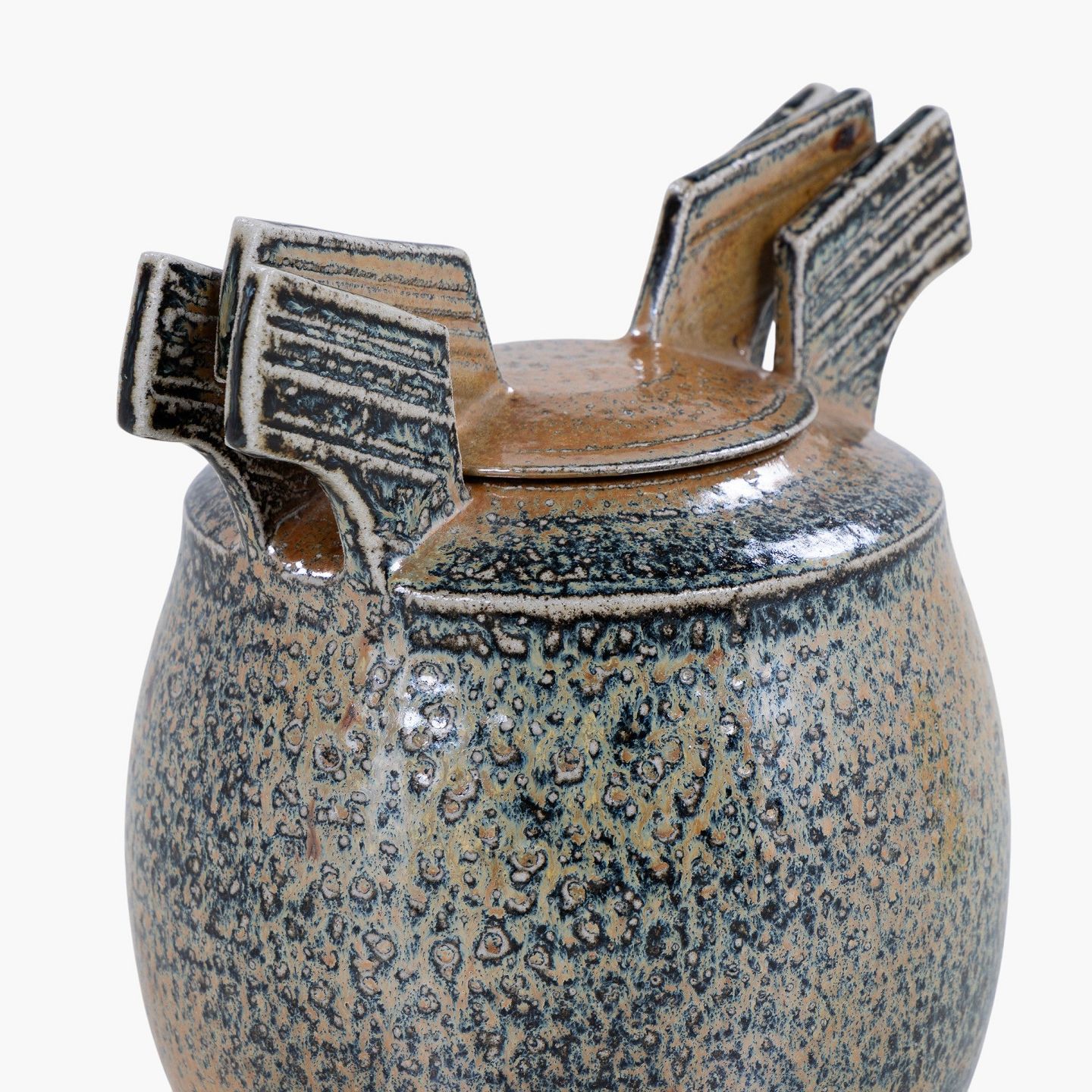 Aage Birck / Eget værksted.Unik lågkrukke i stentøj med brun saltglasur. Signeret 'Birck 85'.