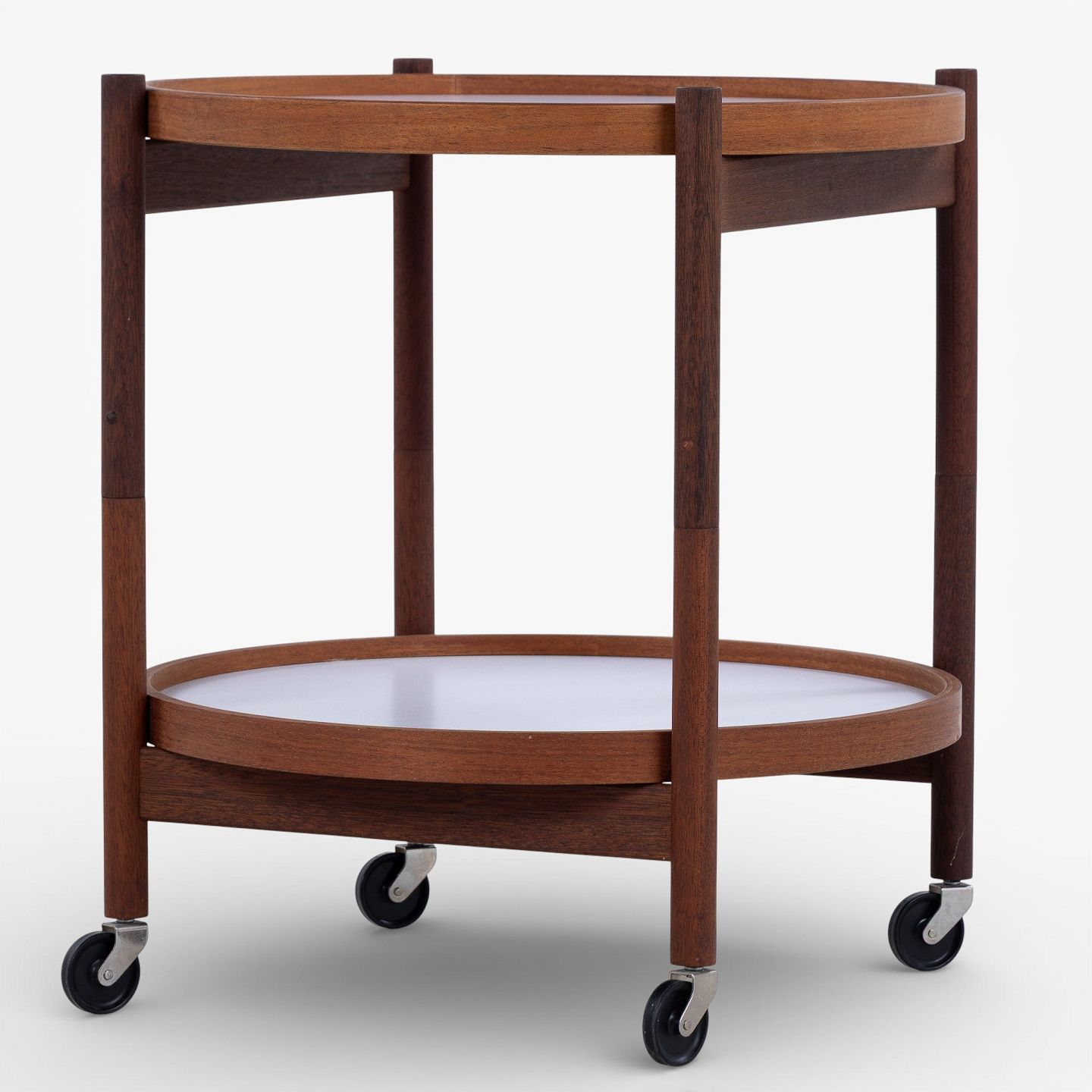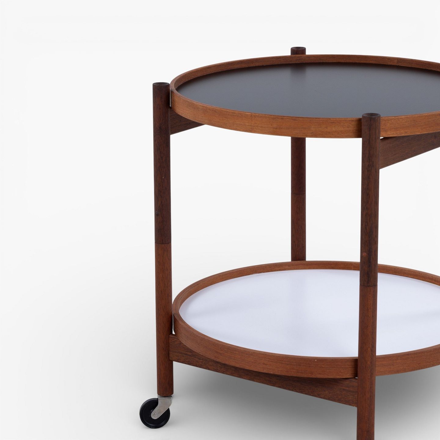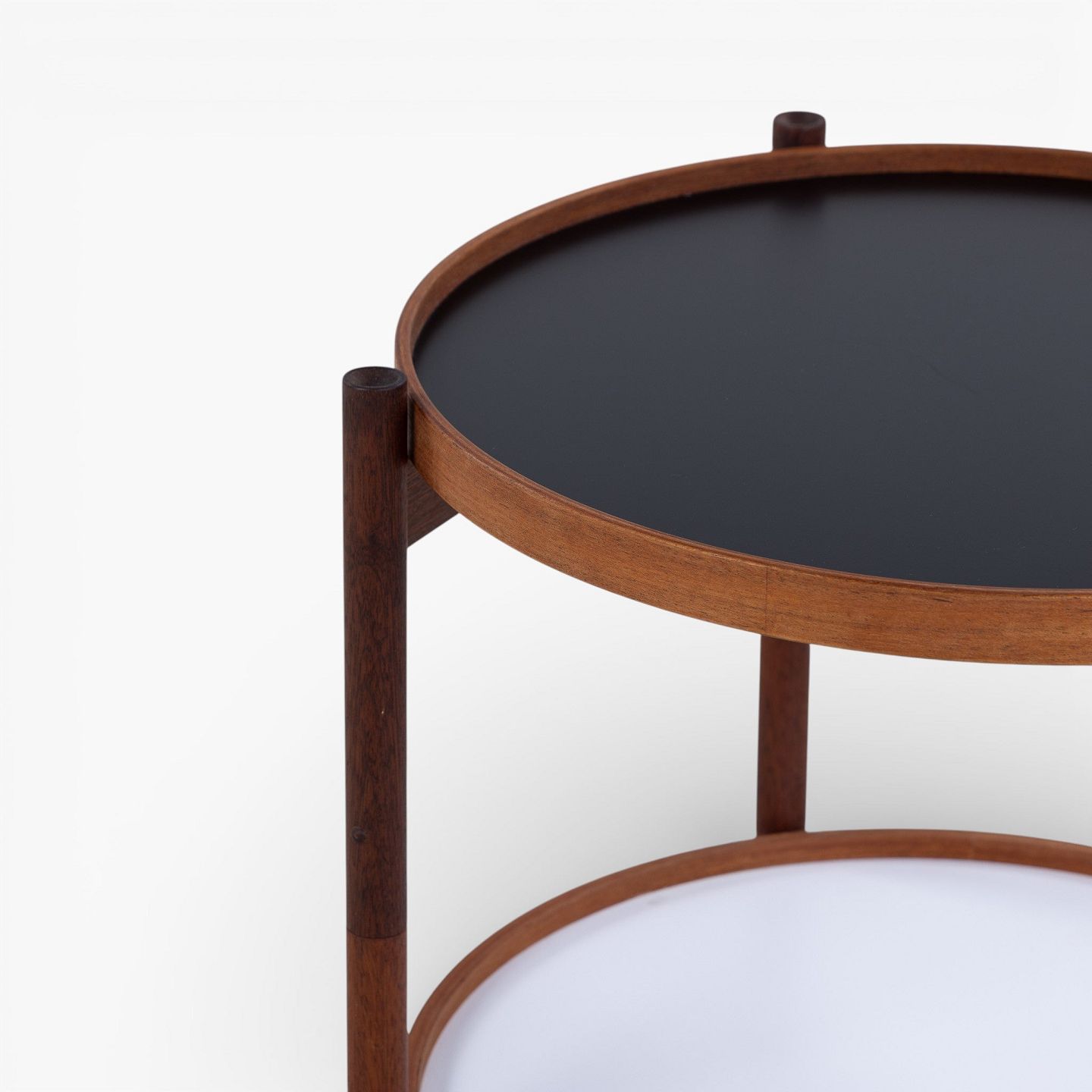 Hans Bølling / Brdr. Krüger.Bakkebord i teak med to vendbare bakker i sort og hvid formica. Mærket fra producent.