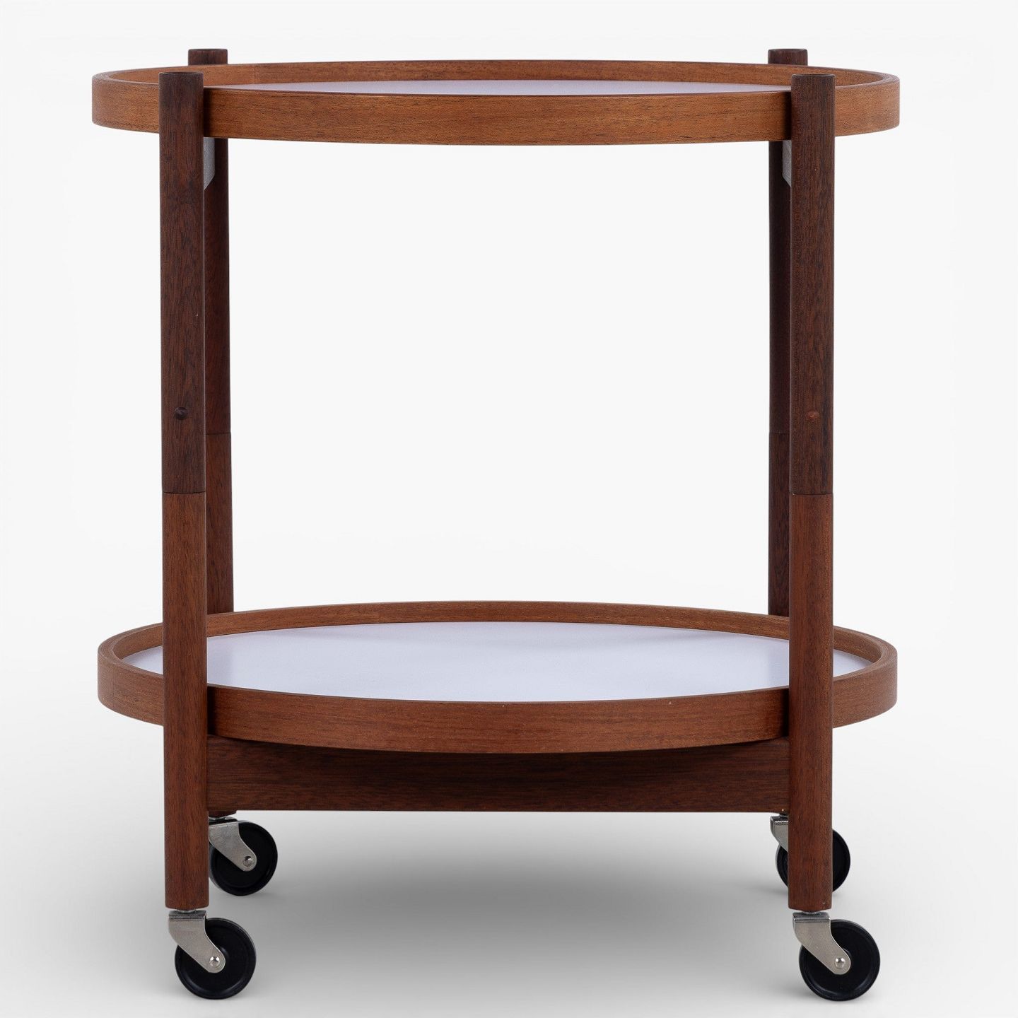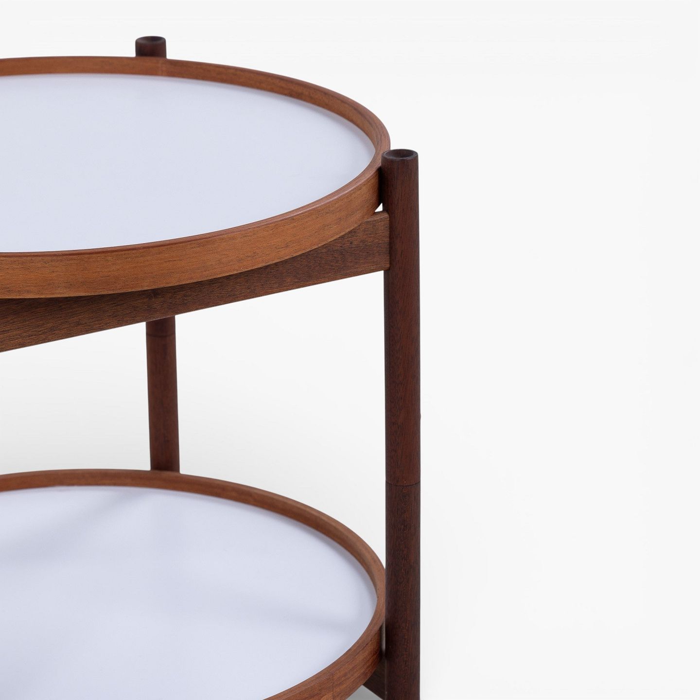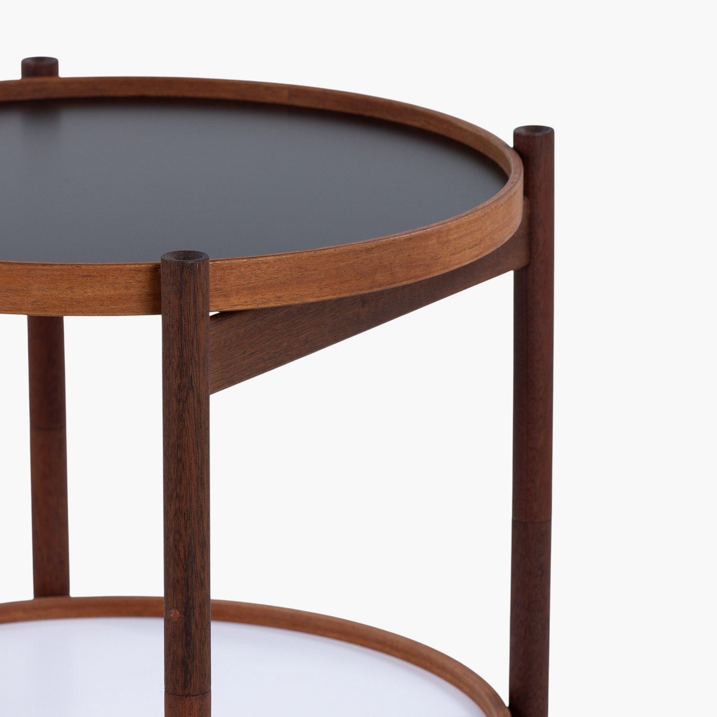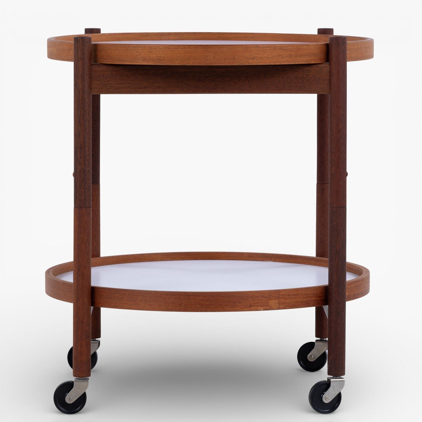 Hans Bølling / Brdr. Krüger.Bakkebord i teak med to vendbare bakker i sort og hvid formica. Mærket fra producent.