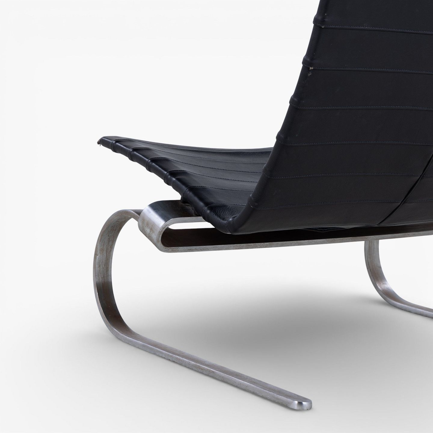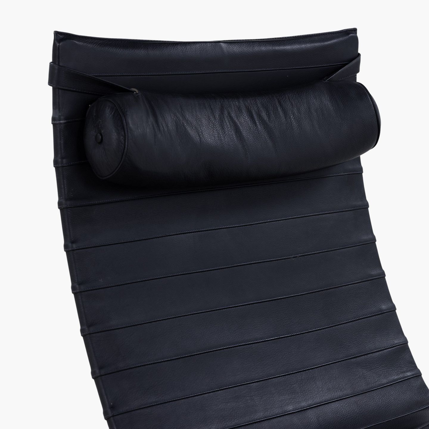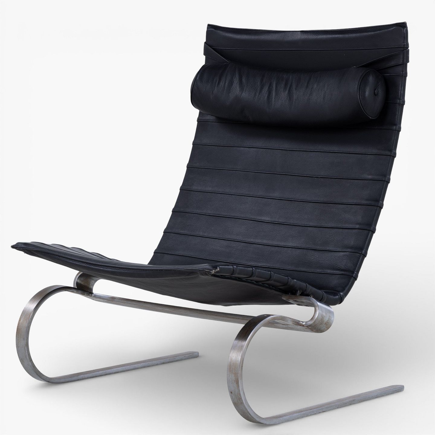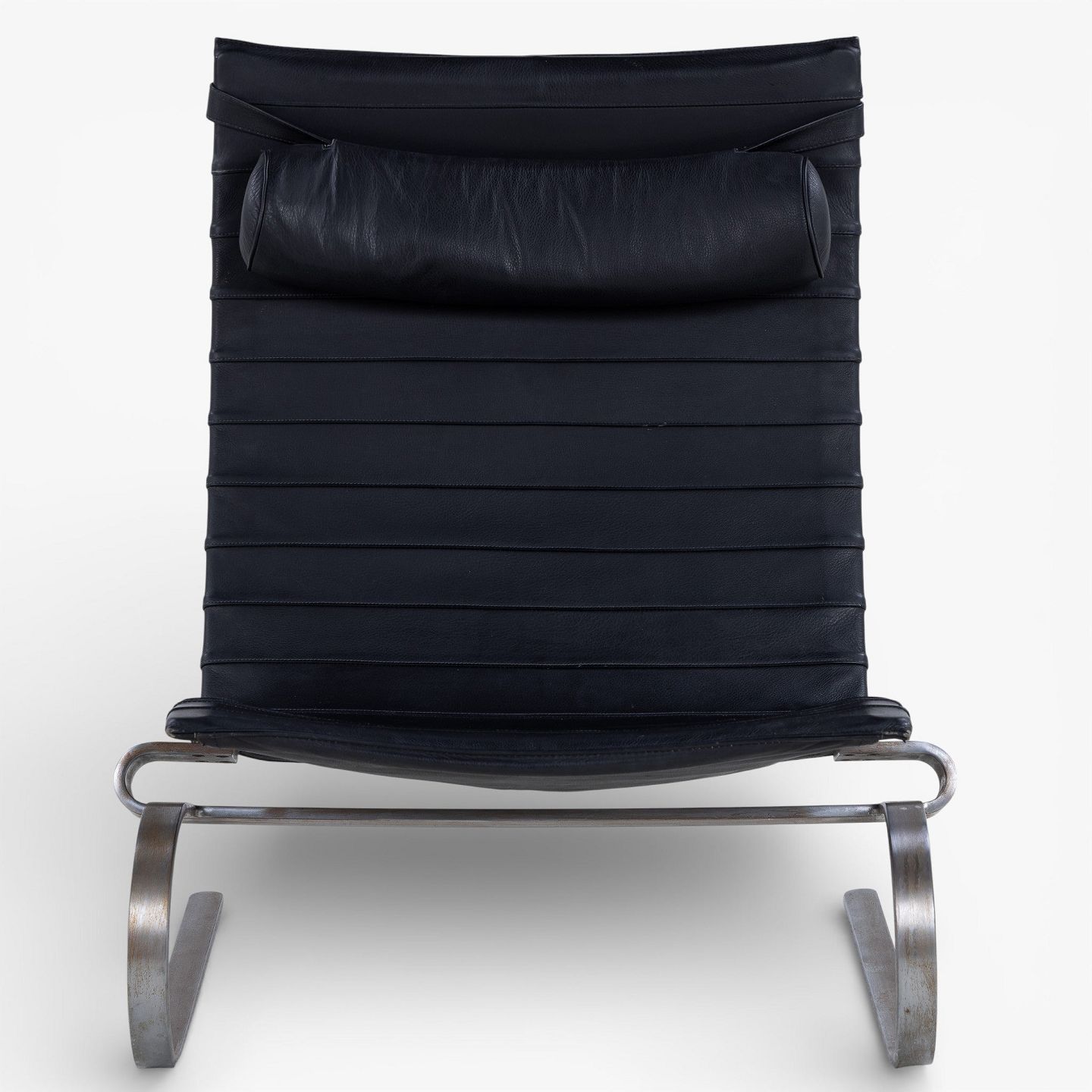 Poul Kjærholm / E. Kold ChristensenPK 20 - Lænestol i originalt sort læder med nakkehynde og stel af fjederstål. Formgivet i 1968.