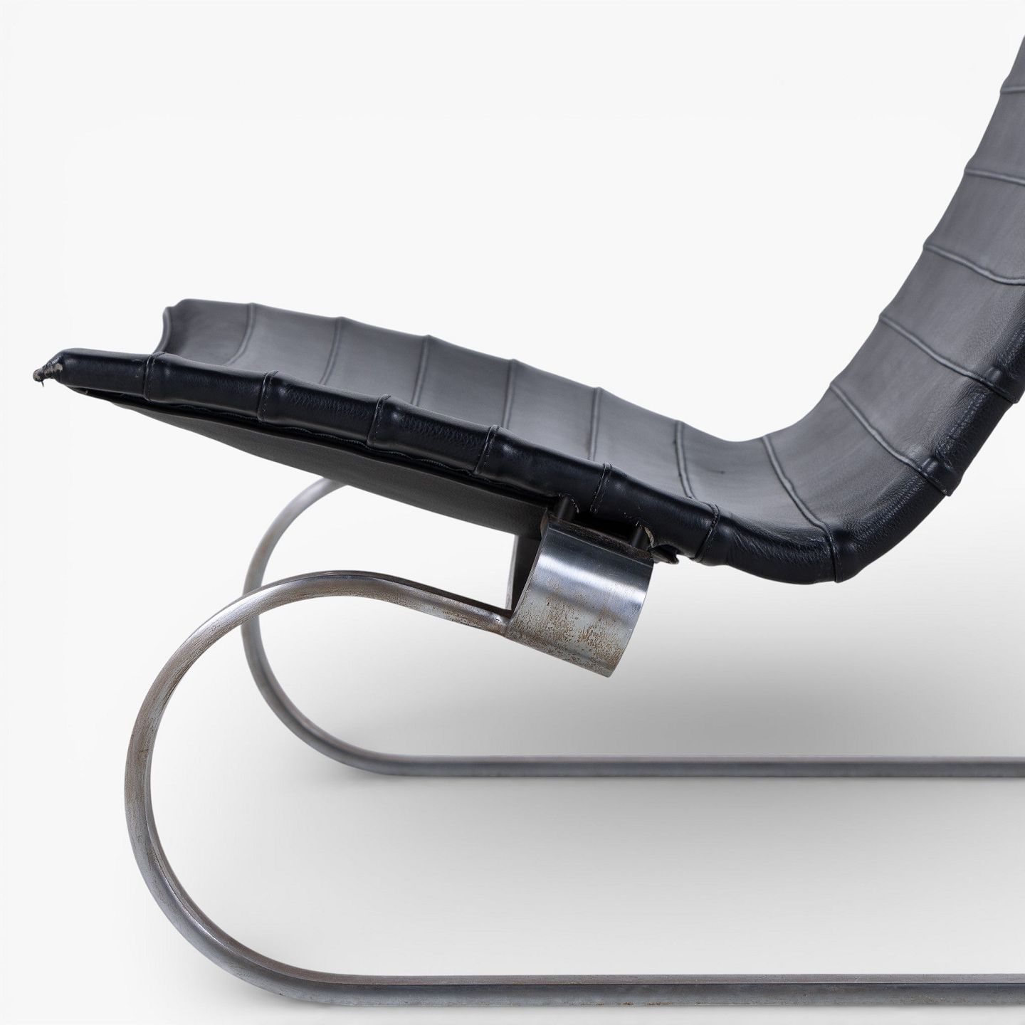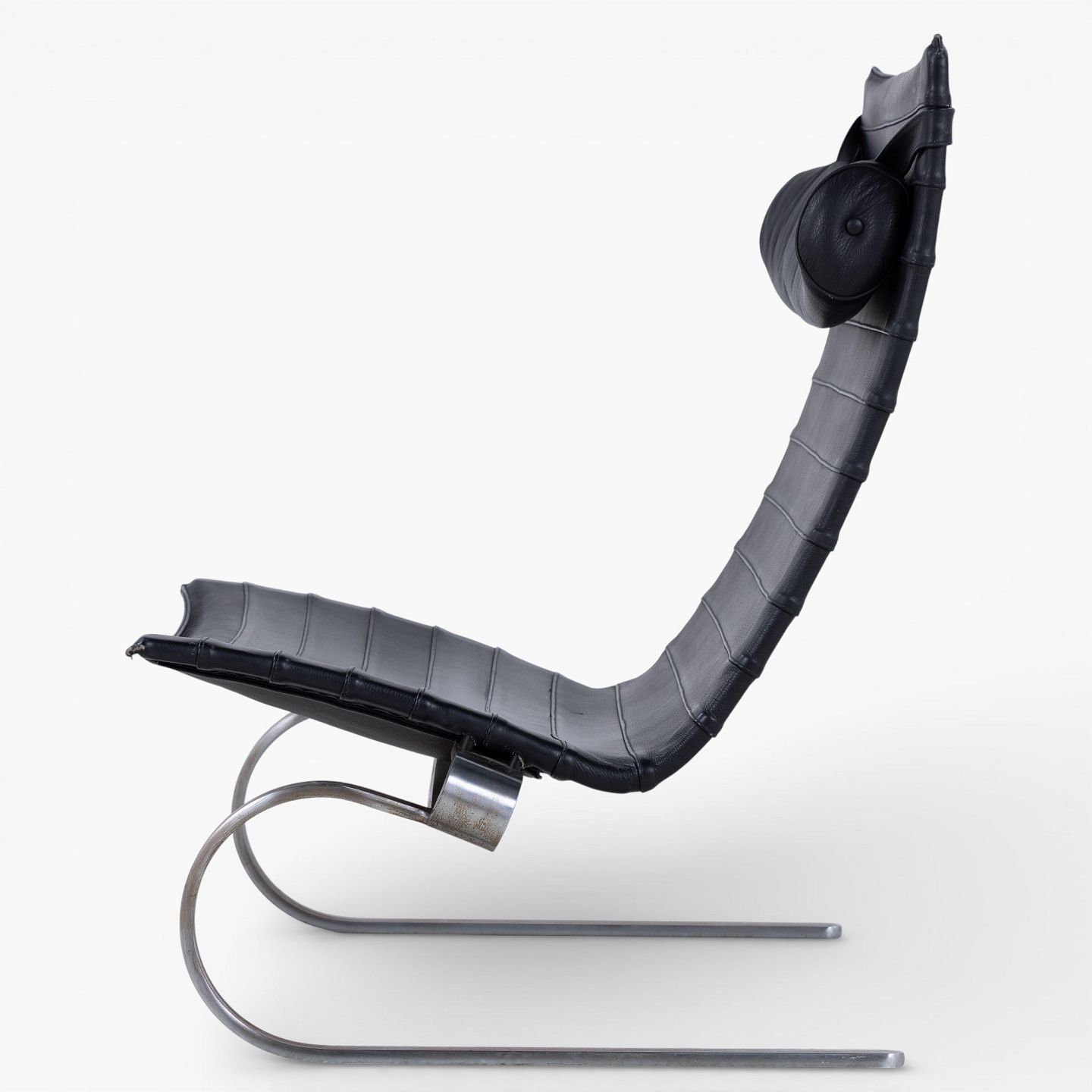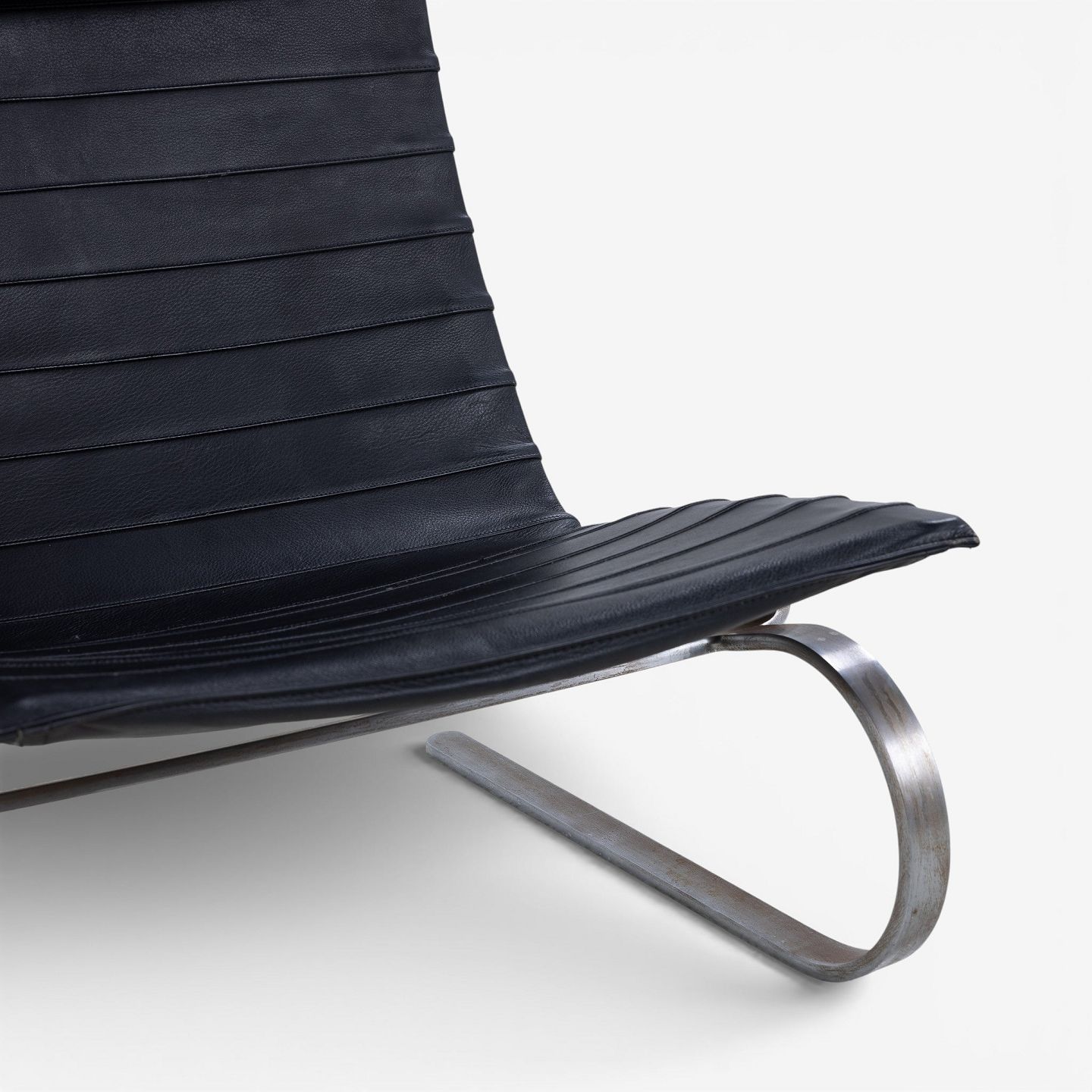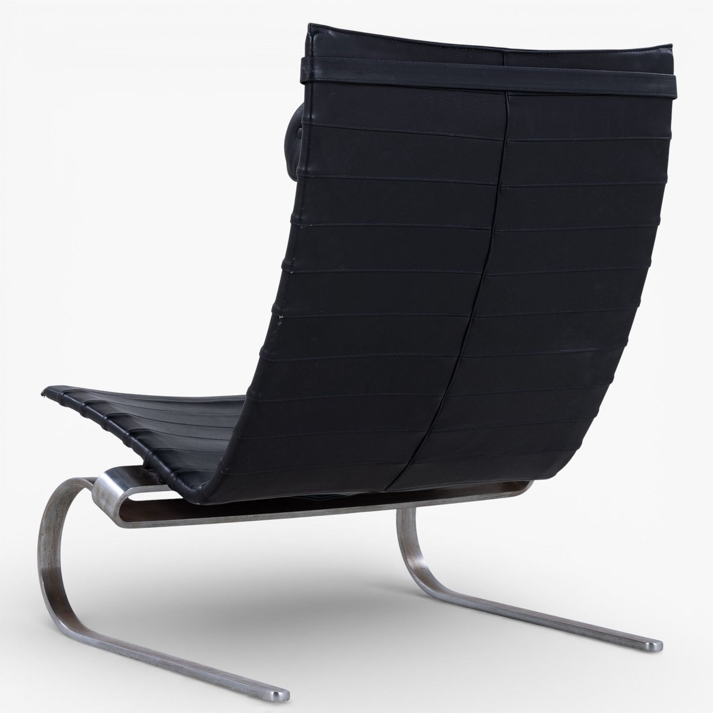 Poul Kjærholm / E. Kold ChristensenPK 20 - Lænestol i originalt sort læder med nakkehynde og stel af fjederstål. Formgivet i 1968.