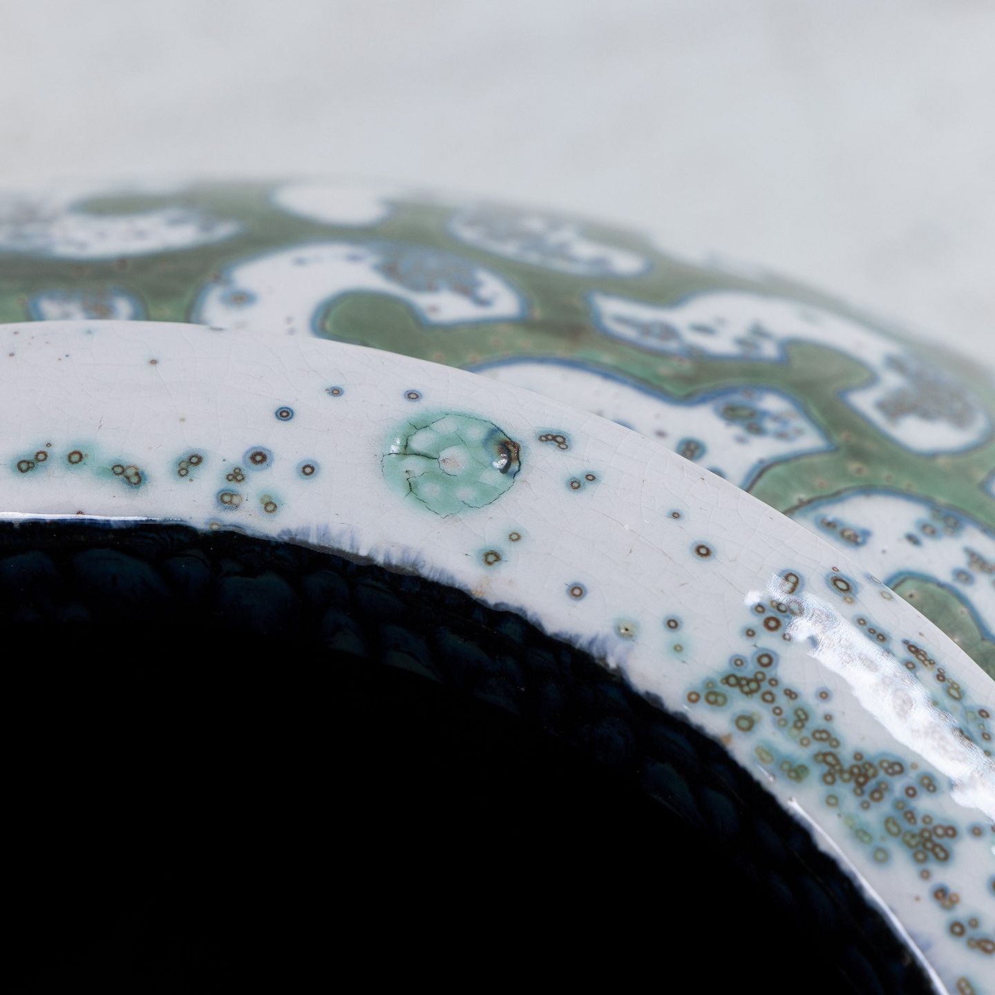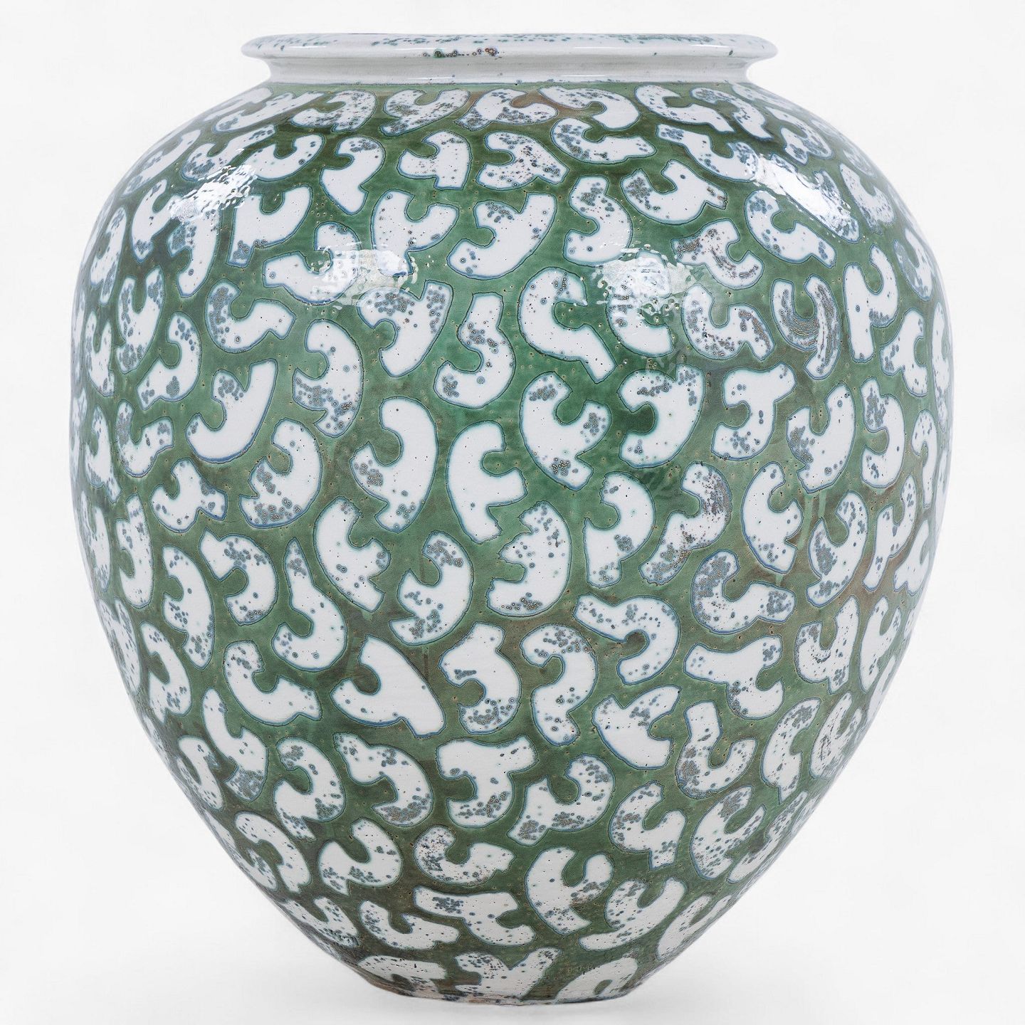 Per Weiss / Eget værksted.Kolossal krukke i stentøj med grøn glasur og hvide stafferinger. Signeret.