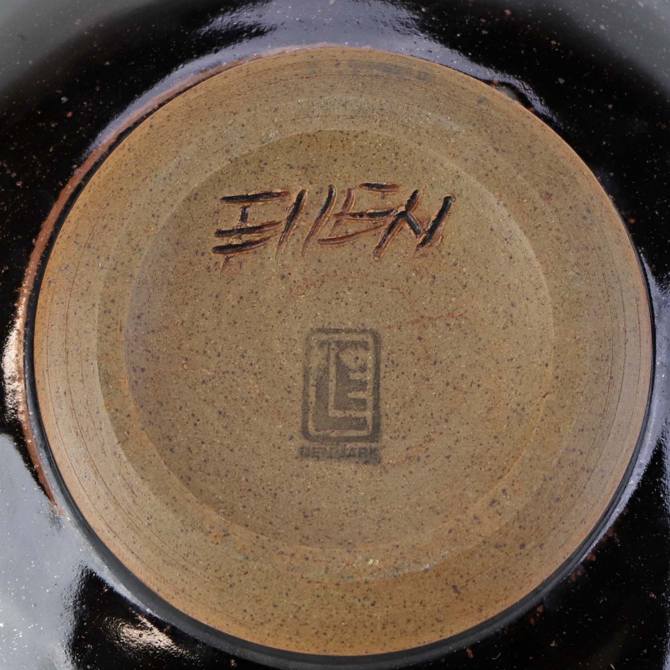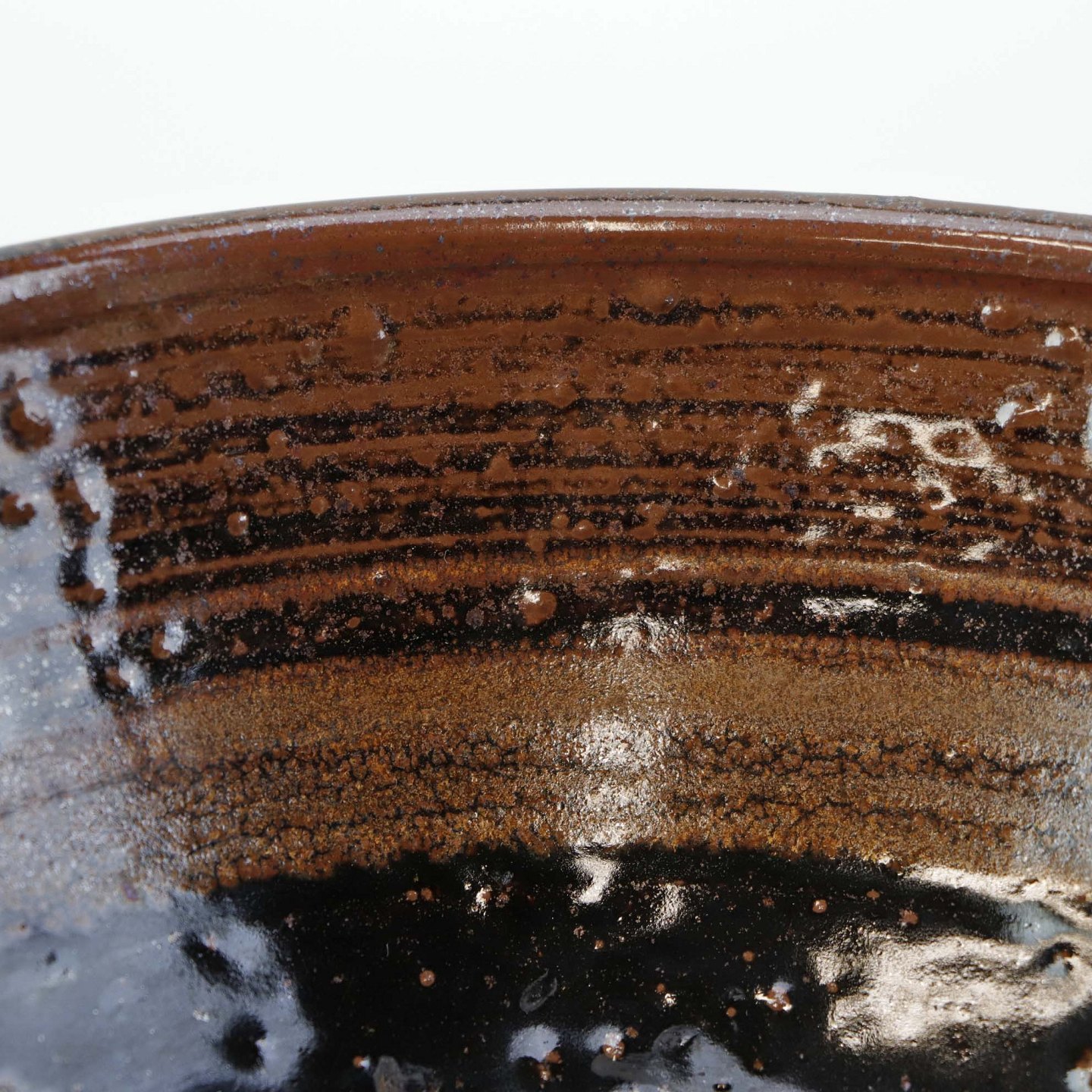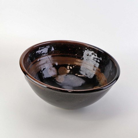Skål i stentøj med delvist nubret glasur i brunlige nuancer og cirkelformet mønster i bunden. Formgiver Ellen Madsen og Ole Bøgild (1901-1987)