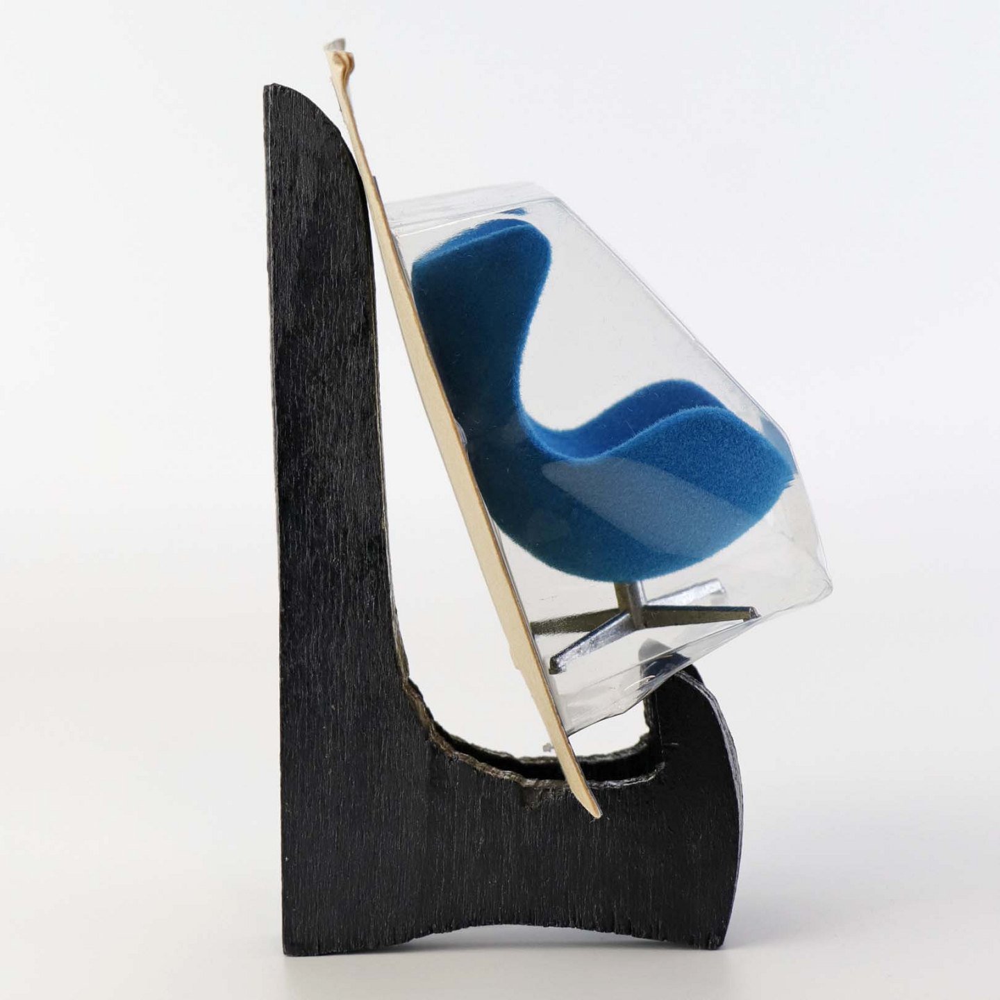 Blå miniature stol til dukkehus med model af Arne Jacobsen's lænestol Ægget. Model 31840/30Design Arne Jacobsen