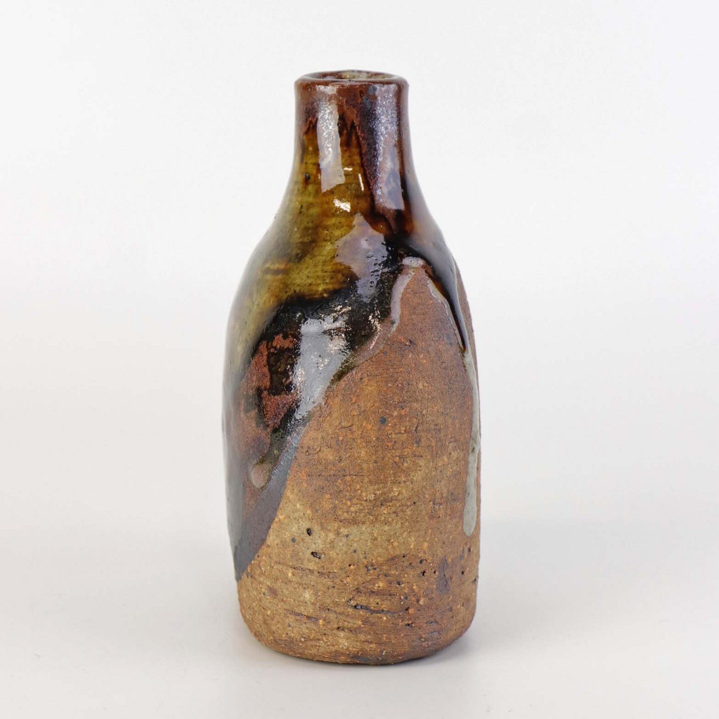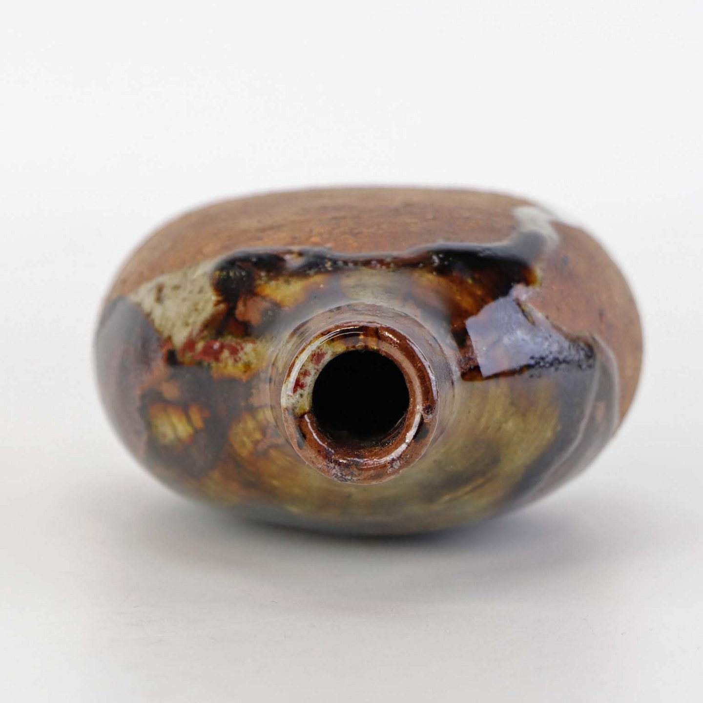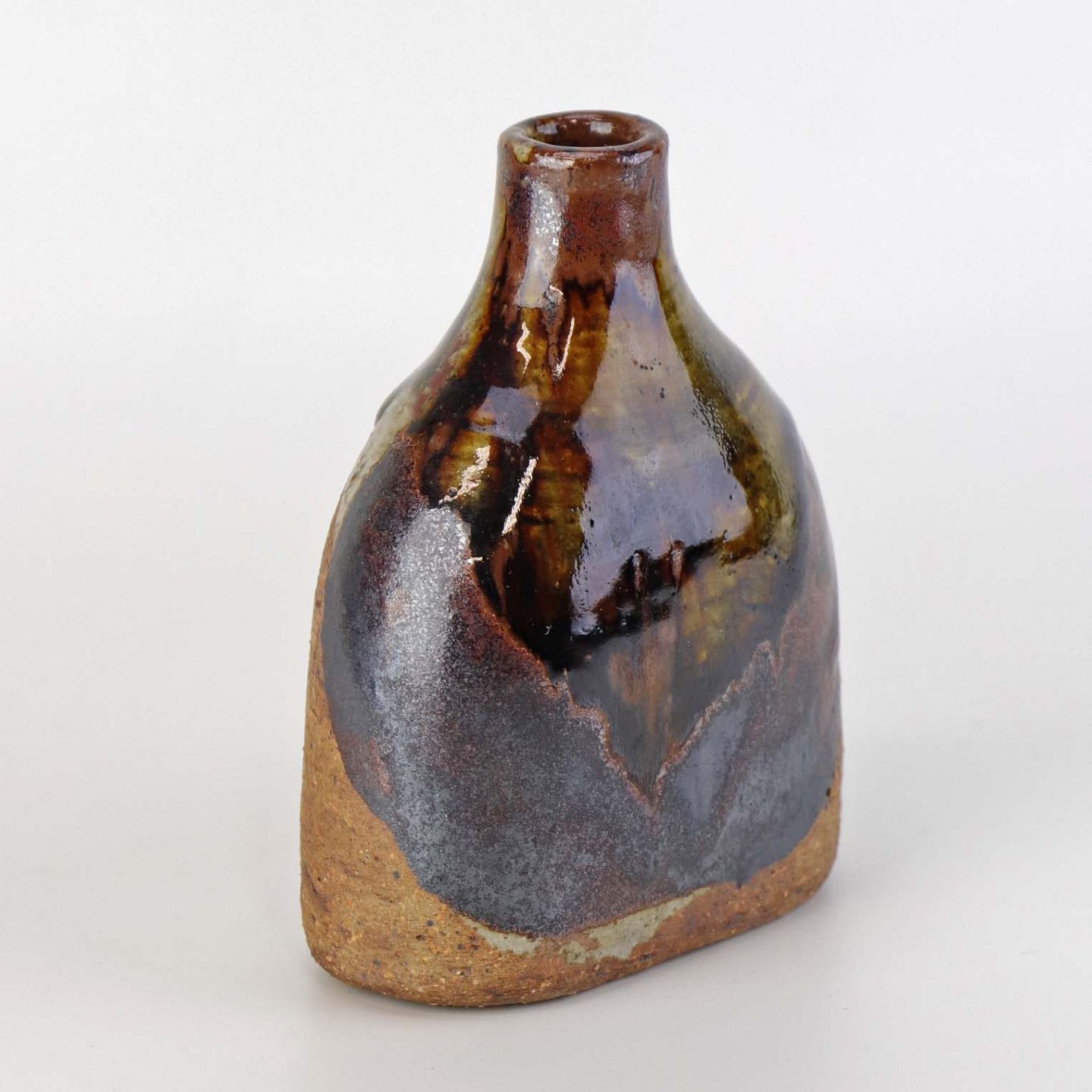 Lille flaskeformet vase i keramik med flerfarvet glansfuld og mat glasur.Formgiver Conny Walther