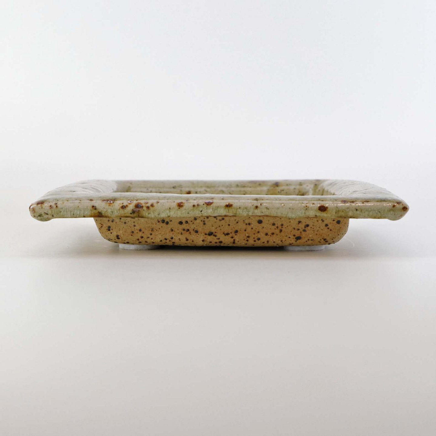Firkantet fad i keramik med struktureret bund med lyseblå og beige glasur med røde pigmenter.Formgiver Conny Walther