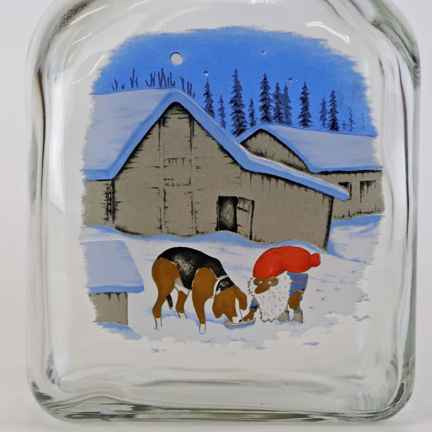 Dramflaske i glas med julemotiv af Nisse, hund og ræv efter tegning af Harald Wibergs. Snapseflasken kommer med korkprop.Producent Holmegaard