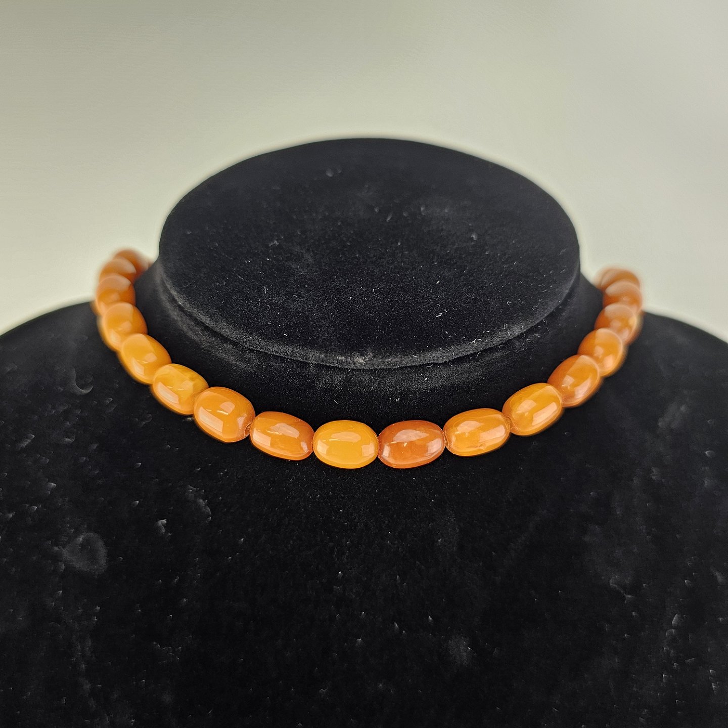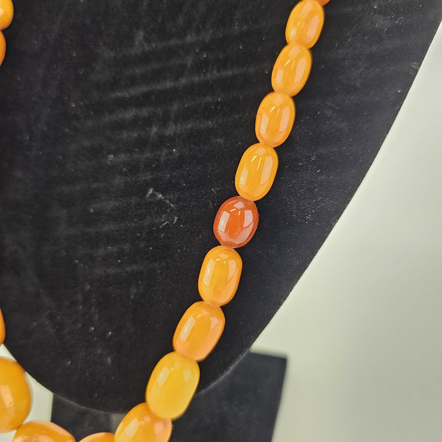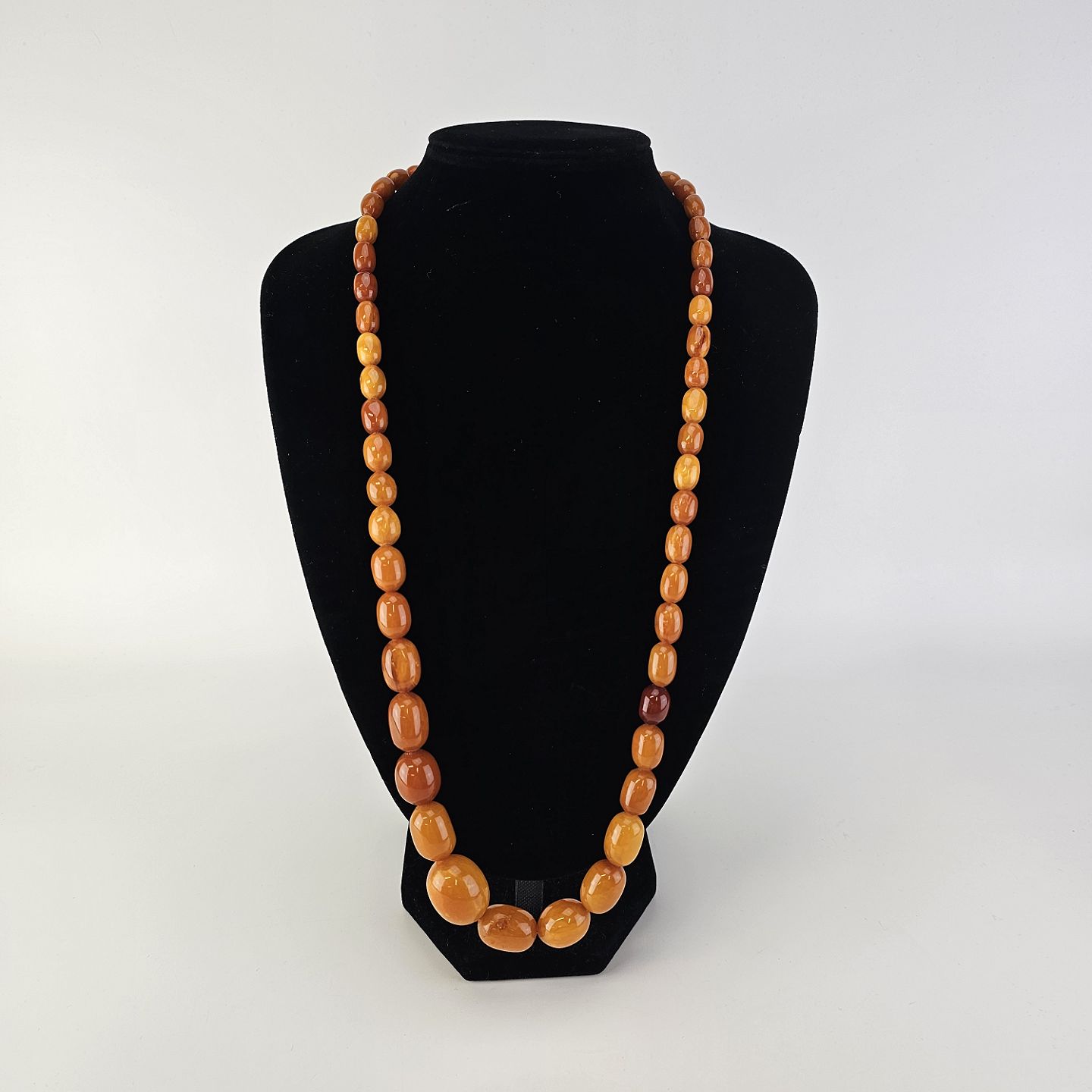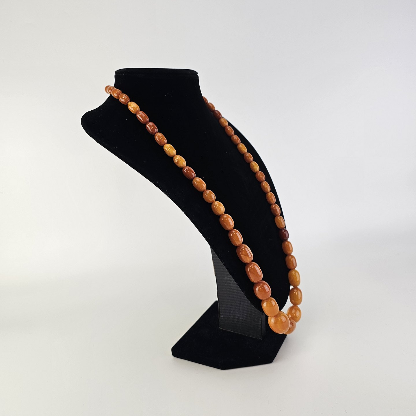 Halskæde med perler af glatslebet rav i varierende størrelse på snor, i alt 54 stykker ravProducent ukendt
