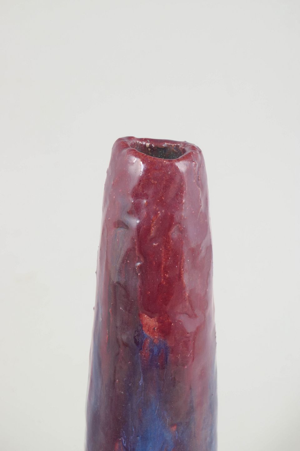 Høj og slank vase udført i stentøj med levende, flerlaget glasur i rødlige og blålige nuancer med tydelige lodrette løb. Overfladen har et dynamisk og ekspressivt præg, hvor glasurens bevægelse spiller en central rolle. Den stramme, opretstående form understreger det skulpturelle udtryk.
