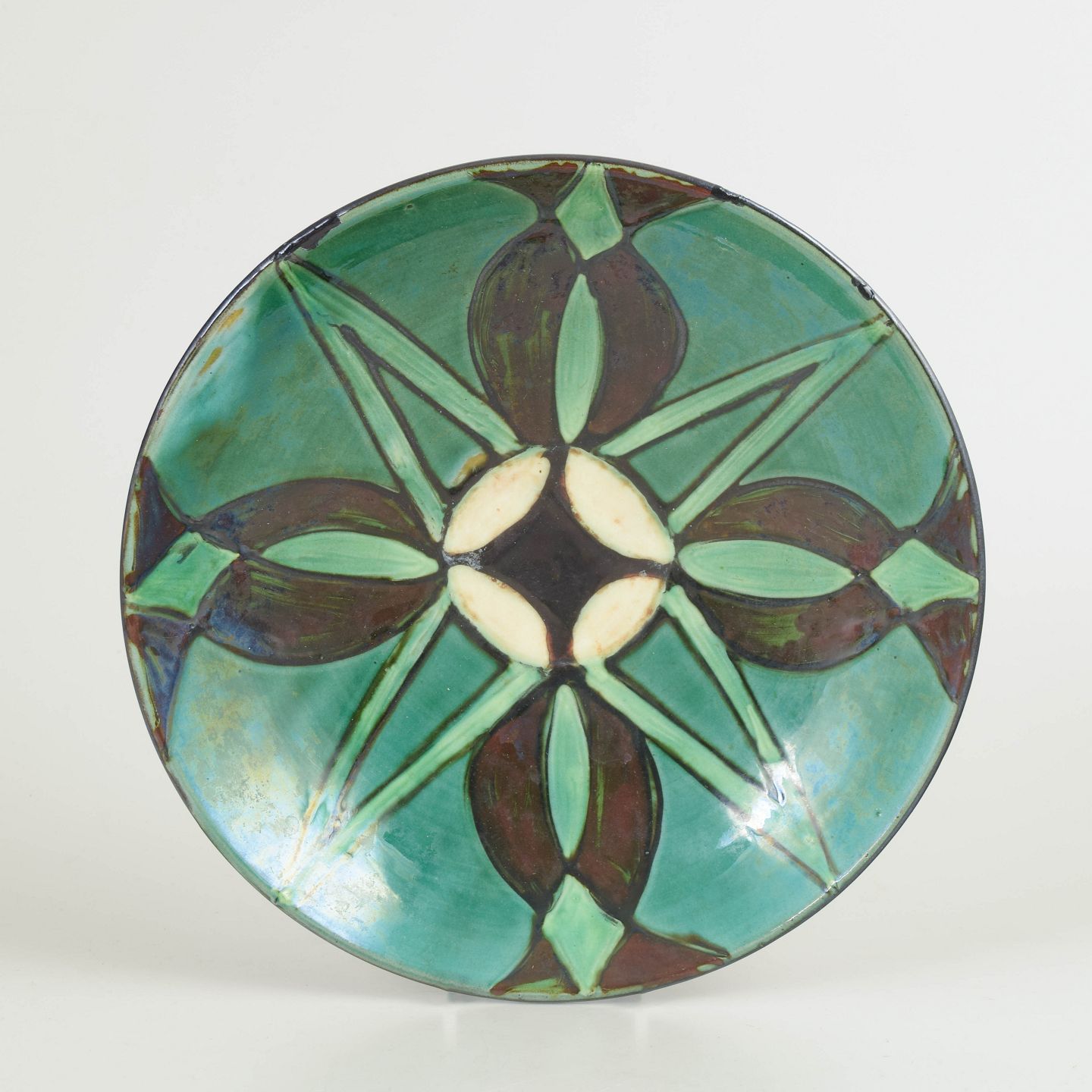 Kähler skål, 1930’erne.Håndglaseret skål i keramik med geometrisk dekoration i grønne og brune nuancer. Klassisk Art Deco-udtryk med tydelig værkstedsmæssig karakter, udført med levende glasur og håndmalede detaljer.