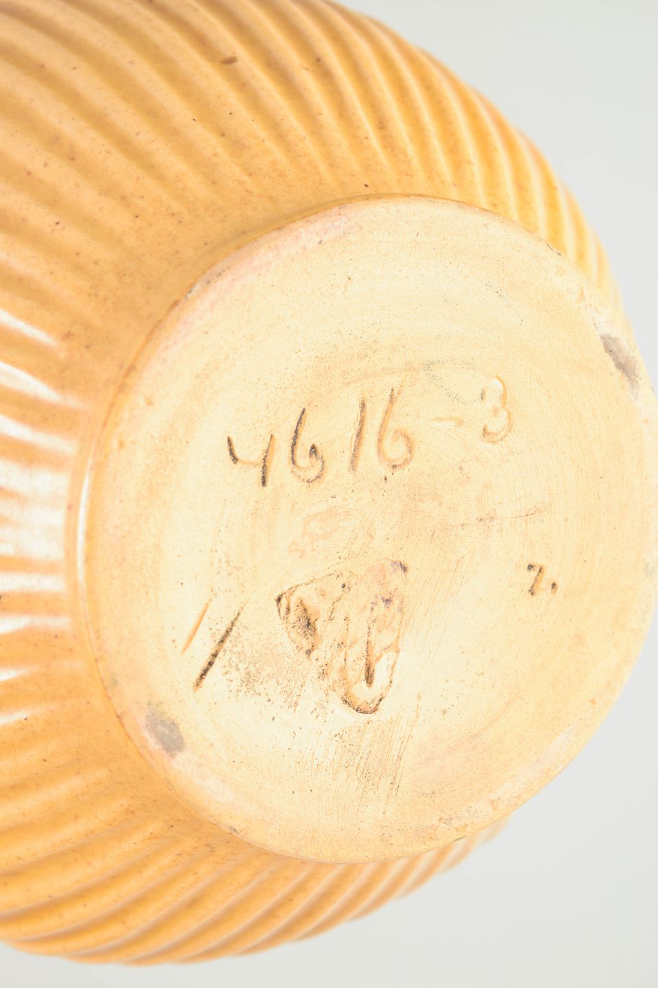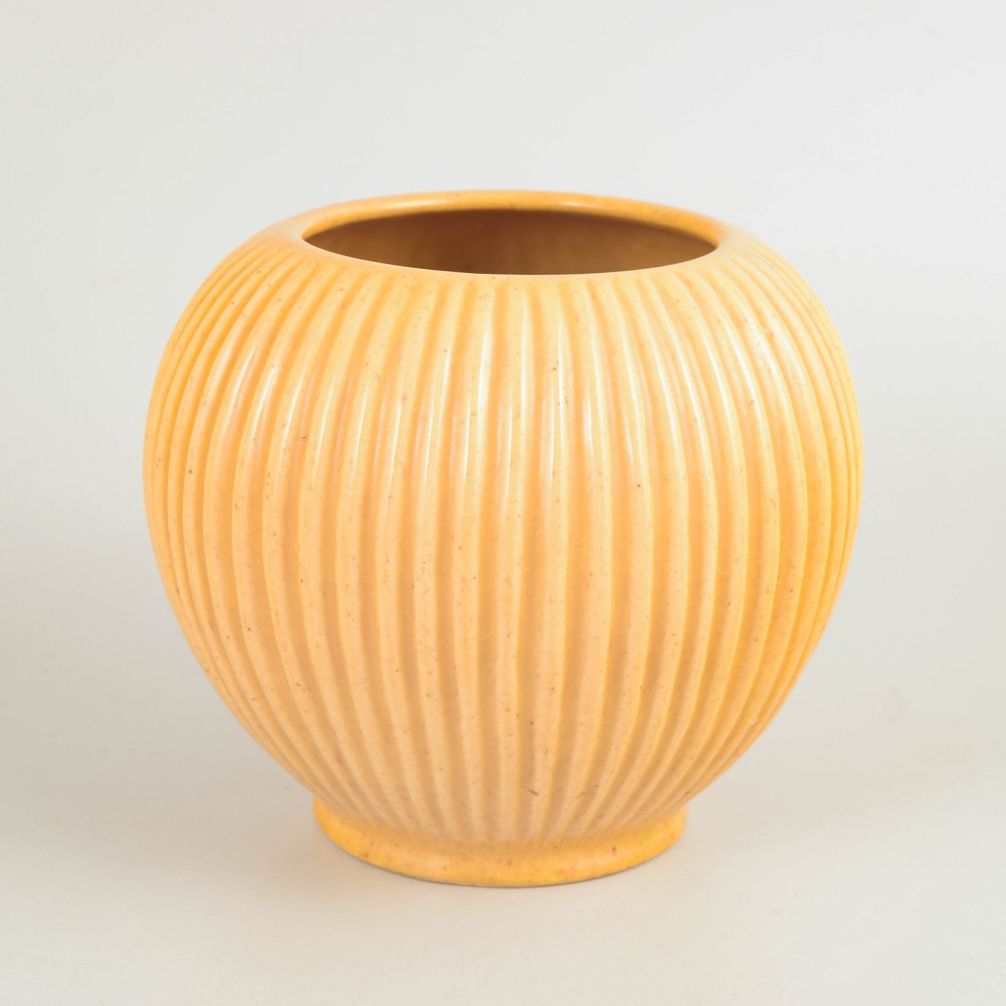 Skandinavisk studiokeramiker vase, 1940’erne, Art Deco.Skulpturel vase i drejet stentøj med markant lodret riflet korpus og afrundet, balusterformet silhuet. Den matte okker- til sandfarvede glasur understreger formens stringente, geometriske udtryk, karakteristisk for nordisk Art Deco og tidlig modernisme. Modellen er markeret 4616-3.